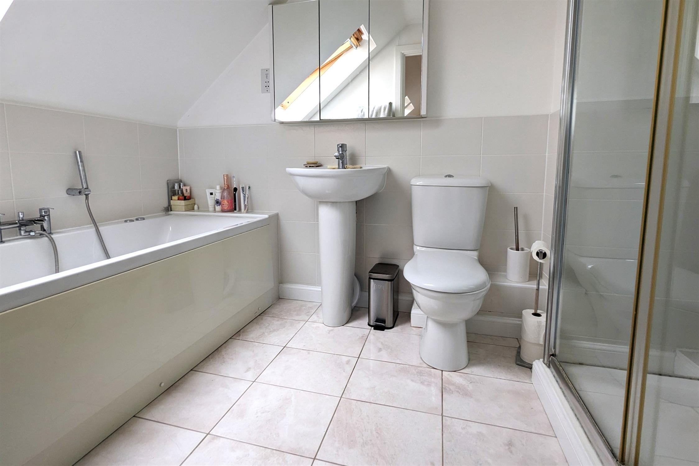 EN-SUITE TO MASTER: Modern white WC, wash hand basin, bath and shower cubicle.