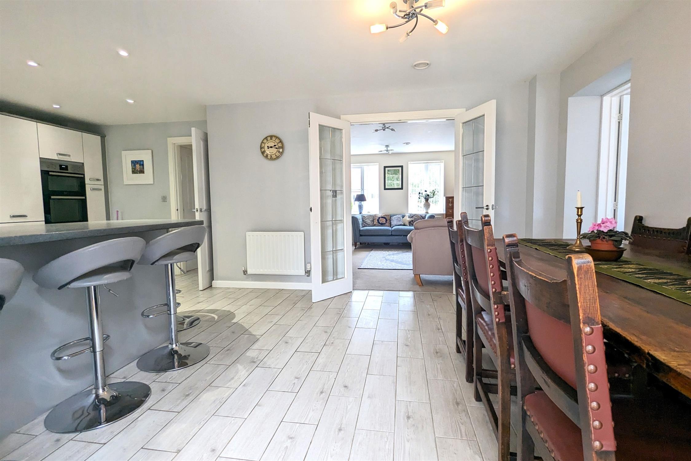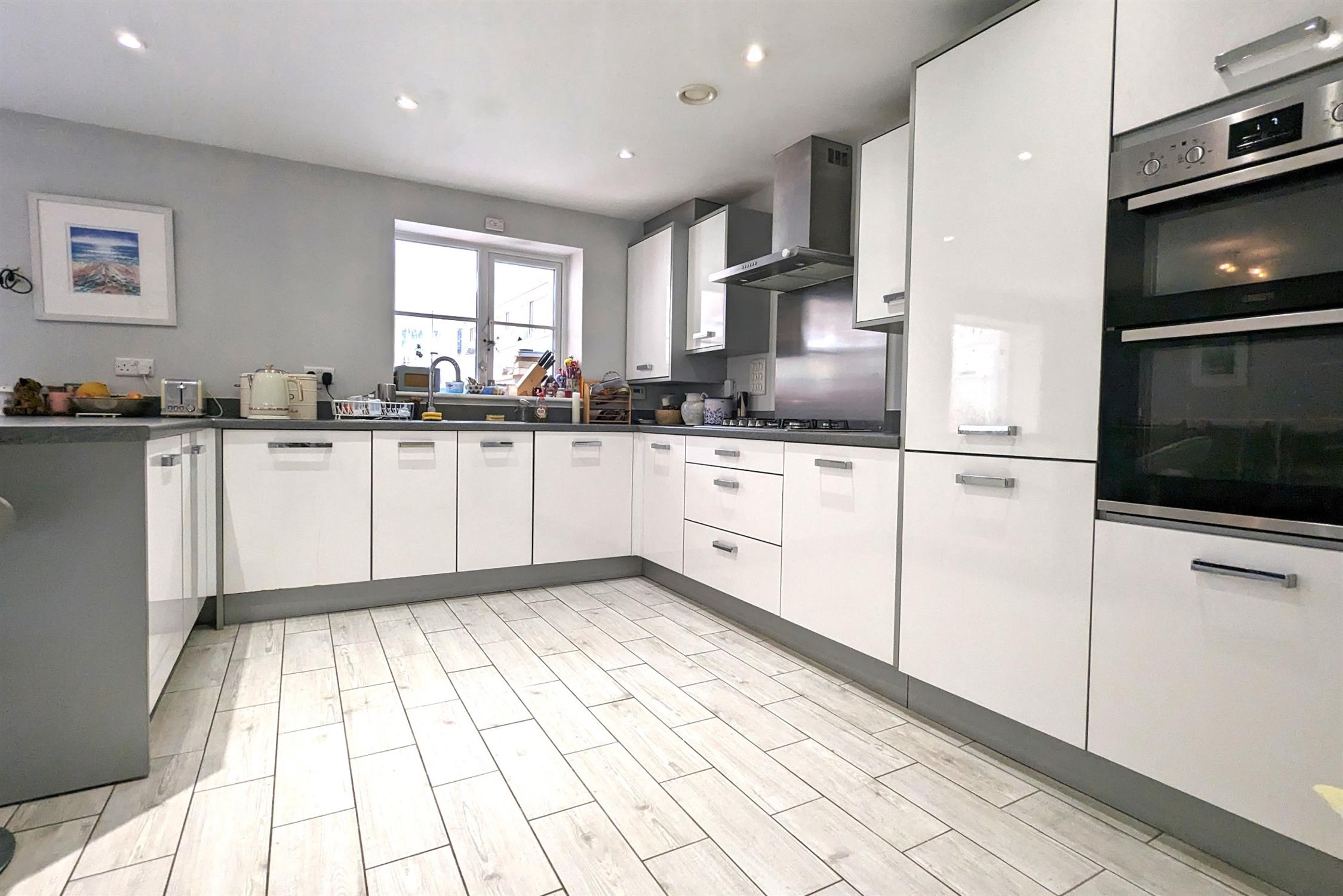 KITCHEN/BREAKFAST ROOM: Modern fitted kitchen/dining room with fitted high and low level units, five ring gas hob, double oven, fridge freezer, dishwasher, space for dining table and door conservatory.