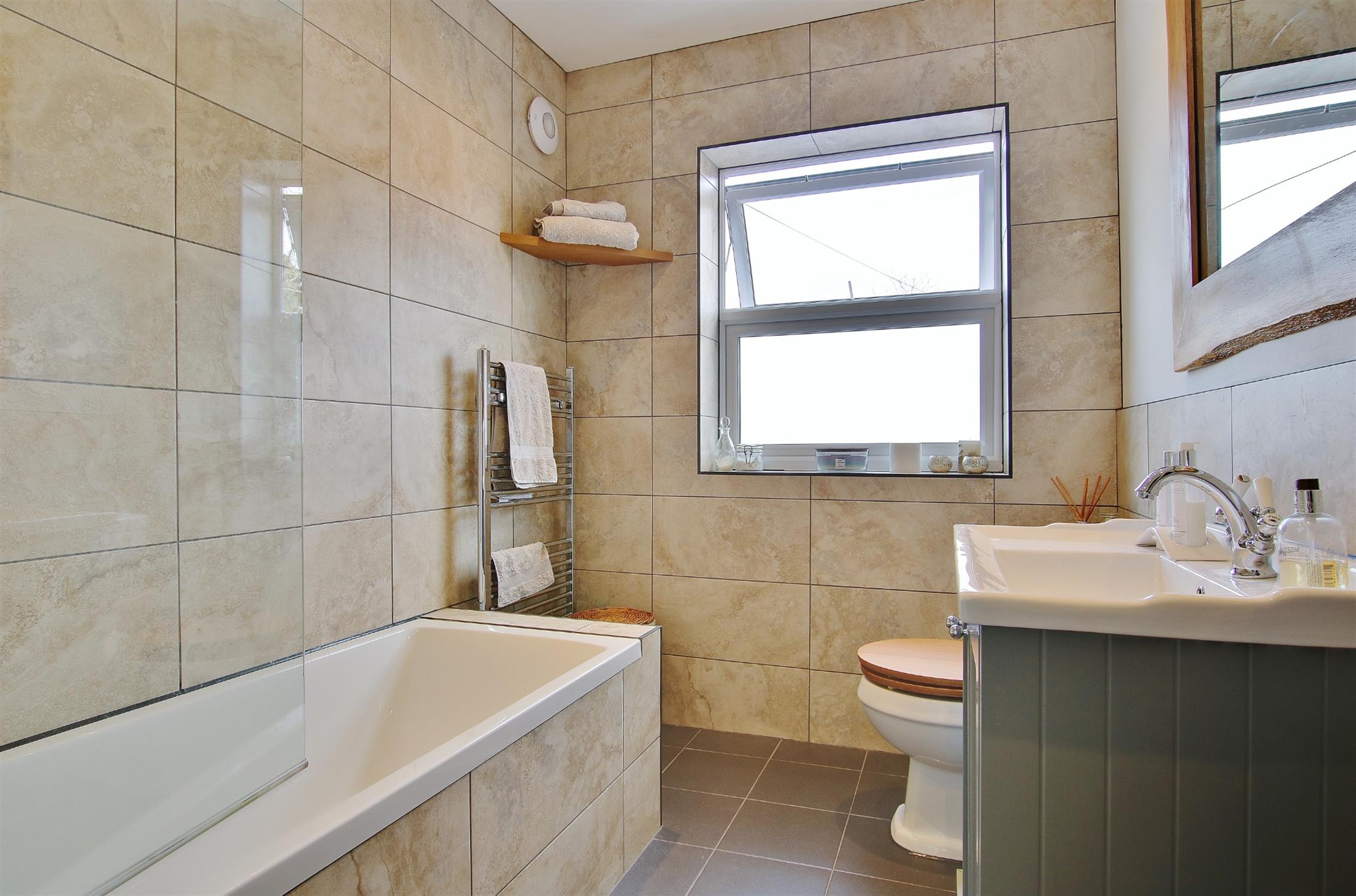 Attractive suite comprising enclosed bath with antique-style mixer tap and shower over, shower screen, wash basin with mixer tap and integrated storage below, low level WC, tiled walls and floor, extractor fan, heated towel rail, window to the rear.