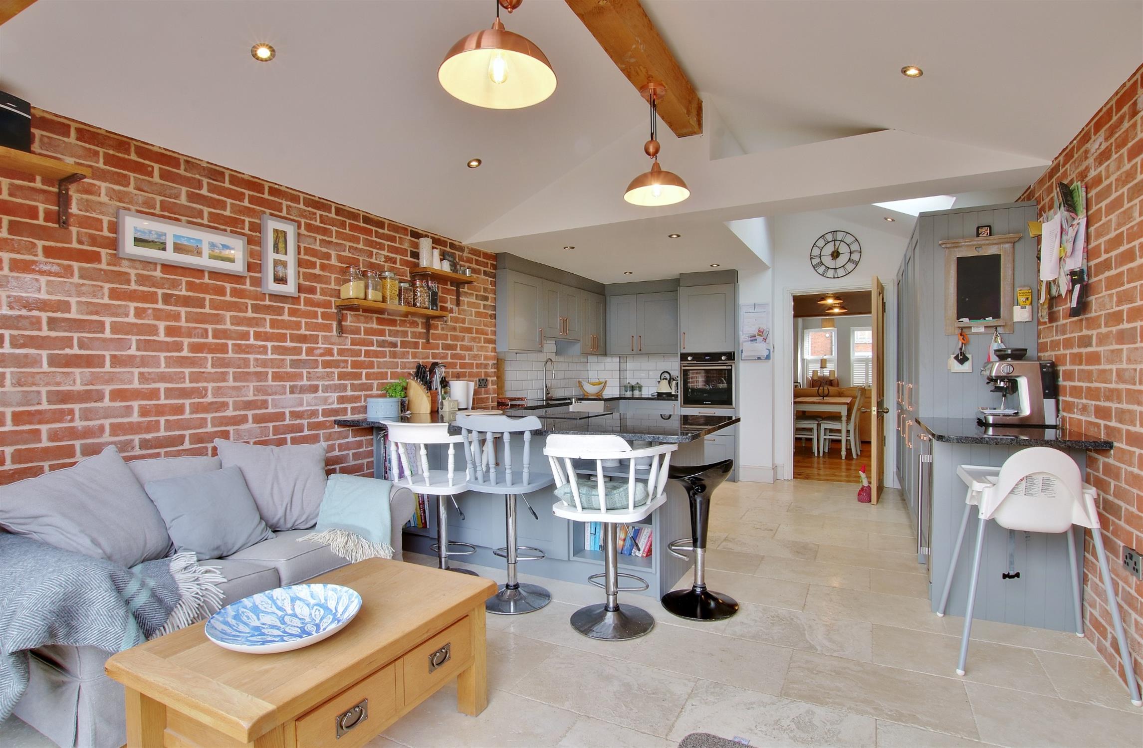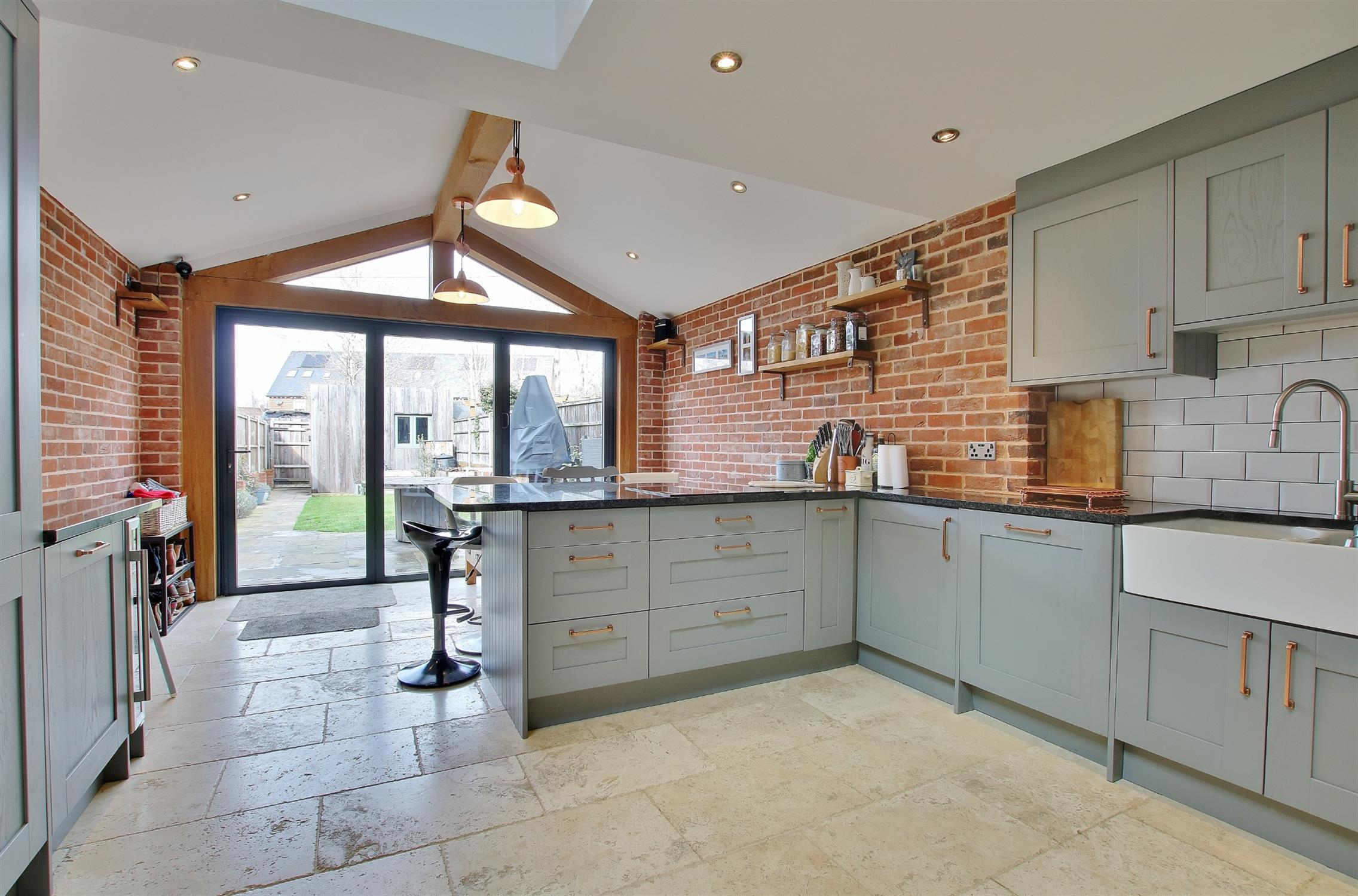 Beautifully fitted with a stylish range of contemporary grey wall and base units with granite worktops, two matching larder cupboards one housing the central heating boiler, built-in appliances to include electric double oven and induction hob, dishwasher, washing machine, wine cooler, larder fridge and larder freezer, integrated household waste bins, Travertine flooring with under floor heating, breakfast bar, tri-folding doors opening onto the patio terrace and garden, vaulted ceiling and Velux window.
