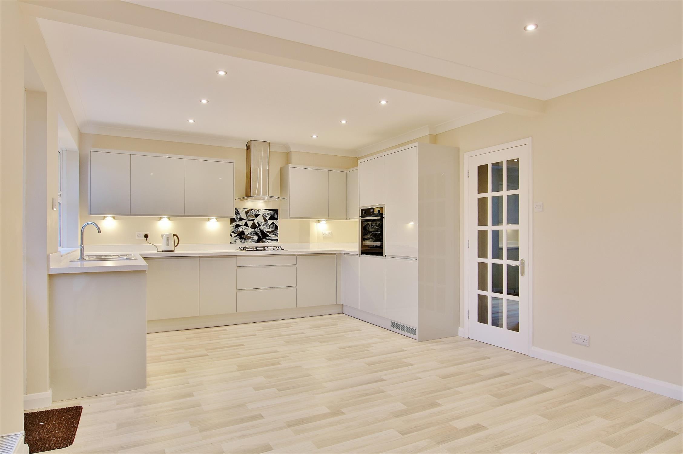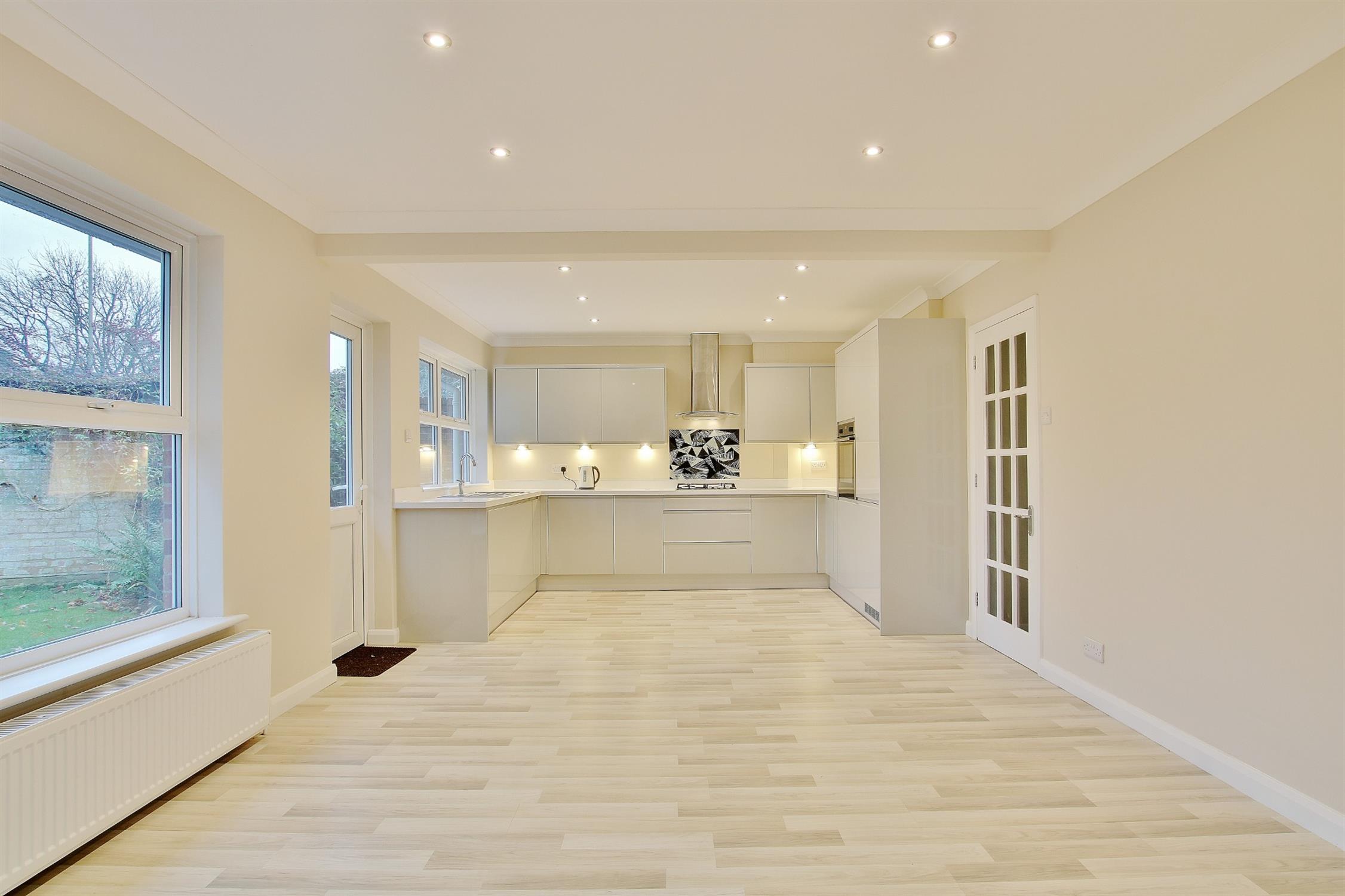 A spacious family room and well fitted with a contemporary range of eye level wall and base units with work surfaces over and matching upstands, inset one a half bowl single drainer stainless steel sink unit with mixer tap, range of integrated appliances to include electric oven with hide and slide door, four ring gas hob with stainless steel and glass extractor canopy over, washer-dryer, dishwasher and fridge/freezer, two double glazed windows and door to the rear garden, radiator, wood affect flooring.