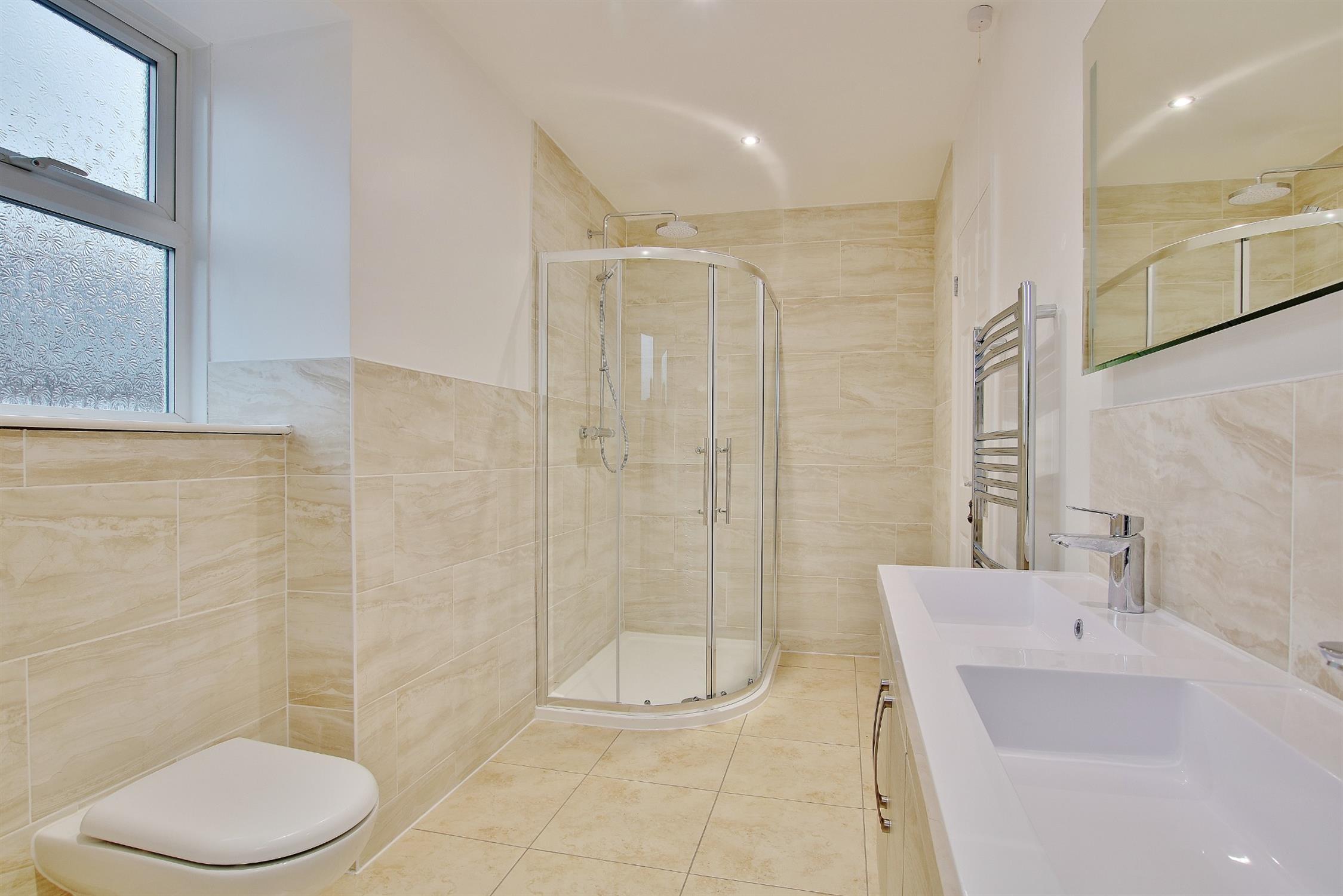 A stylish modern suite comprising large corner tiled shower cubicle with Monsoon shower head, his and hers sinks with monobloc mixer taps, low-level WC, heated towel rail, part-tiled walls, tiled floor, double glazed windows to the front and side.