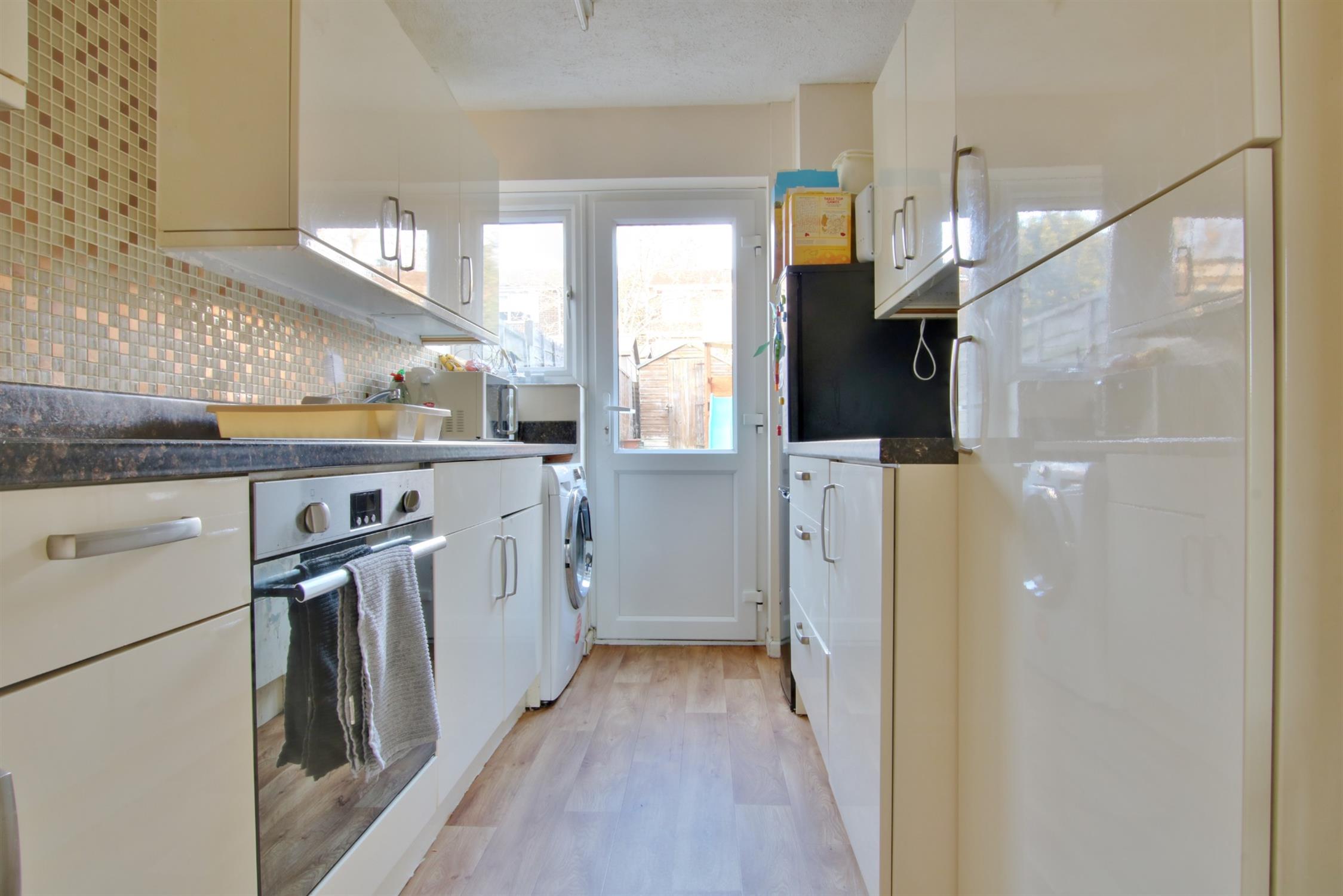 A range of wall and floor mounted units, one and a half bowl stainless steel sink with mixer tap, four ring electric hob with fan assisted oven below, tiled splash backs, double-glazed window and door to garden.
