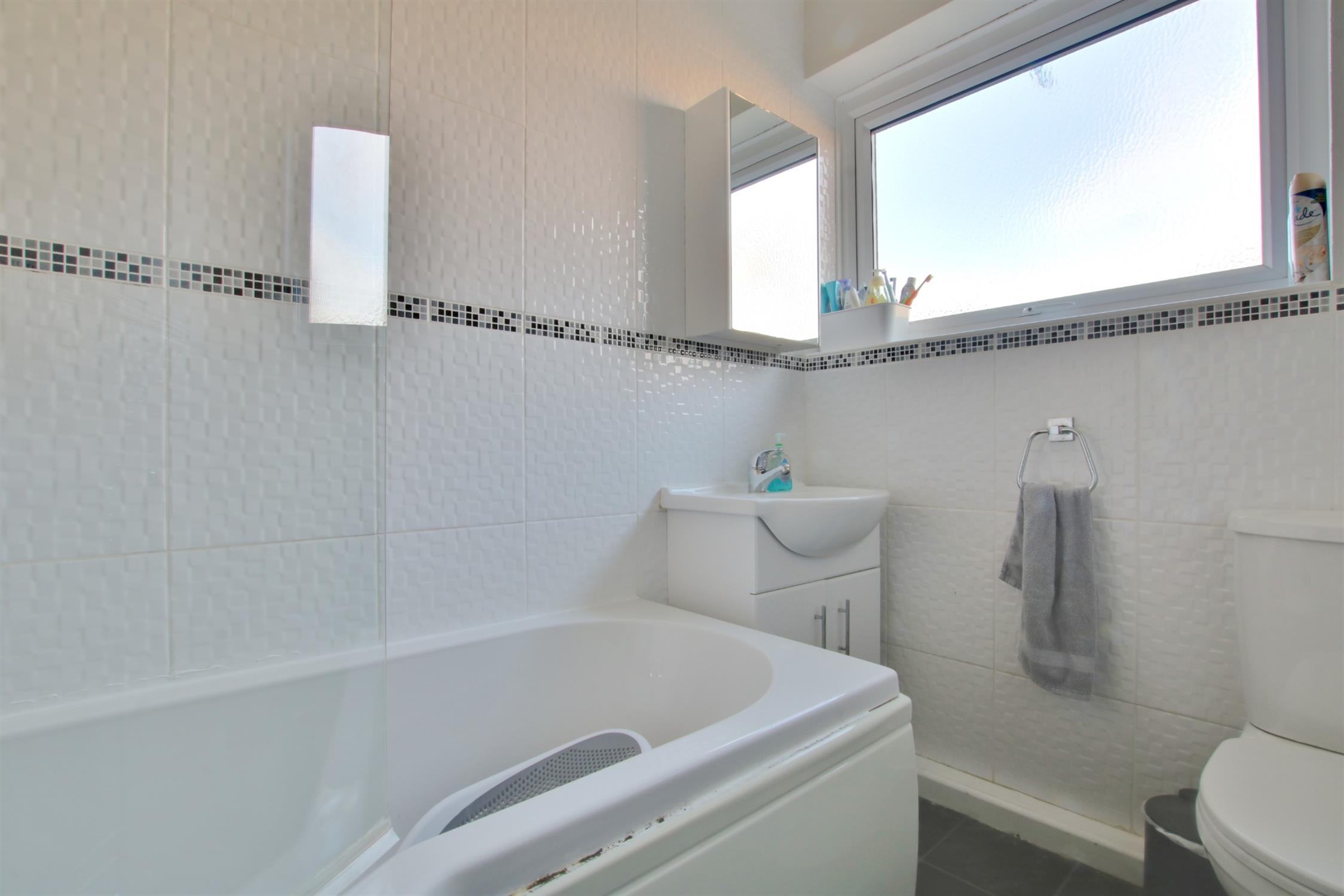 Partly tiled, bath with Mira shower unit, glazed shower screen, wash hand basin with mixer tap and storage below and mirror fronted medicine cupboard above, chrome wall mounted heated towel rail, double-glazed window.