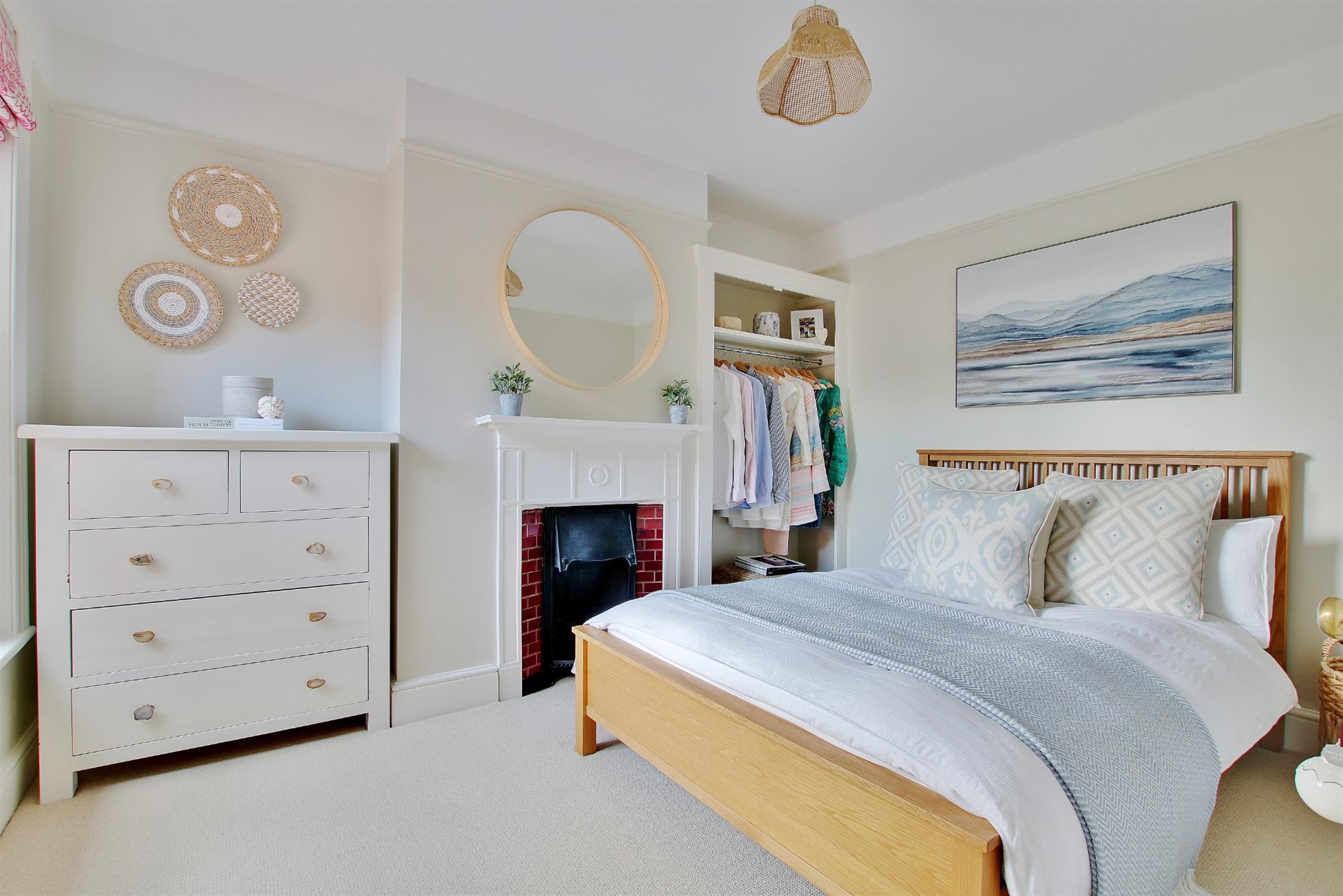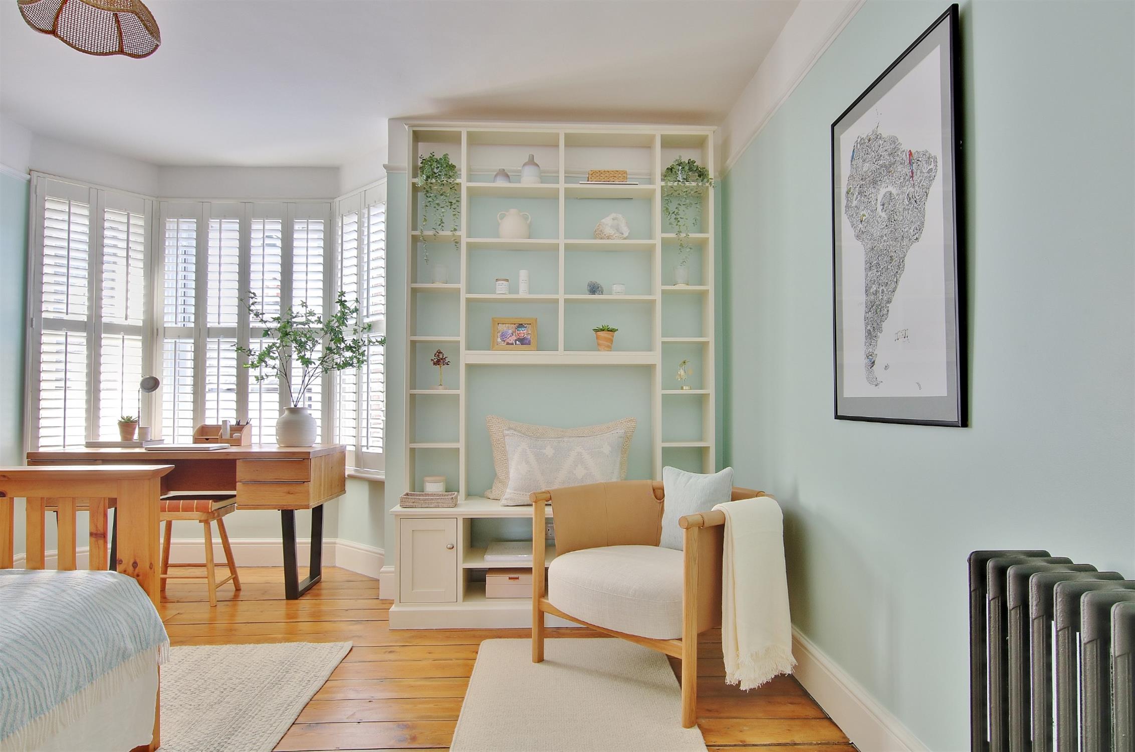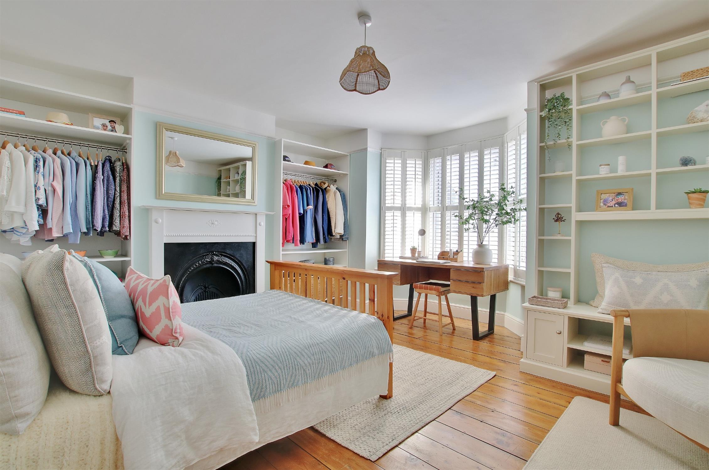 A large double room with vertical radiator, shuttered bay window to the front, original floor boards, feature fireplace, bespoke open wardrobes and display cabinet.