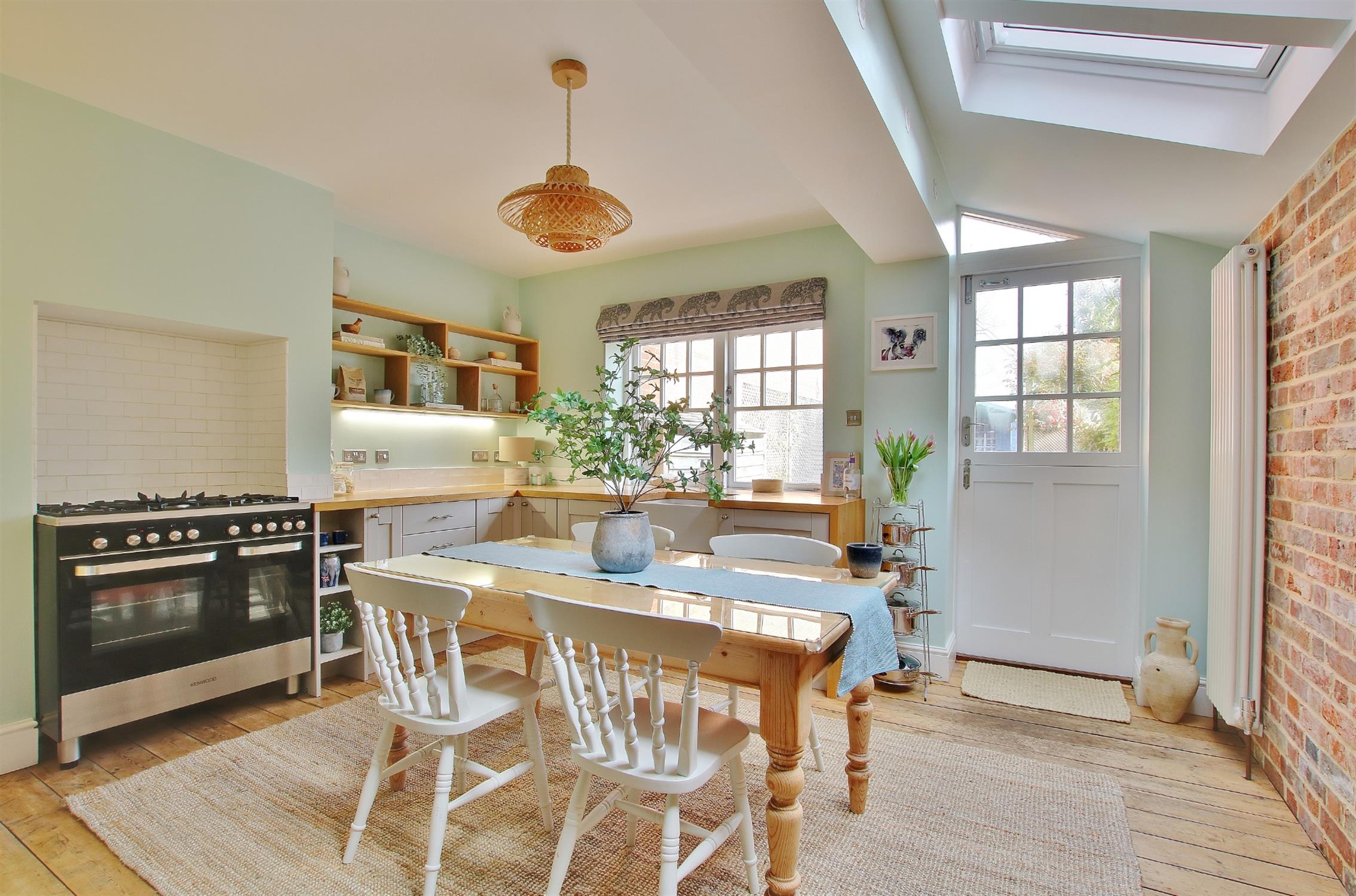 Tastefully fitted with a range of modern base units surmounted by solid wood worktops, matching display shelves, inset Belfast sink with mixer tap over, tiled splash backs, space for range style cooker, original floor boards, stable door to the garden, three Velux windows.