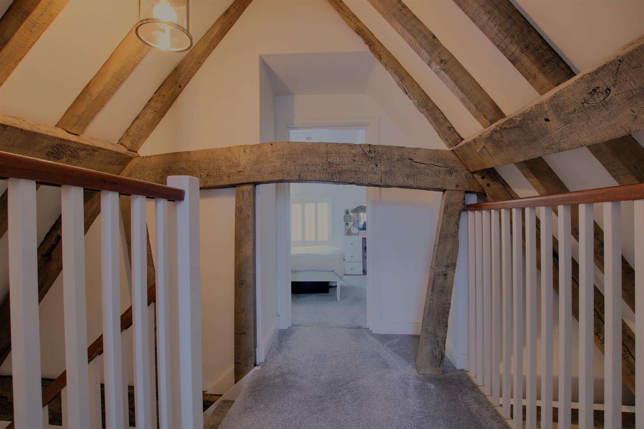 The welcoming entrance hall features oak flooring, a built-in coat cupboard, and a staircase leading to the first floor. At the front of the house, the sitting room boasts an impressive beamed ceiling, oak flooring, and a characterful fireplace with an inset wood burner. To the rear, the spacious kitchen/dining room is beautifully fitted with solid wood worktops, built-in appliances, and a door leading to the rear garden.