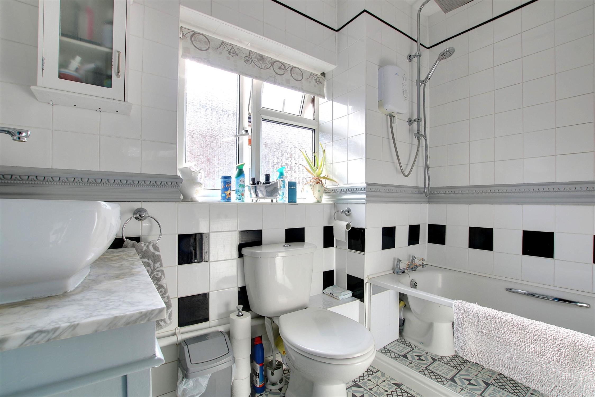 Modern suite comprising panel enclosed bath with shower over, wash basin, close coupled WC, tiled walls, heated towel rail, double-glazed window to the side.