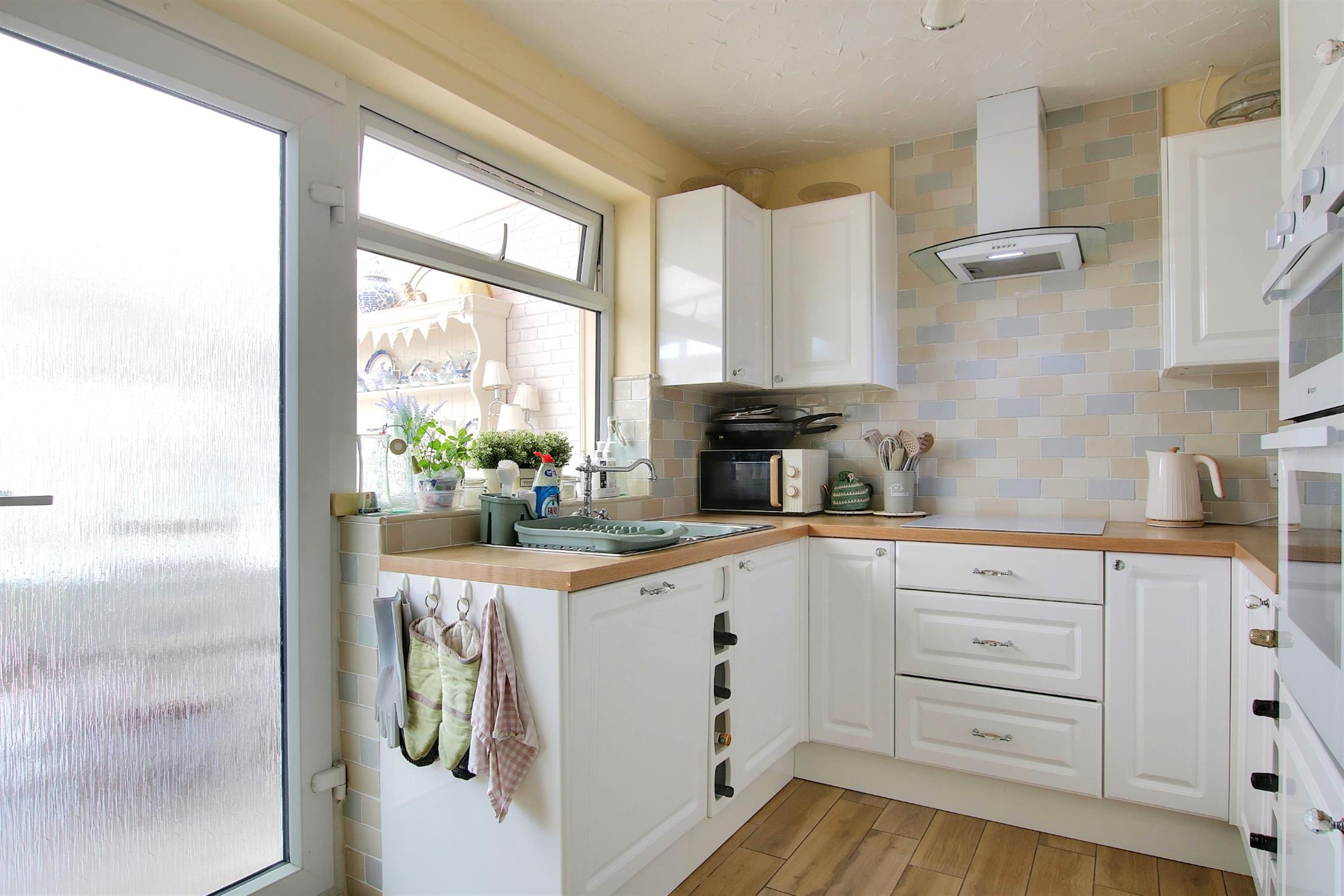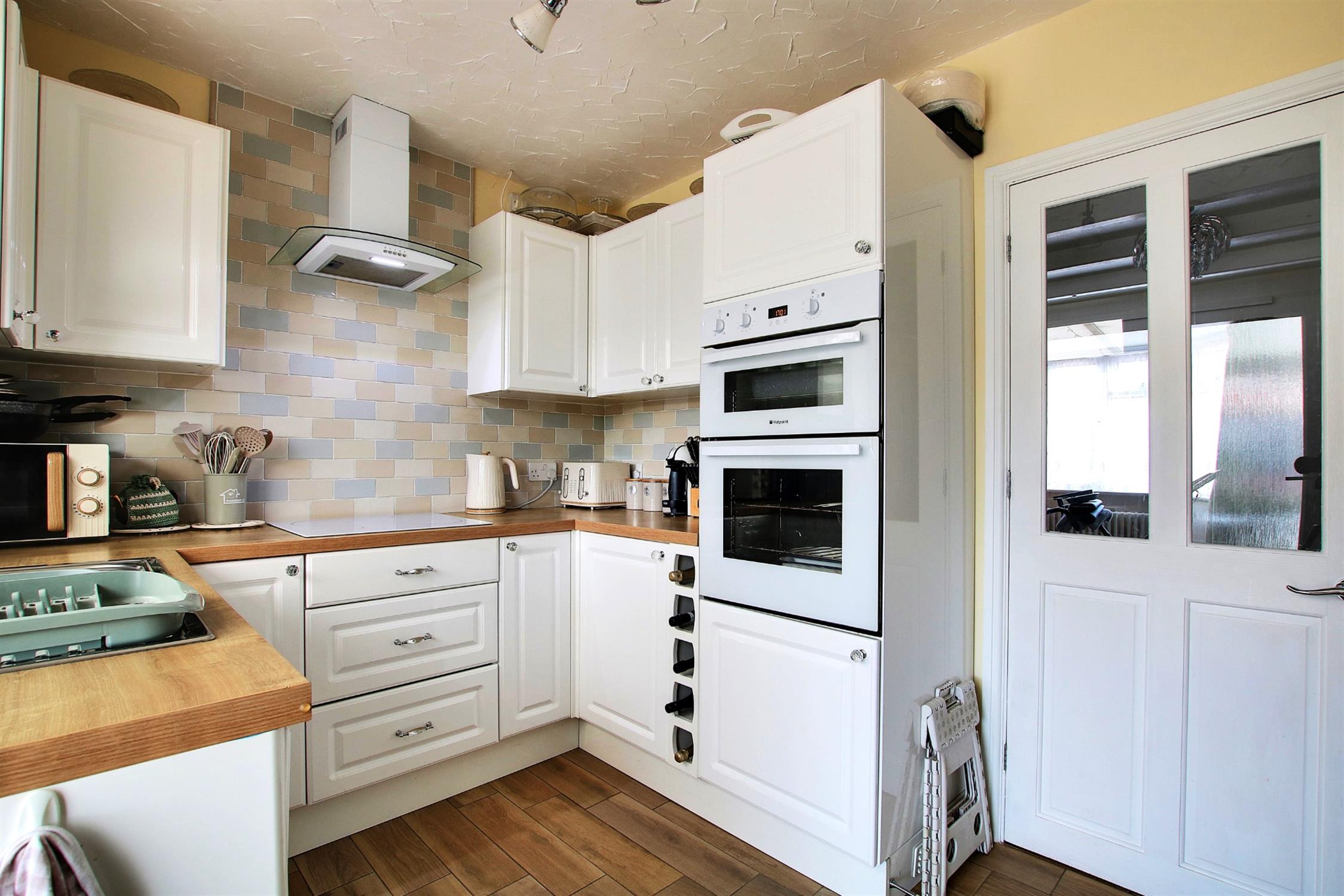 Fitted with an attractive range of modern eye-level wall units and matching base units with work surfaces above and inset single drainer stainless steel sink with mixer tap over, part tiled walls, built-in dishwasher, electric double oven and hob with extractor above, space for fridge/freezer, door to the dining conservatory, door t