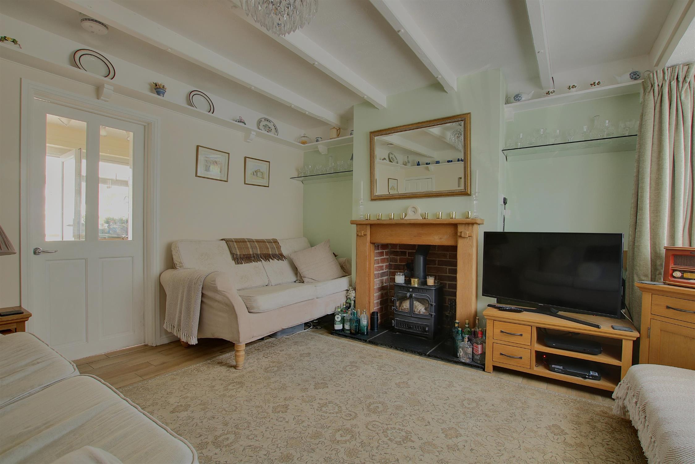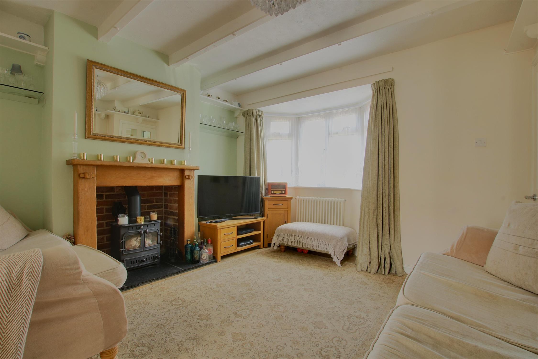 Radiator, feature fireplace with inset wood burner, double-glazed bay window to the front, tiled floor, under stairs cupboard, door to: