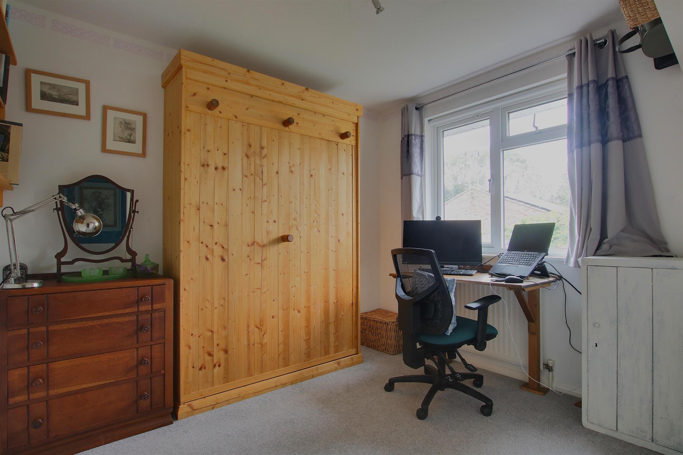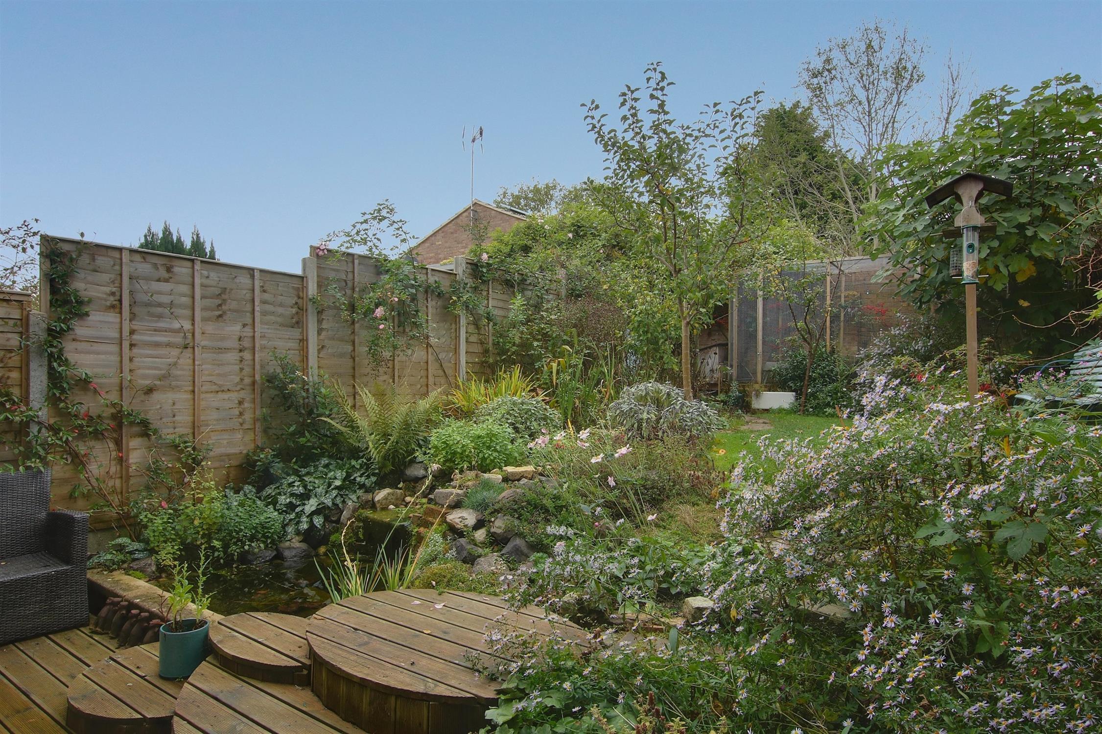 The rear garden offers a tranquil outdoor space with a south-westerly aspect, perfect for enjoying the sun. Decked areas provide space for outdoor seating and are centred around an attractive pond, while the lawn is bordered by mature planting and trees for privacy. The garage is situated in a block to the side of the property and benefits from power and light. The front garden is attractively landscaped, with steps leading to the entrance door.