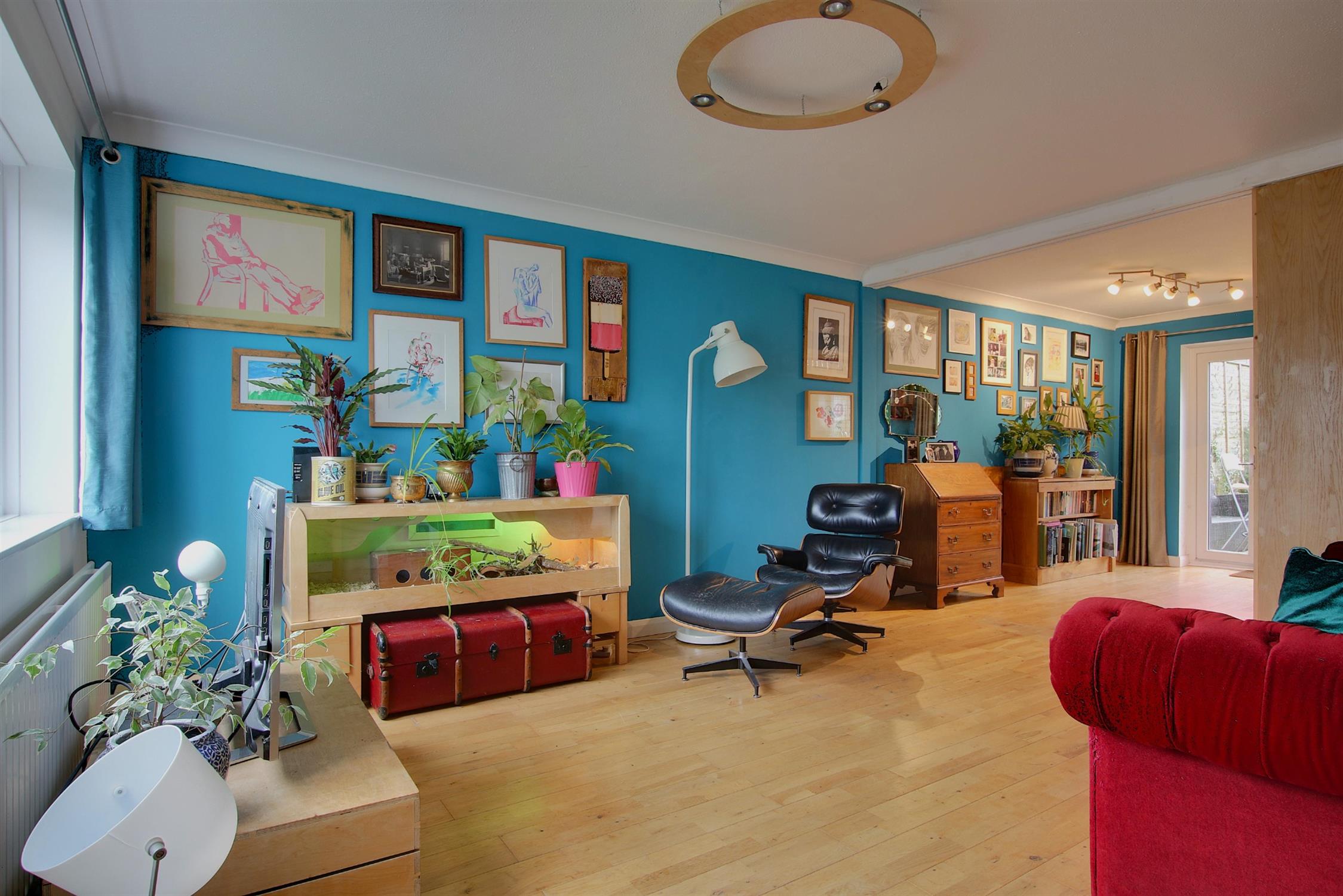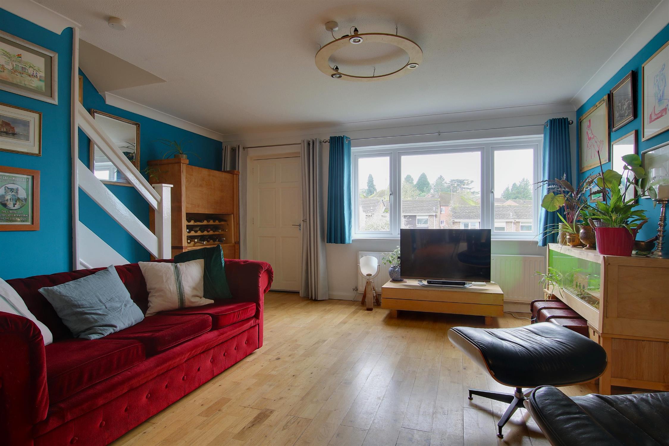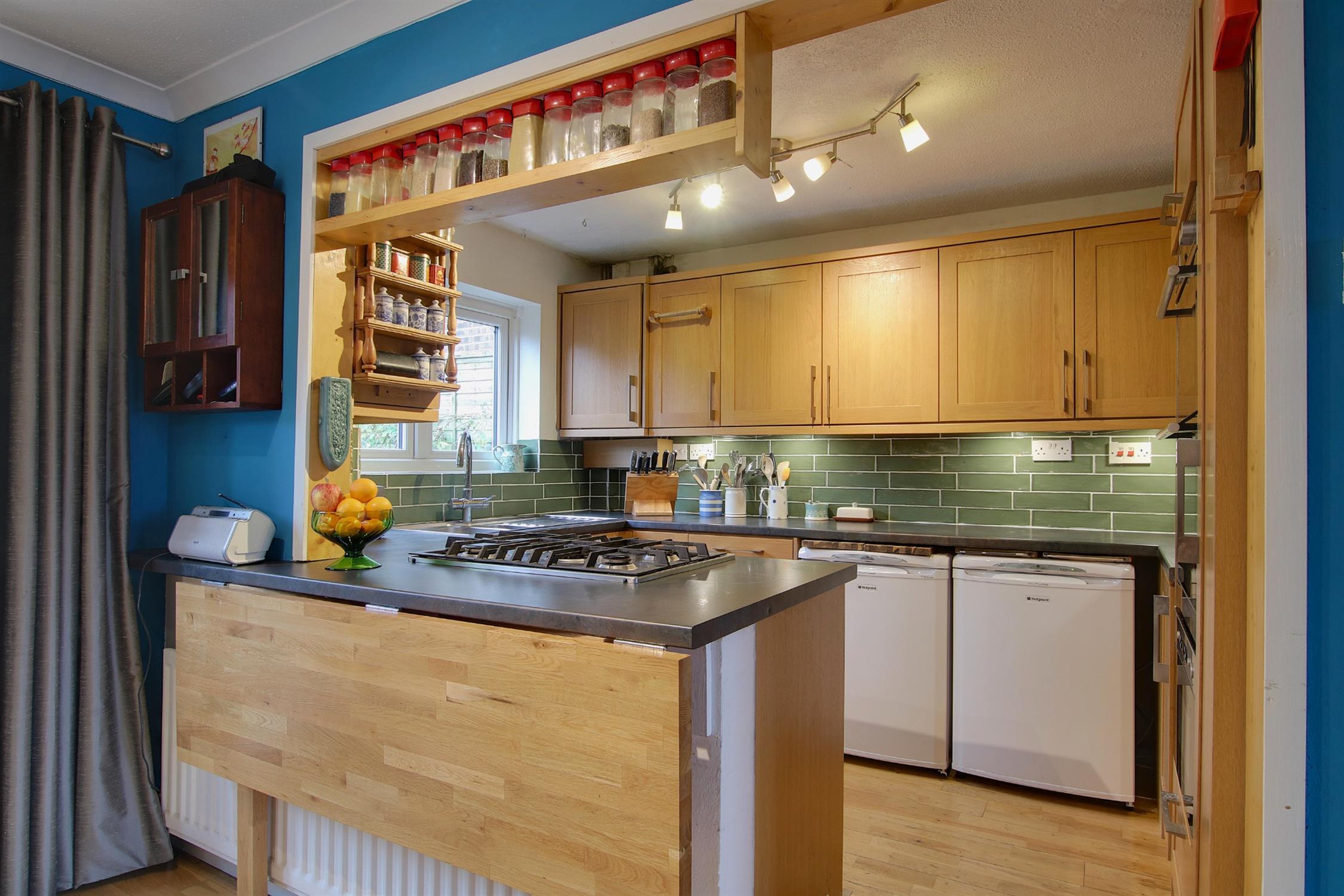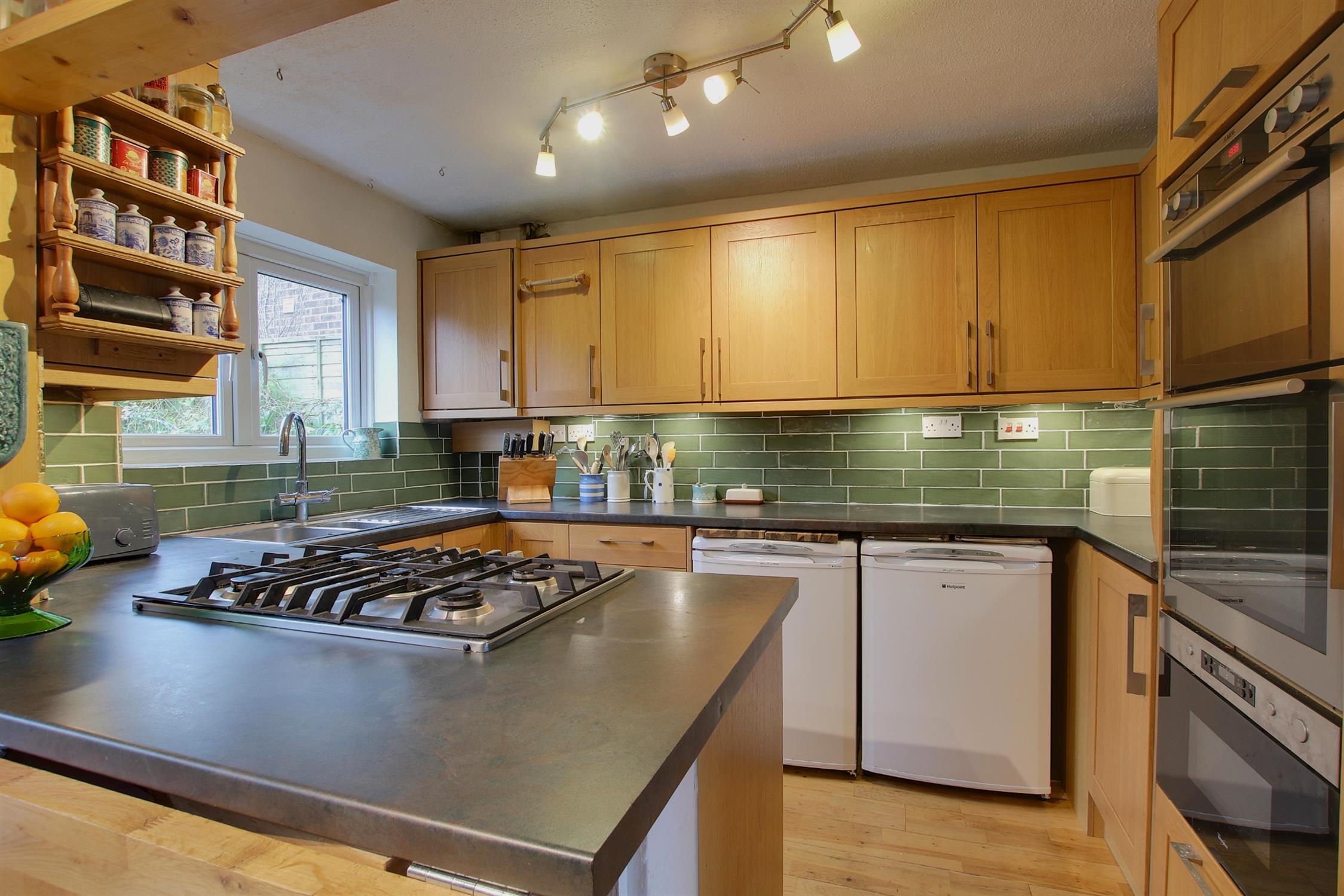 Upon entering, a porch provides a practical space for coats and shoes. The sitting room at the front includes understairs storage, with sliding doors opening into the modern kitchen/dining room. This space is perfect for both family gatherings and entertainment, featuring stylish cabinetry, ample space for a dining suite and a handy folding breakfast bar. Double doors lead out to the rear garden.