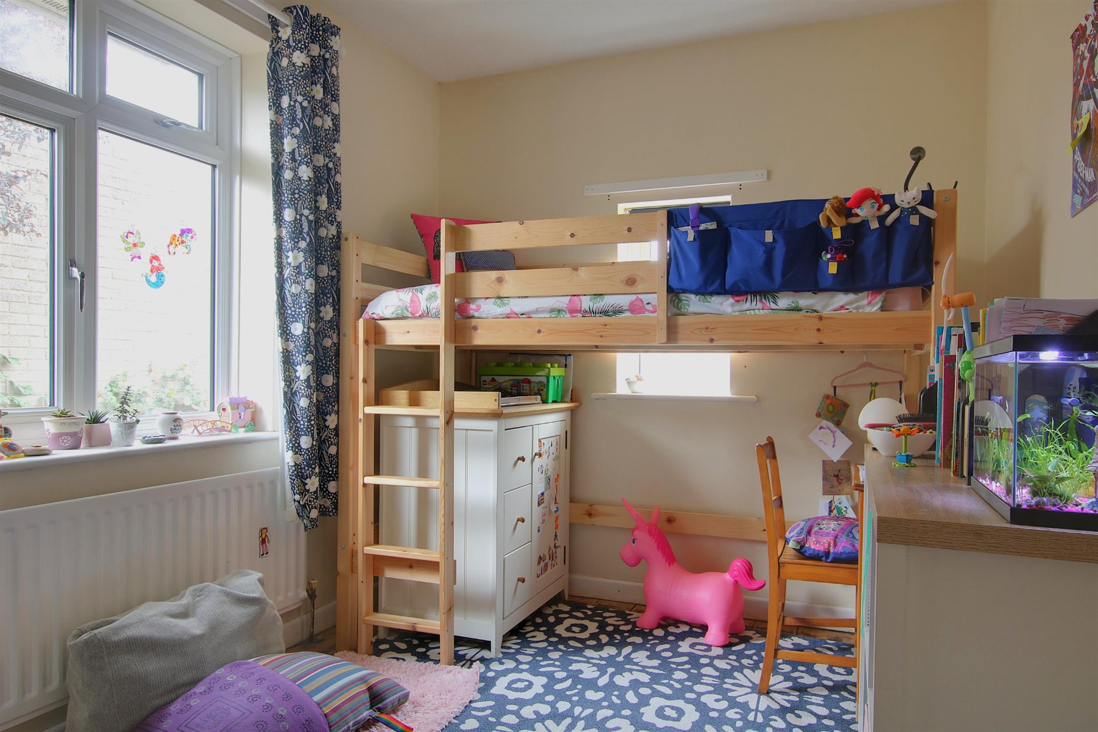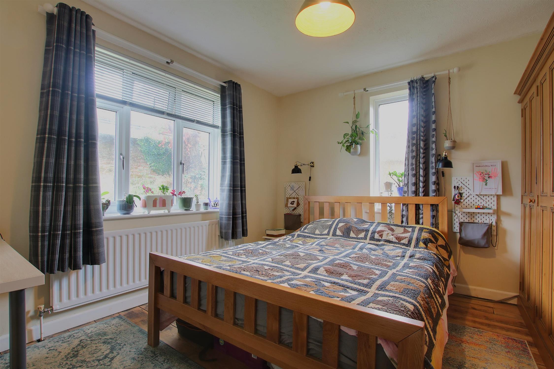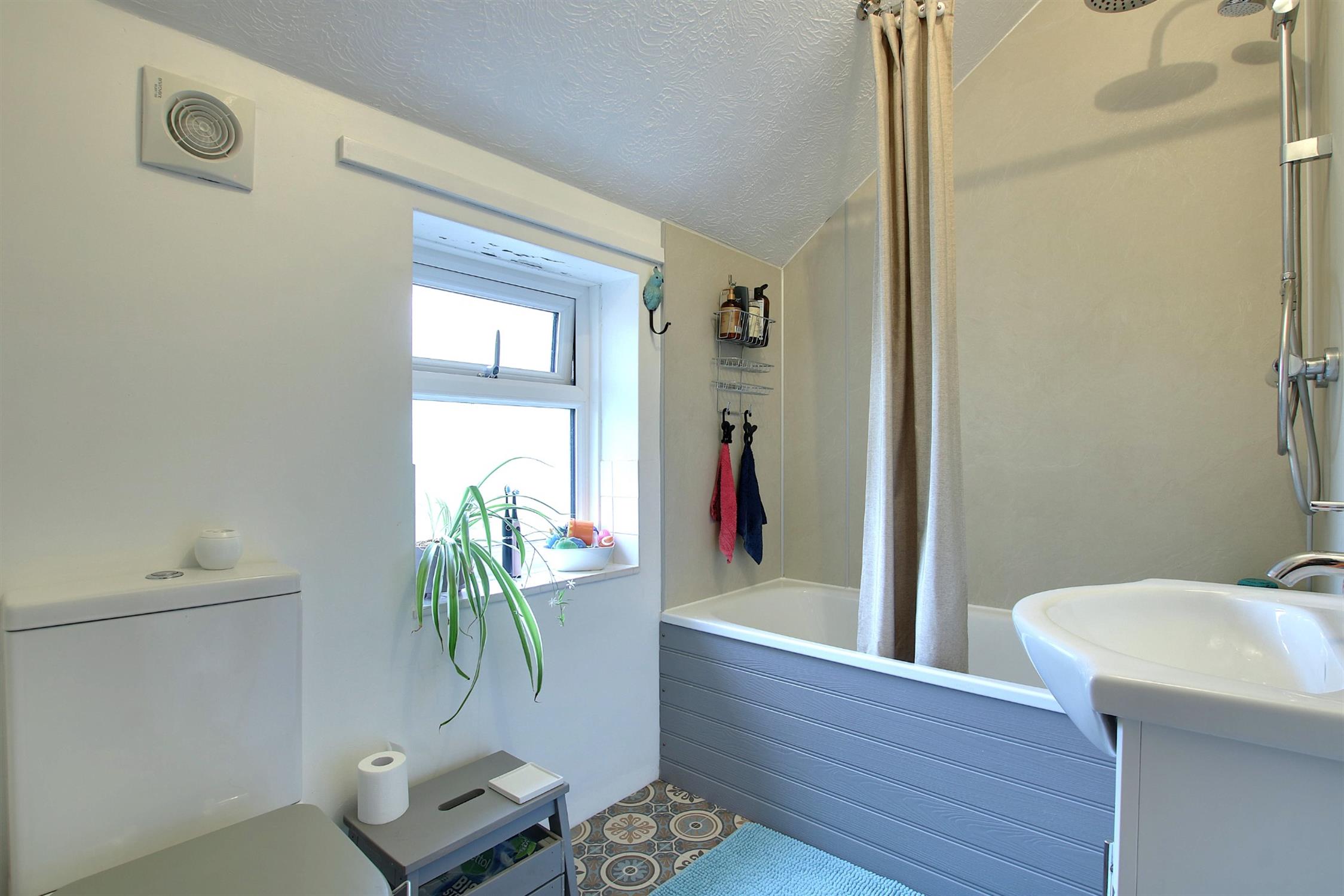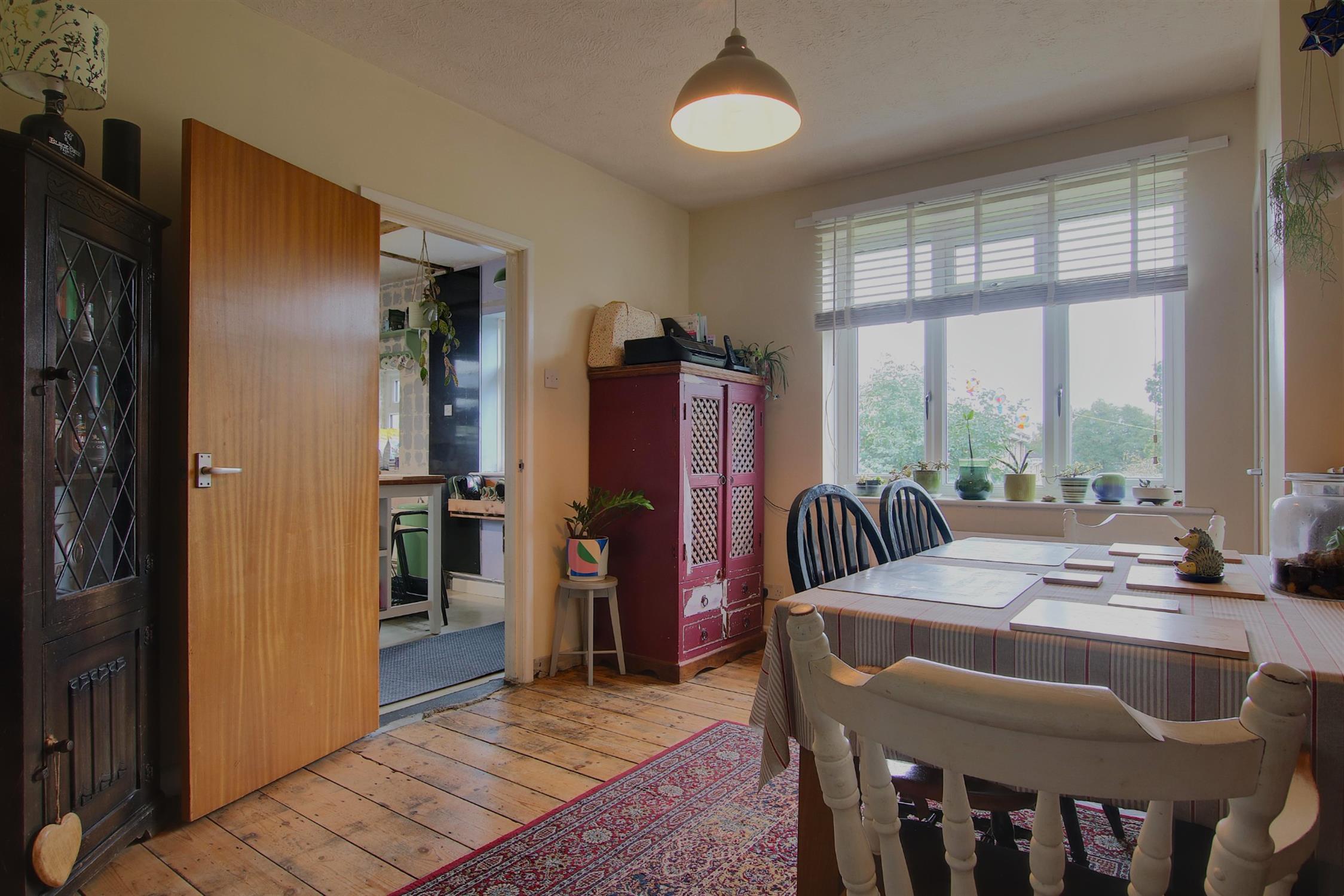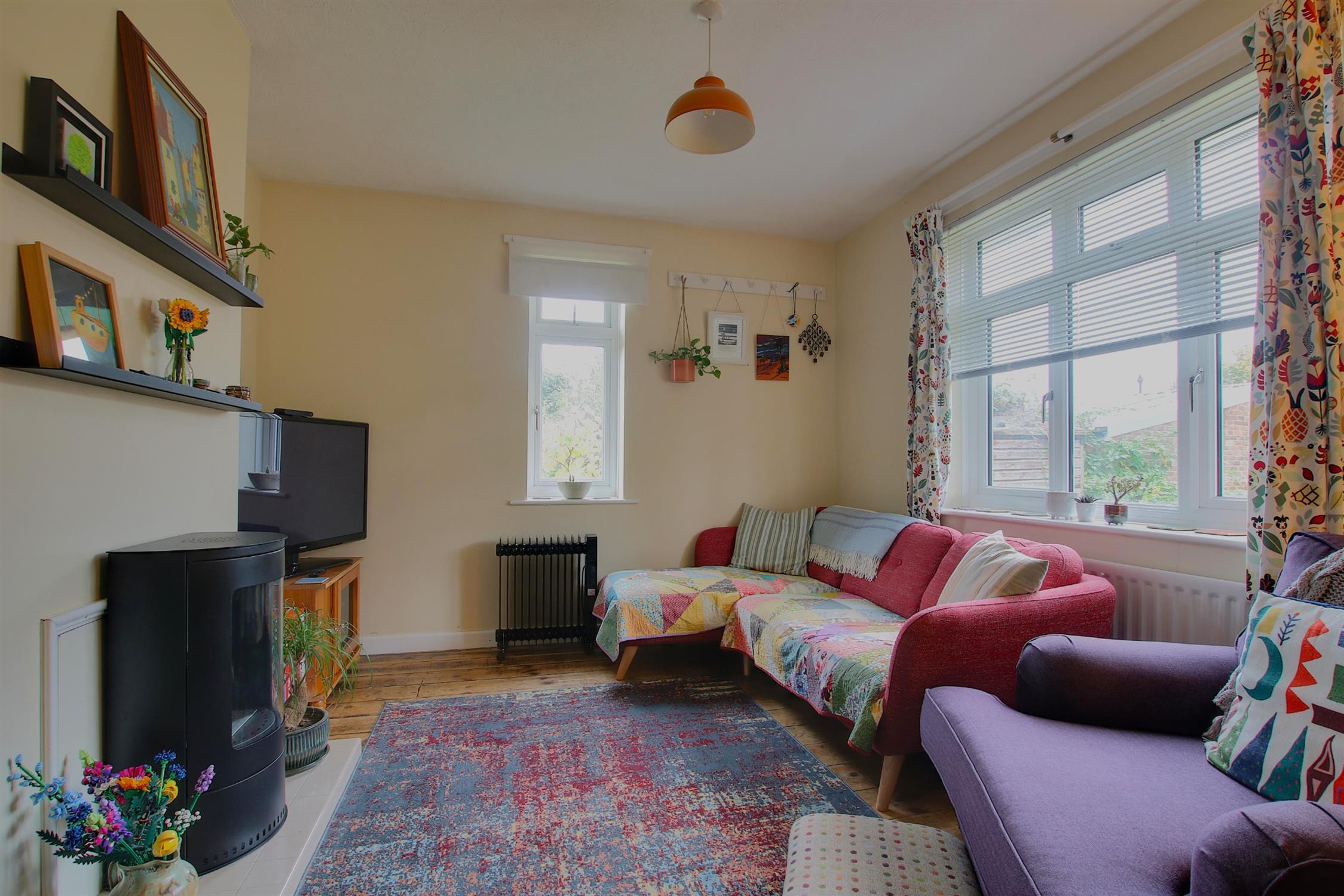 Accommodation: The property’s main entrance is accessed via a storm porch, leading into a welcoming hallway. To the front of the home, the sitting room enjoys a bright double aspect and features a modern bio-ethanol fireplace as its central focal point. Adjacent is the spacious main bedroom, which also benefits from a dual aspect, offering plenty of natural light. The hallway continues into the well-sized dining room, which features a built-in cupboard housing the Worcester combination boiler and provides access to both the kitchen and an inner hall. The kitchen is a practical, light-filled space with a double aspect, ample worktop and appliance space, and plumbing for a washing machine. A rear door opens directly into the garden, offering a convenient second point of entry to the property. The inner hall leads to two additional double bedrooms, one of which features a double aspect, making it particularly bright and versatile. Completing the accommodation is the family bathroom, which is fitted with a modern suite, including a panel-enclosed bath with a shower overhead, a wash basin, a low-level WC, an extractor fan, and a window for natural ventilation.