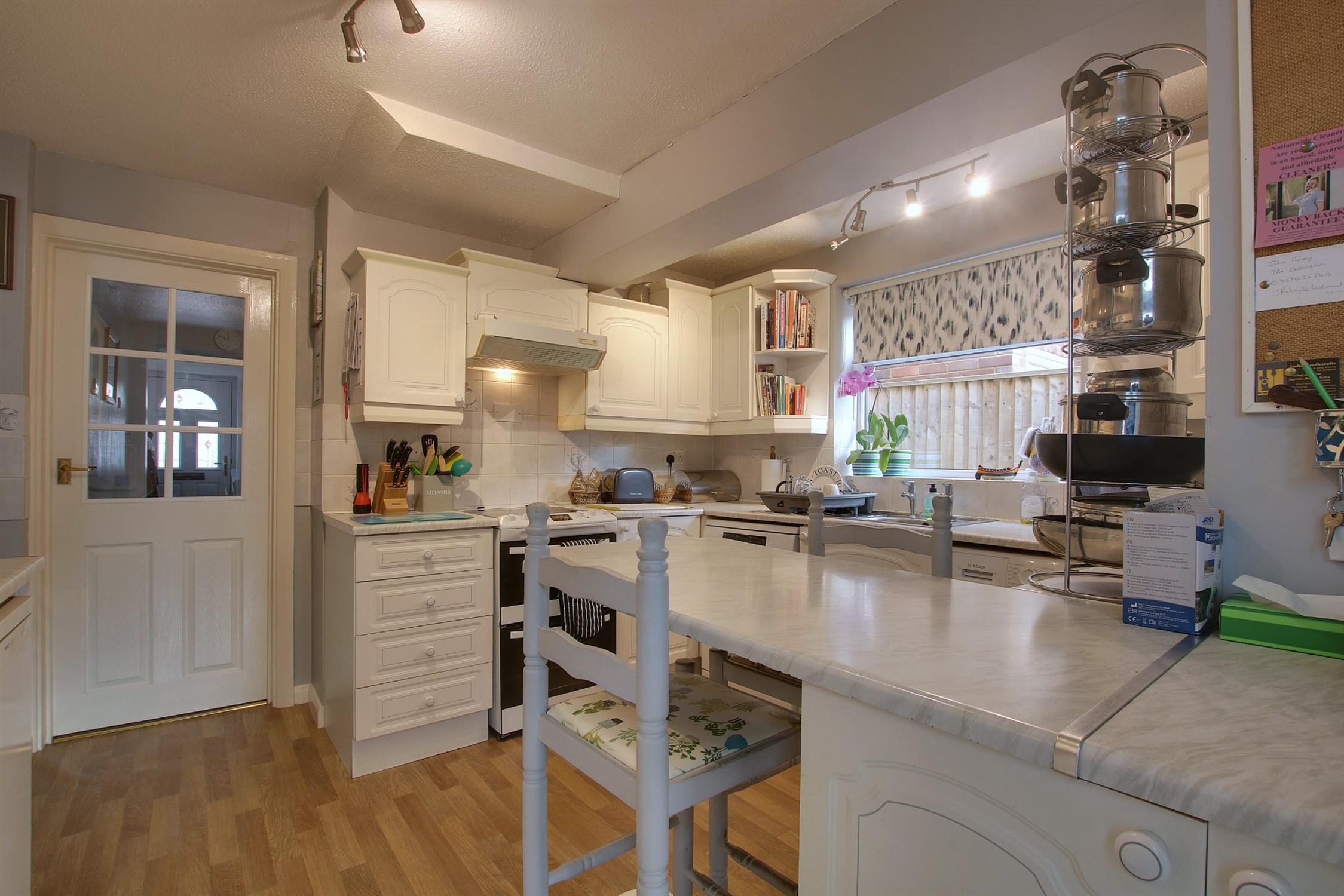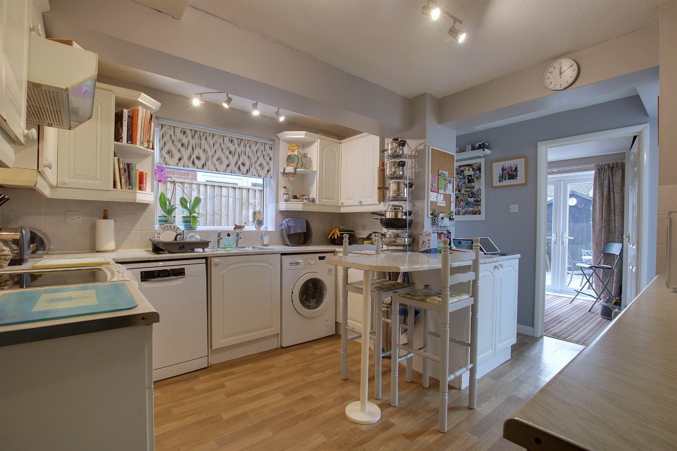 The fitted kitchen, equipped with a range of wall and base units, offers the potential to be opened up either into the dining room or the rear extension, creating an ideal open-plan family space.