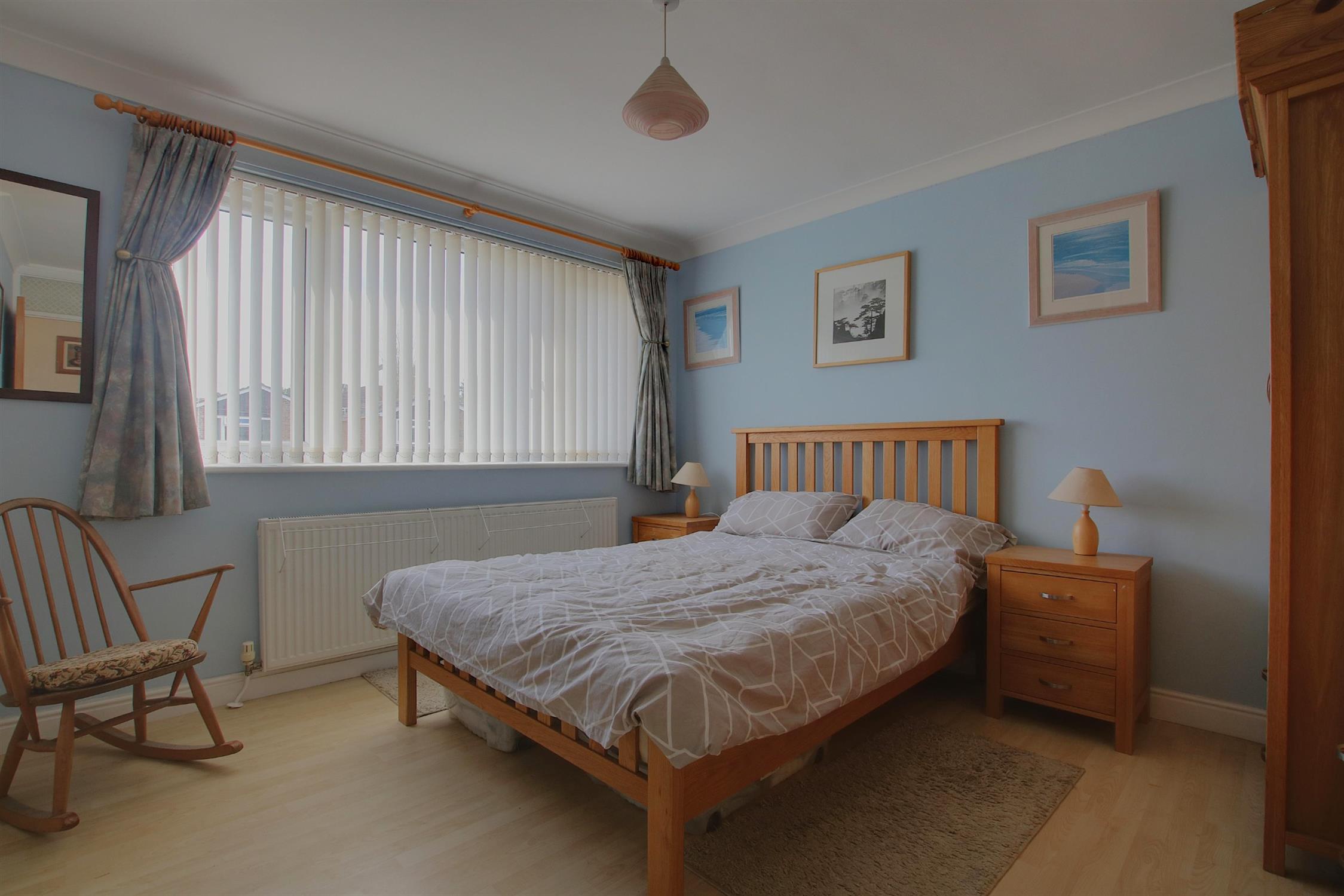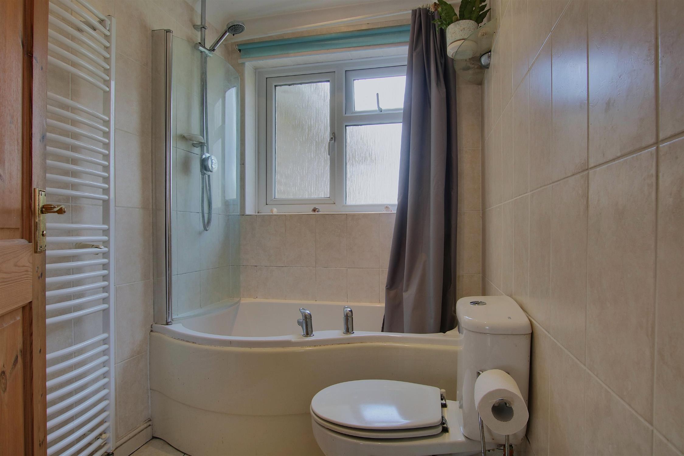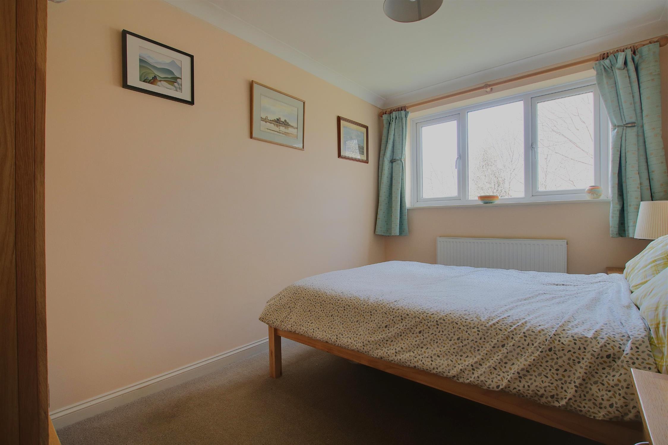 The first floor comprises three well-proportioned bedrooms and a modern family bathroom. The principal bedroom, positioned at the front, features built-in wardrobes. A second double bedroom overlooks the garden, while the third bedroom, ideal as a single room or home office, adds flexibility to the layout. The family bathroom is fitted with a bath and overhead shower.