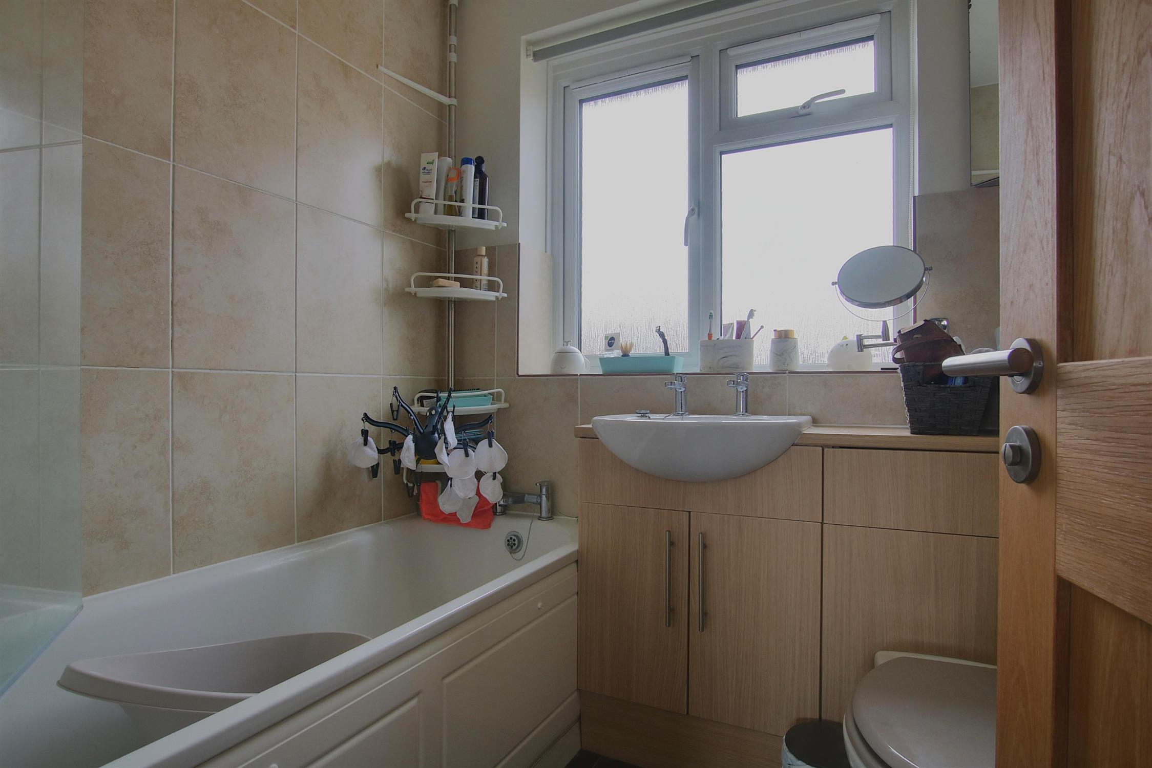 Modern suite comprising panel-enclosed bath with shower over, wash basin and WC with integrated storage, heated towel rail, part-tiled walls, double-glazed window to the front.