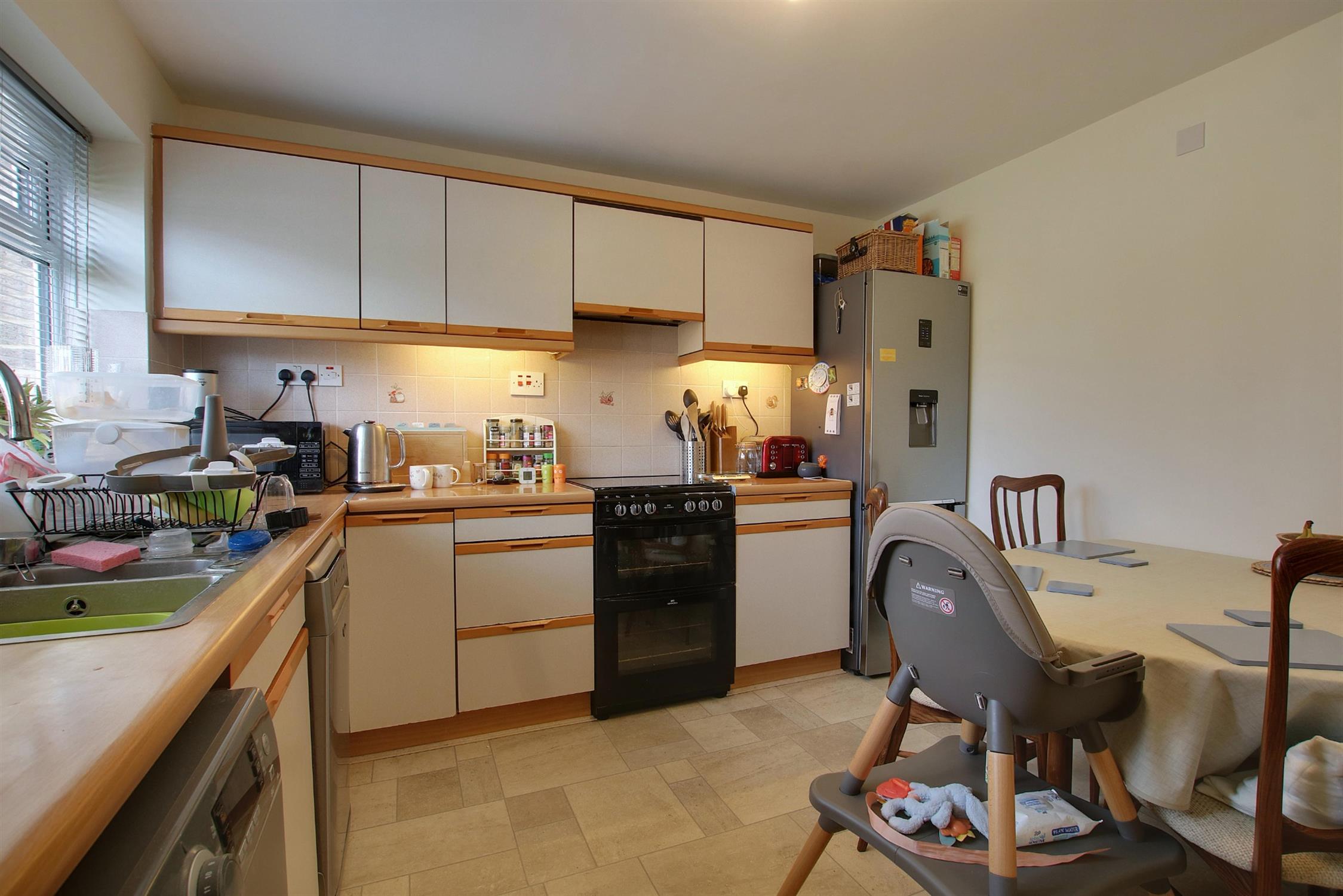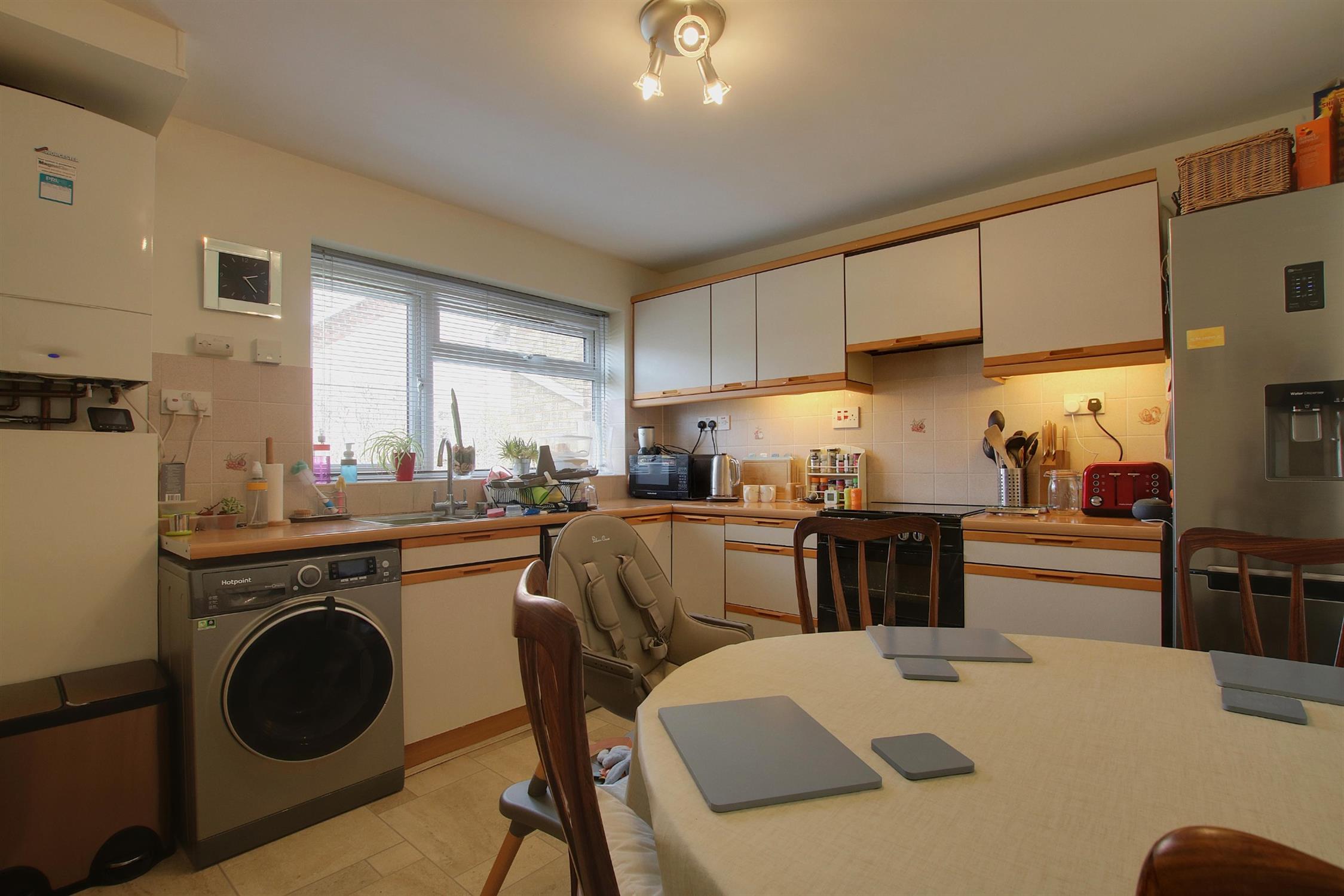 Fitted with a range of modern wall and base units with roll-edge work surfaces over and tiled surrounds, inset one-and-a-half bowl single-drainer stainless steel sink with mixer tap over, space and plumbing for washing machine and slimline dishwasher, space for cooker, wall-mounted Worcester combination central heating boiler, radiator, built-in cupboard, double-glazed window to the front.