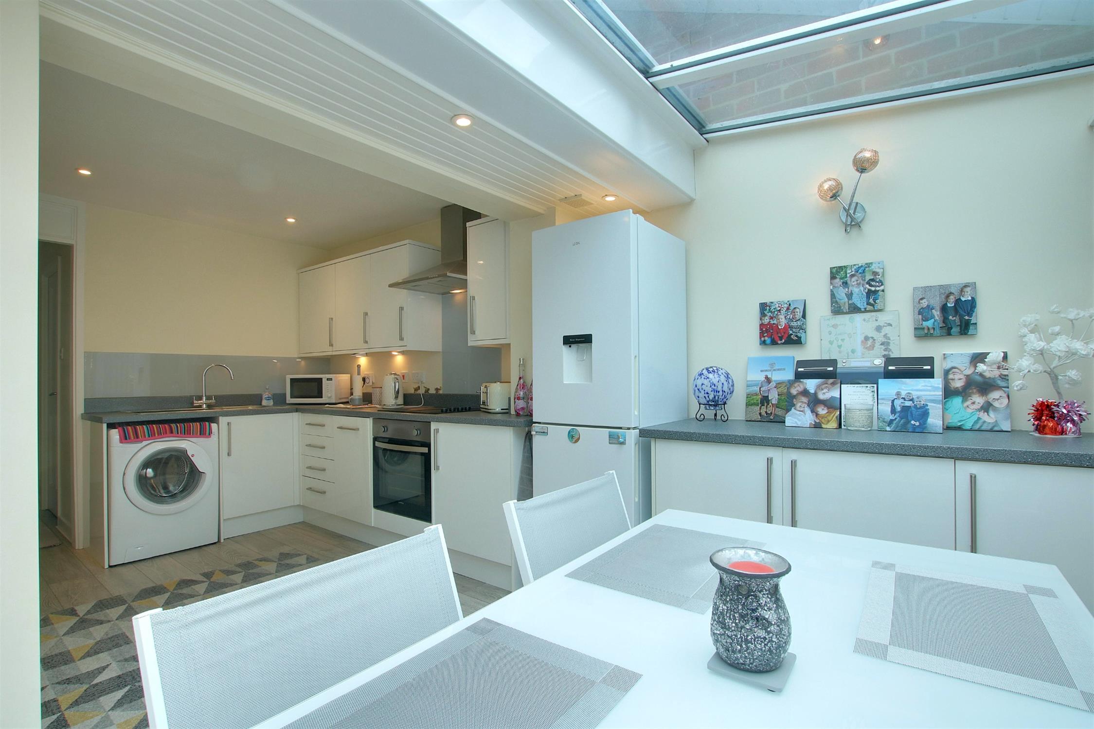 A bright and sunny room, extended to the rear, and fitted with a stylish range of modern wall and base units with work surfaces over, inset single drainer sink with mixer tap over, integrated appliances to include electric hob with extractor hood over, electric oven and slimline dishwasher, plumbing for dishwasher, space for fridge/freezer, wood effect flooring, radiator, double-glazed windows and double doors to the rear garden.