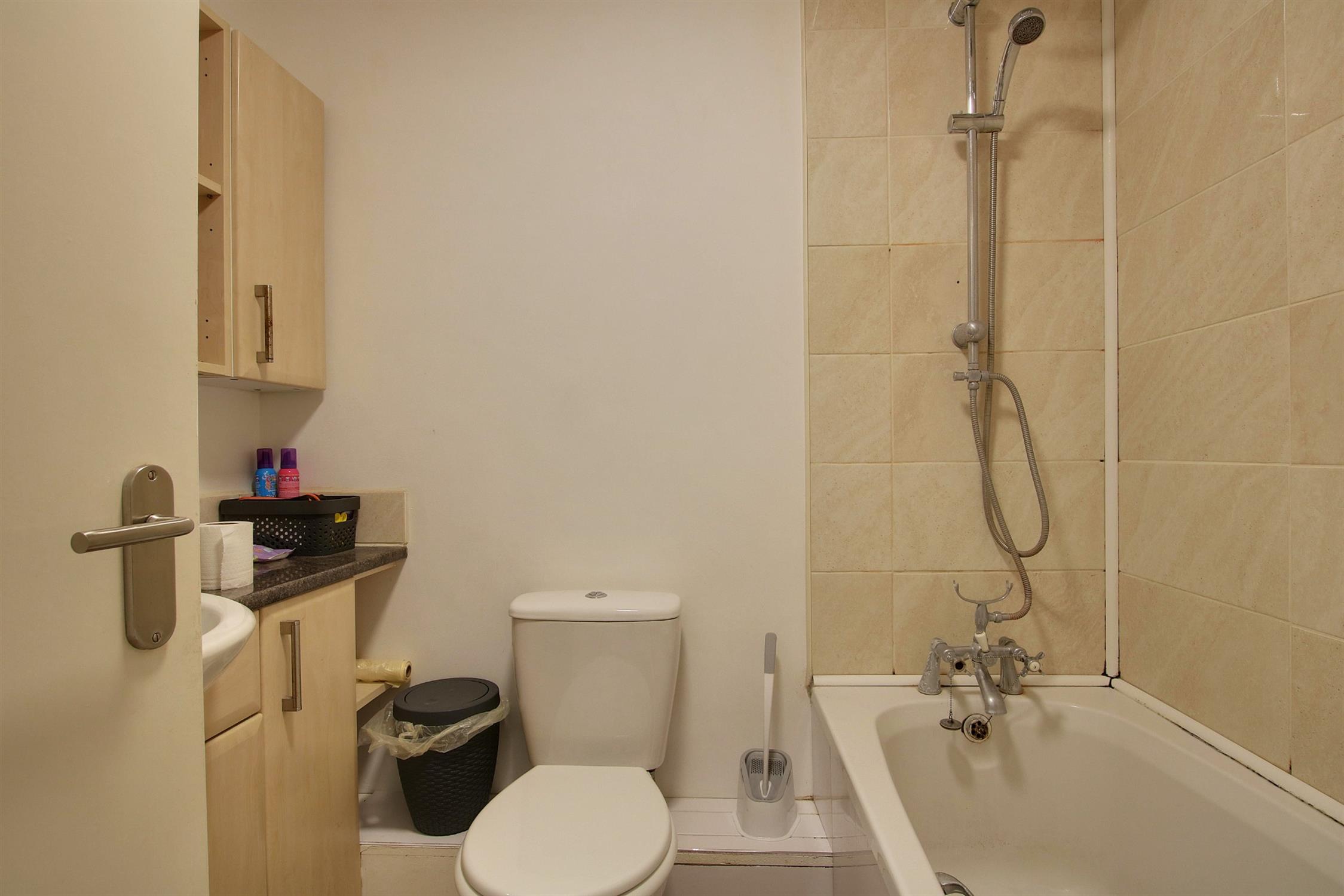 Fitted with a modern white suite comprising panel enclosed bath with antique-style shower mixer over, wash basin with integrated storage, low-level WC, extractor fan, part tiled walls, wood effect flooring.