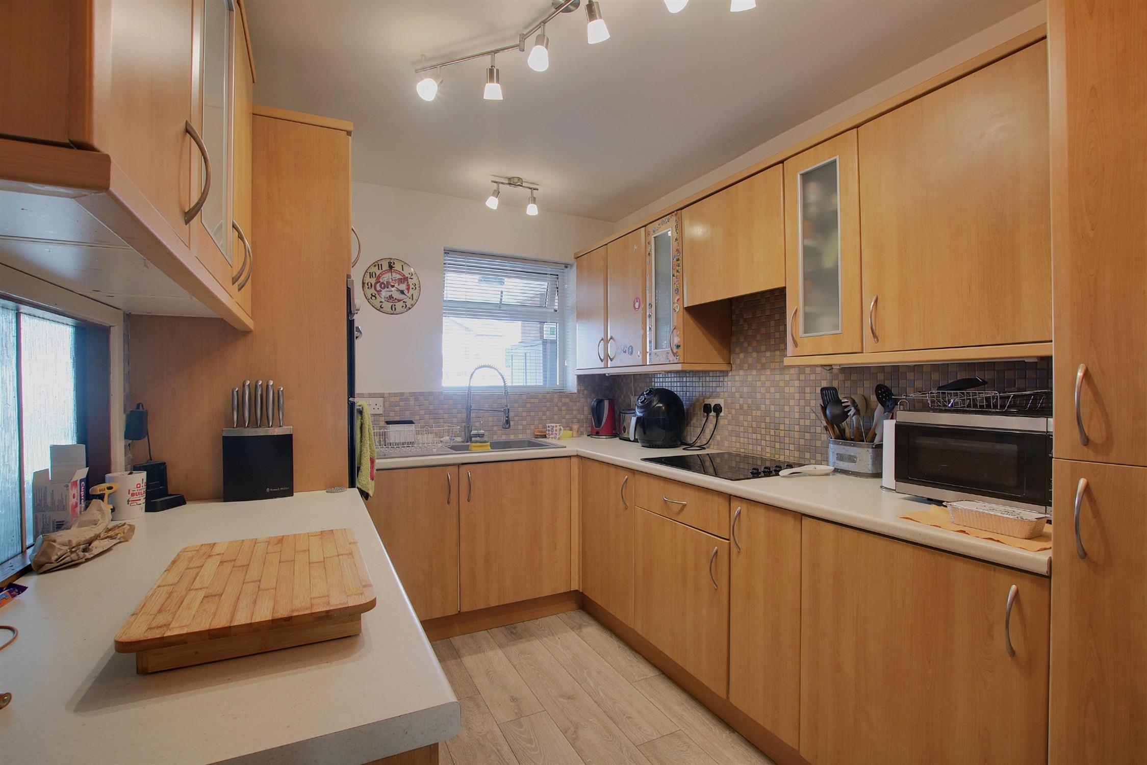 Well fitted with an excellent range of modern eye level wall units, matching base units with roll-edge work surfaces over and tiled surrounds, inset one-and-a-half bowl sink unit with pull-out mixer tap over, built-in electric oven and hob with extractor hood over, space for fridge/freezer, plumbing for washing machine, built-in larder cupboard, Worcester combination central heating boiler, double-glazed window to the front, wood effect flooring.