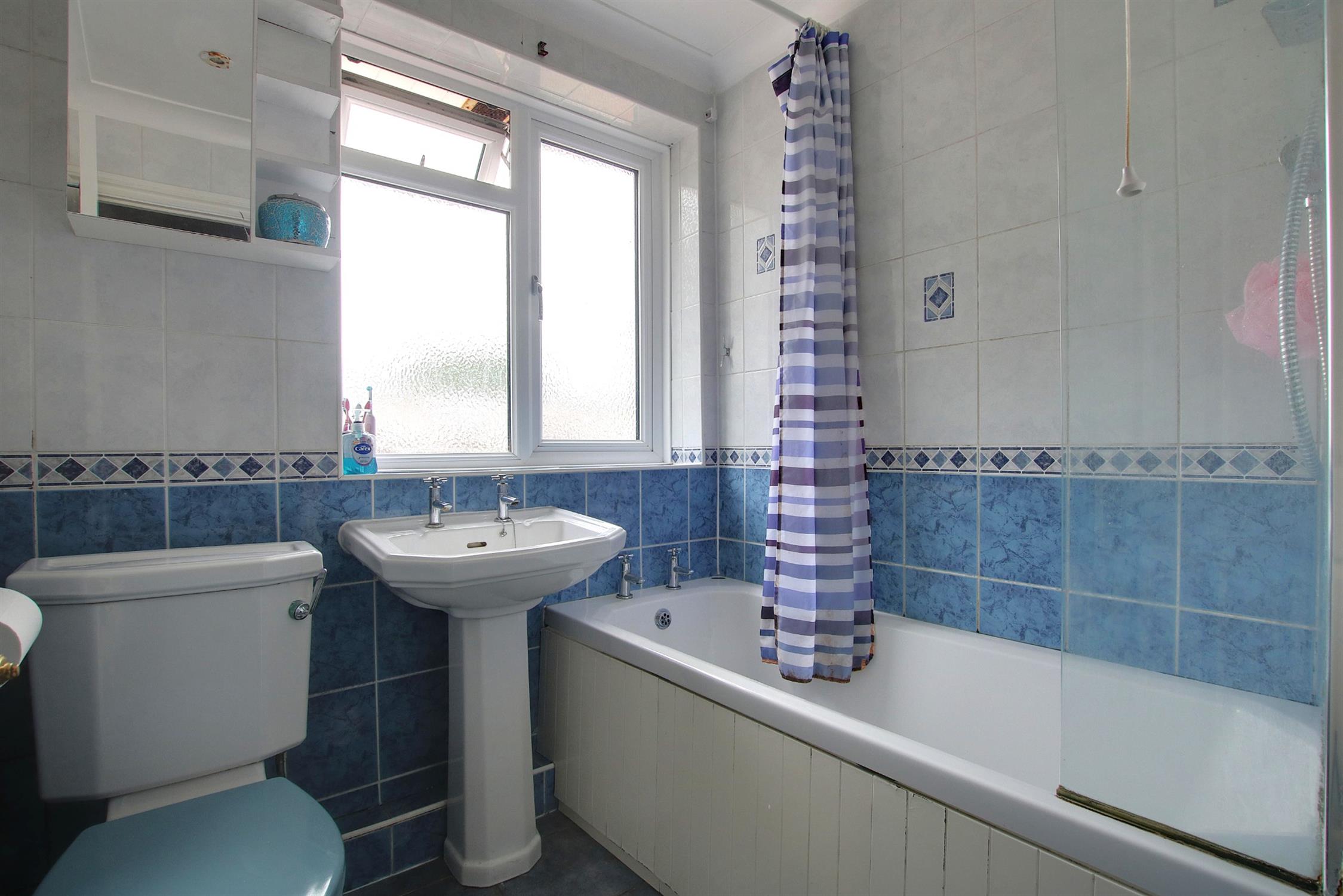 Attractive white suite comprising panel enclosed bath with shower over and shower screen, pedestal wash basin, low-level WC, tiled walls and floor, double-glazed window to the rear, radiator.