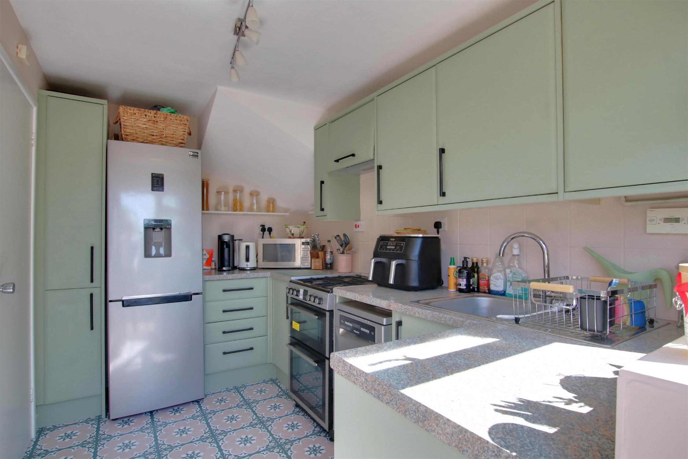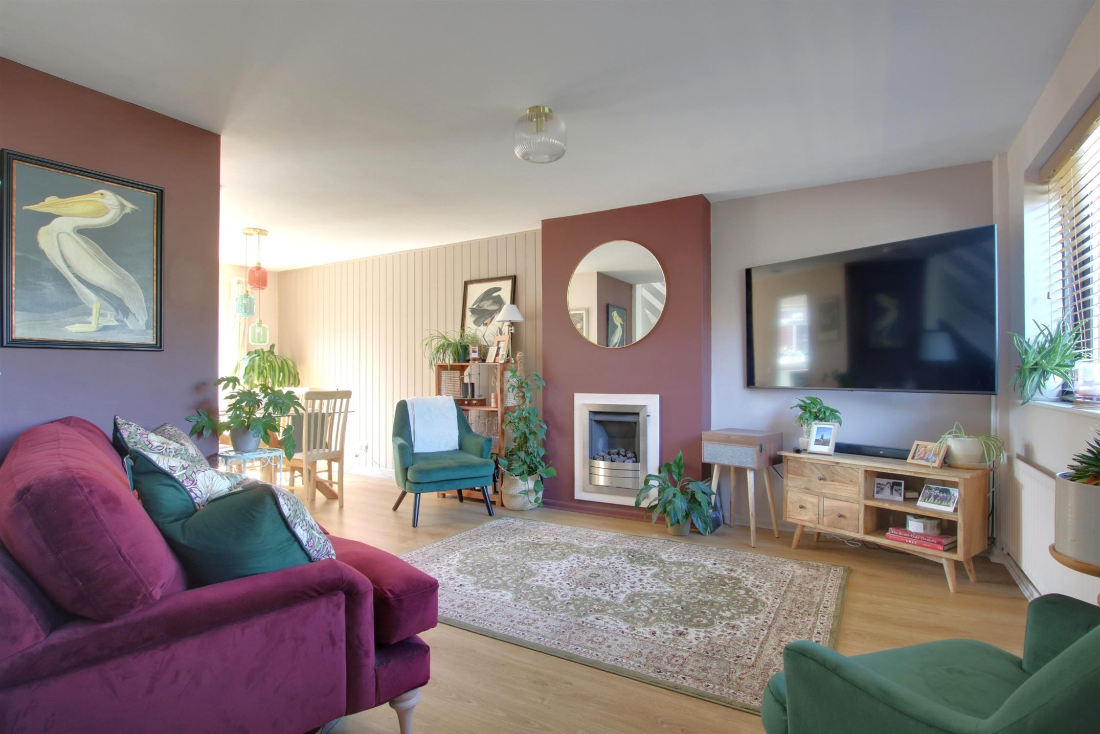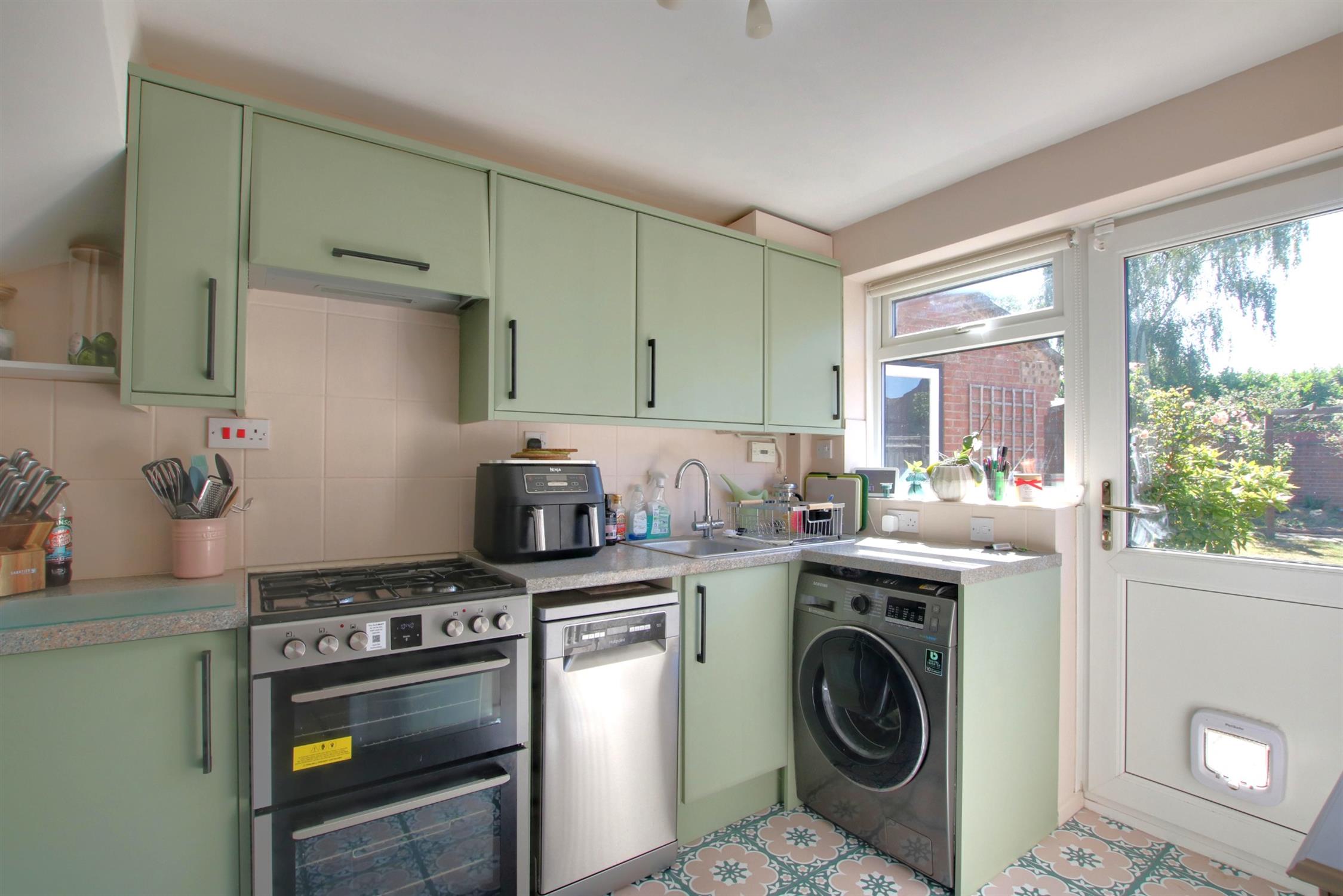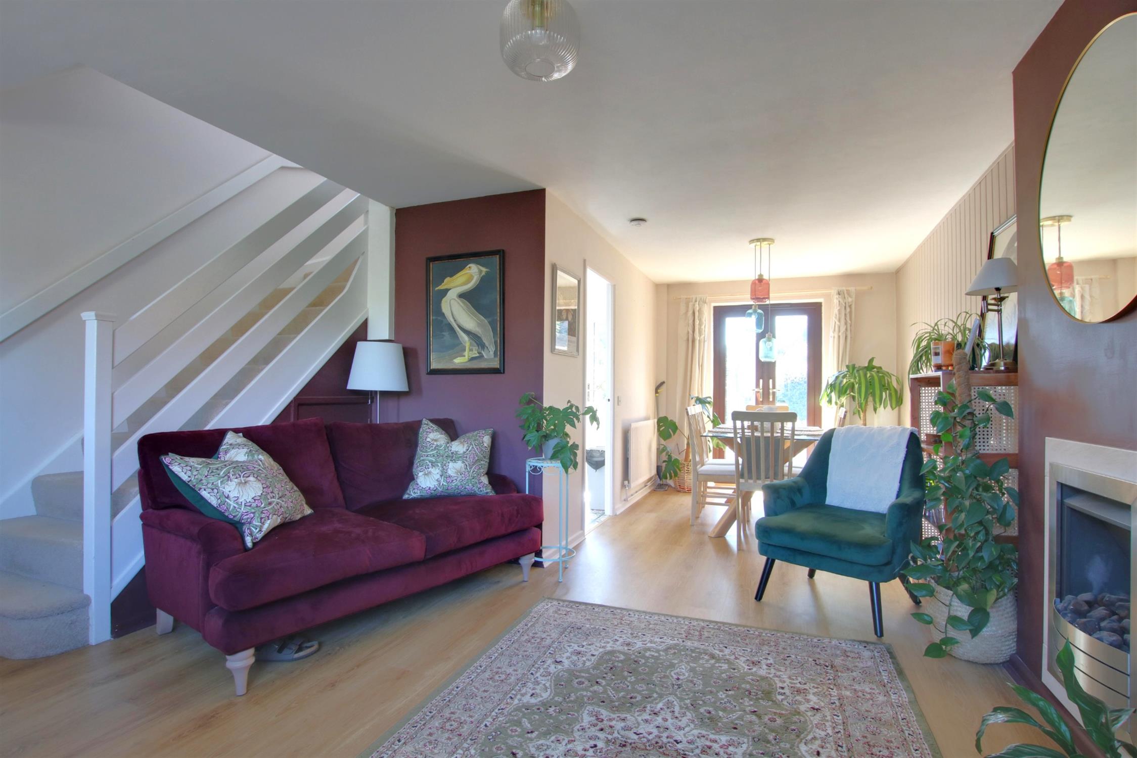 A useful porch leads into a bright and airy sitting/dining room, where dual-aspect windows fill the space with natural light. The room is centred around a charming gas fireplace, creating a welcoming focal point, while double doors open directly onto the rear patio for seamless indoor-outdoor living. The well-appointed kitchen offers a range of wall and base units, with ample workspace and storage. There’s space for a fridge/freezer, a cooker with extractor hood above, and plumbing for a washing machine. A door provides convenient access out to the rear garden.