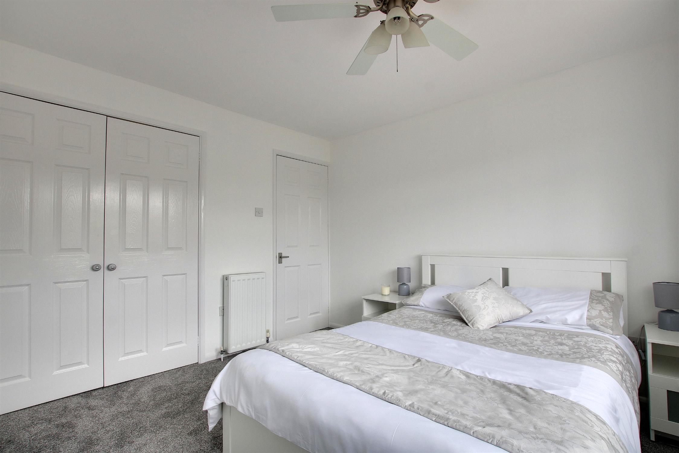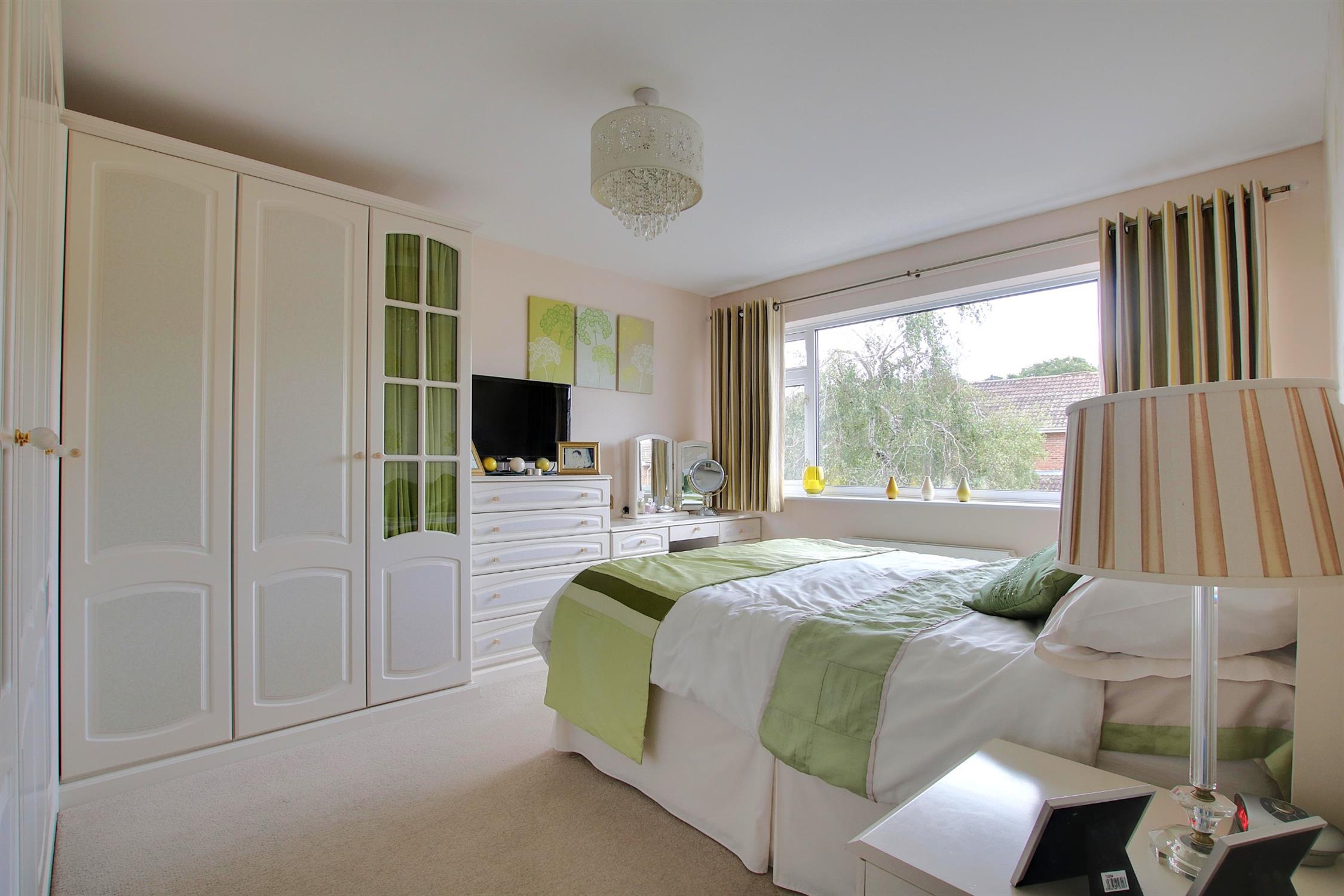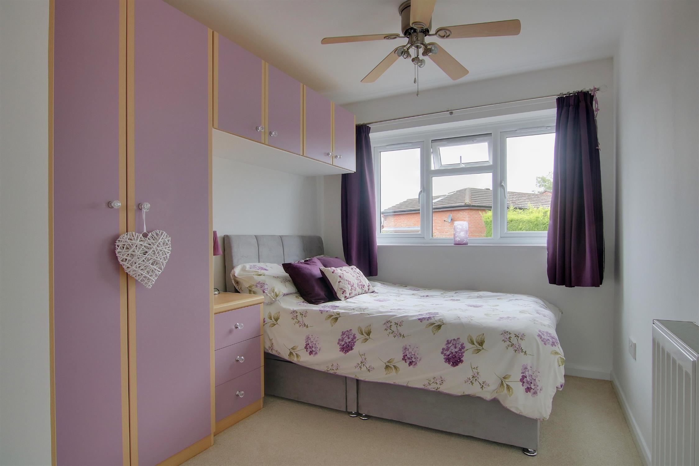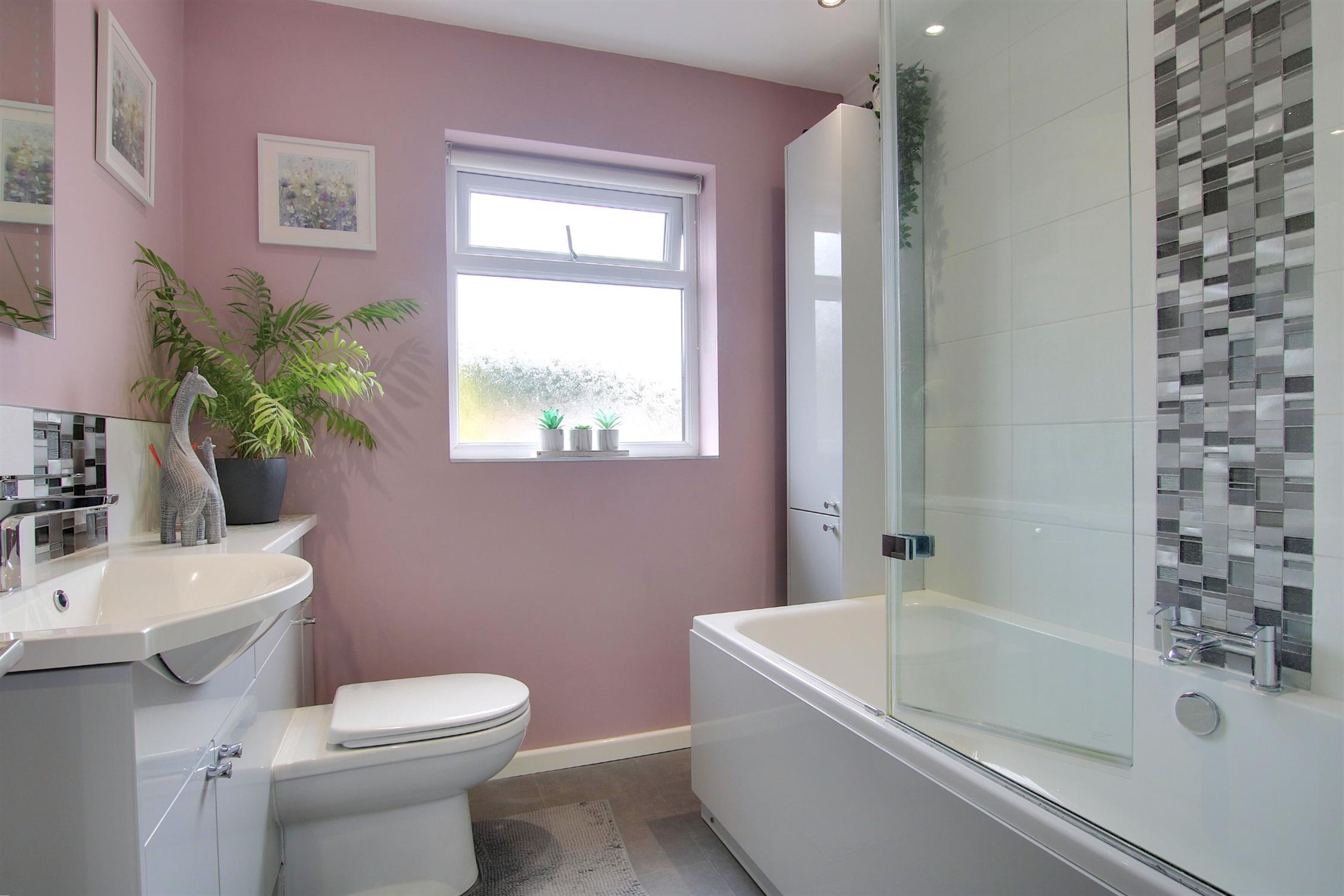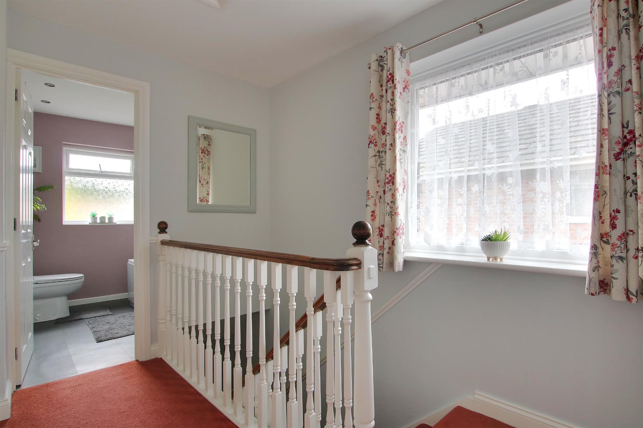 The first floor landing provides access to the insulated and part boarded loft space, and also houses the airing cupboard which contains both the Worcester central heating boiler and pressurized hot water tank. There are three bedrooms all of which will take a double bed and all with built-in storage. These share the modern, tastefully appointed family bathroom which comprises panel-enclosed bath with shower over, integrated wash basin and WC, heated towel rail, and complementary tiling.