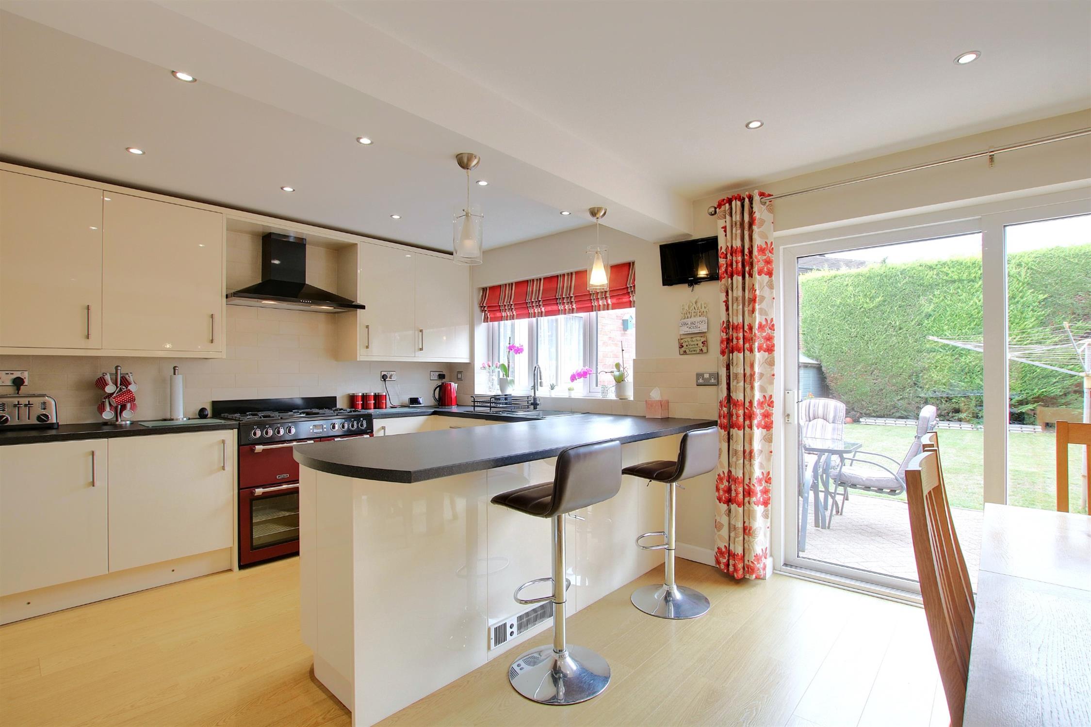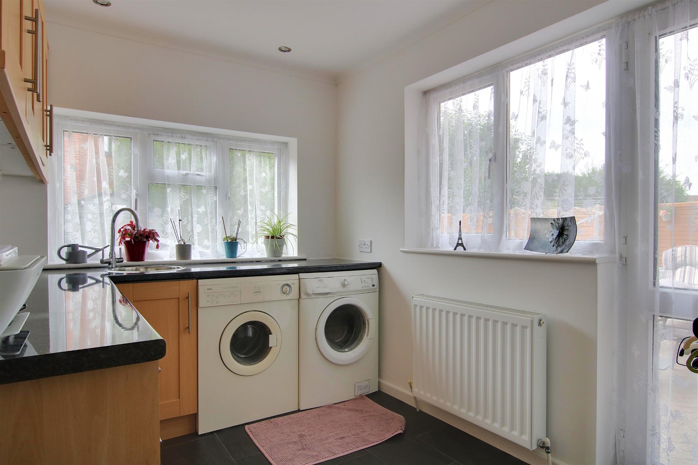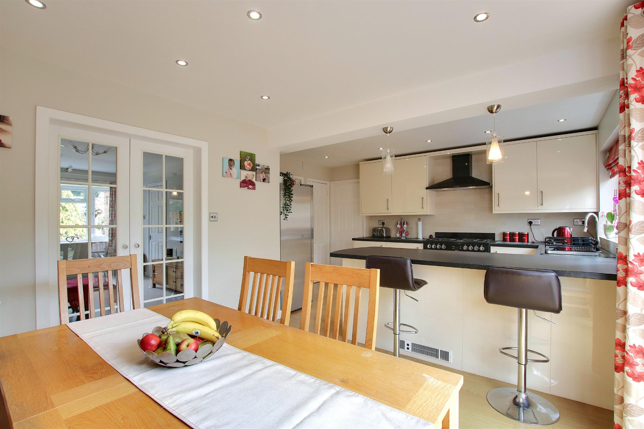A small porch opens into a welcoming entrance hall with stairs to the first and an adjoining cloakroom with WC. The good size sitting room has a wide front-facing bow window and double doors opening into the large kitchen/dining room. This is a bright open space perfectly suited to the needs of a modern family with sliding doors to the garden and a well fitted kitchen area with an excellent range of modern units, integrated dishwasher, and space for American-style fridge/freezer and range-style cooker. Adjoining the kitchen is a versatile family room which could be used as an occasional fourth bedroom, and from here are doors into the garage and a very useful well-appointed utility room.