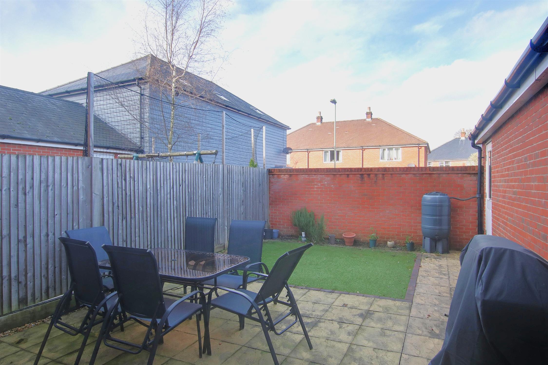 Externally, the property is approached via a small front garden with a paved pathway leading to the front entrance. To the side, a driveway provides off-road parking for two vehicles and leads to a garage with power and lighting. The rear garden enjoys a pleasant aspect and has been thoughtfully landscaped with a level artificial lawn and complementary patio areas, creating a secure and low-maintenance space ideal for family recreation and outdoor entertaining.