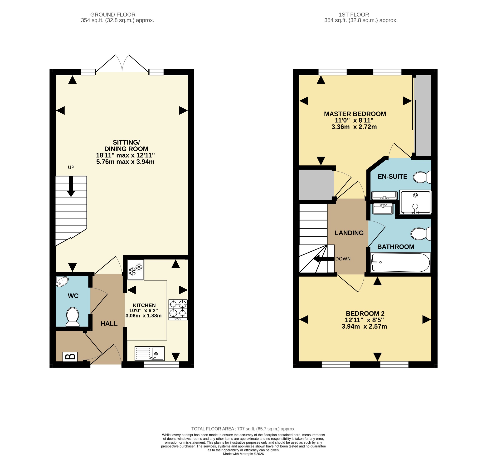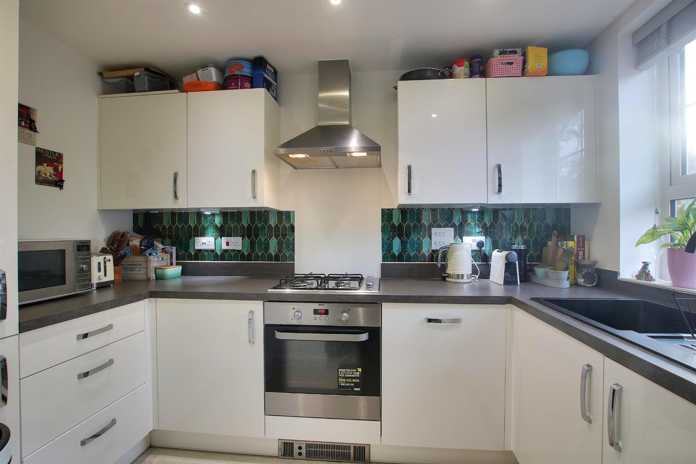 Fitted with an excellent range of attractive wall and base units with work surfaces over and pattern-tiled splashbacks, inset single-drainer sink with mixer tap over, range of integrated appliances to include electric oven, 4-ring gas hob with stainless steel extractor hood over, fridge/freezer, washer/drier and dishwasher, double-glazed window to the front.
