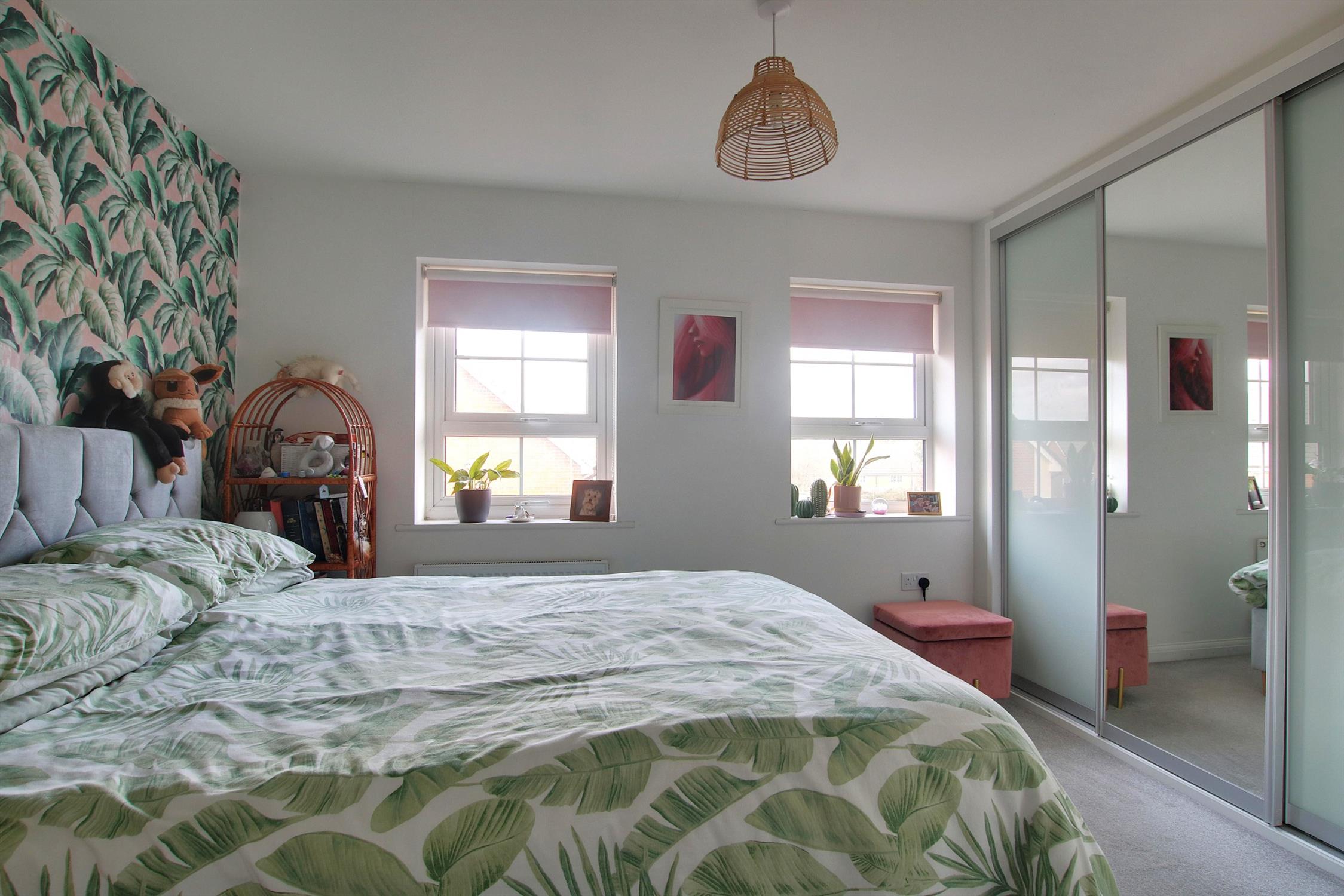 A double room with radiator, range of built-in wardrobes, two double-glazed windows to the rear. Door to:
