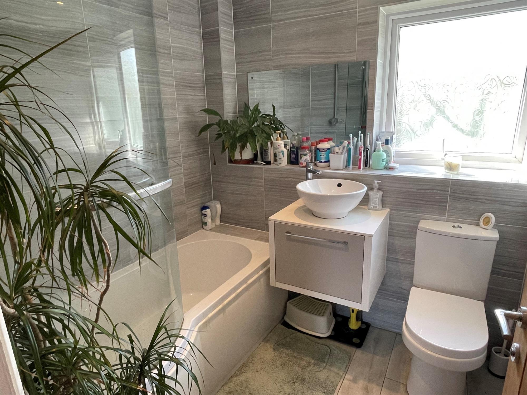 Window to rear. Low level WC. Contemporary wash hand basin with drawer below. 'P' shaped bath with shower over and glazed screen. Complementary tiling. Heated towel radiator.