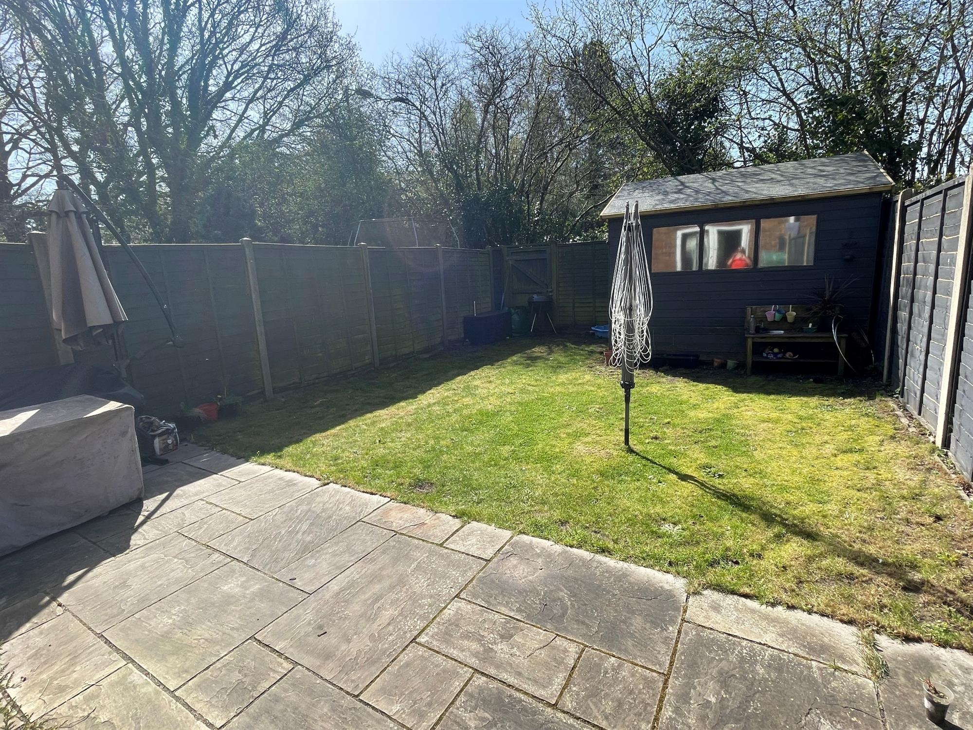 Fenced to boundaries. Laid to lawn. Paved patio. Timber garden shed. Outside tap.