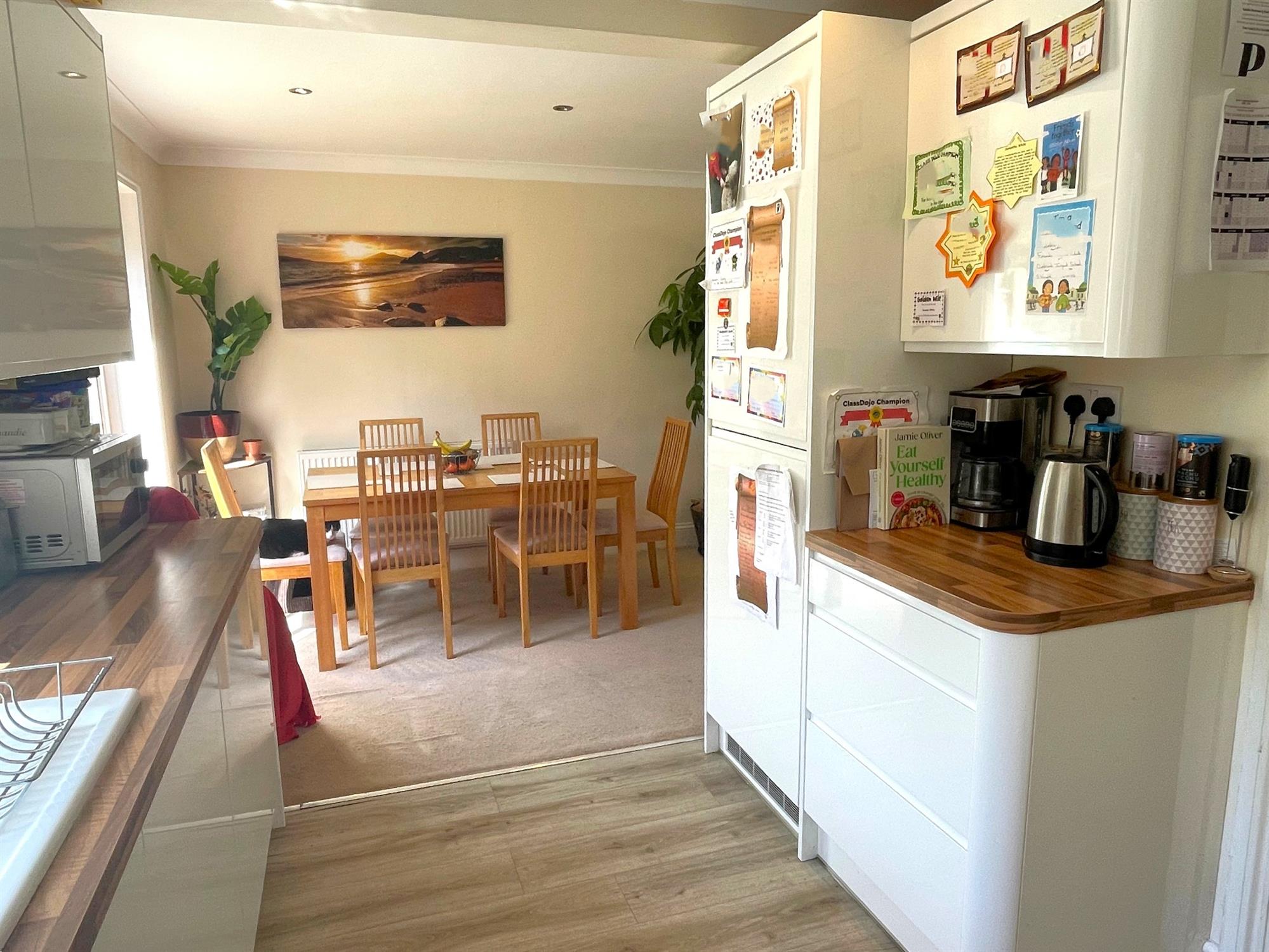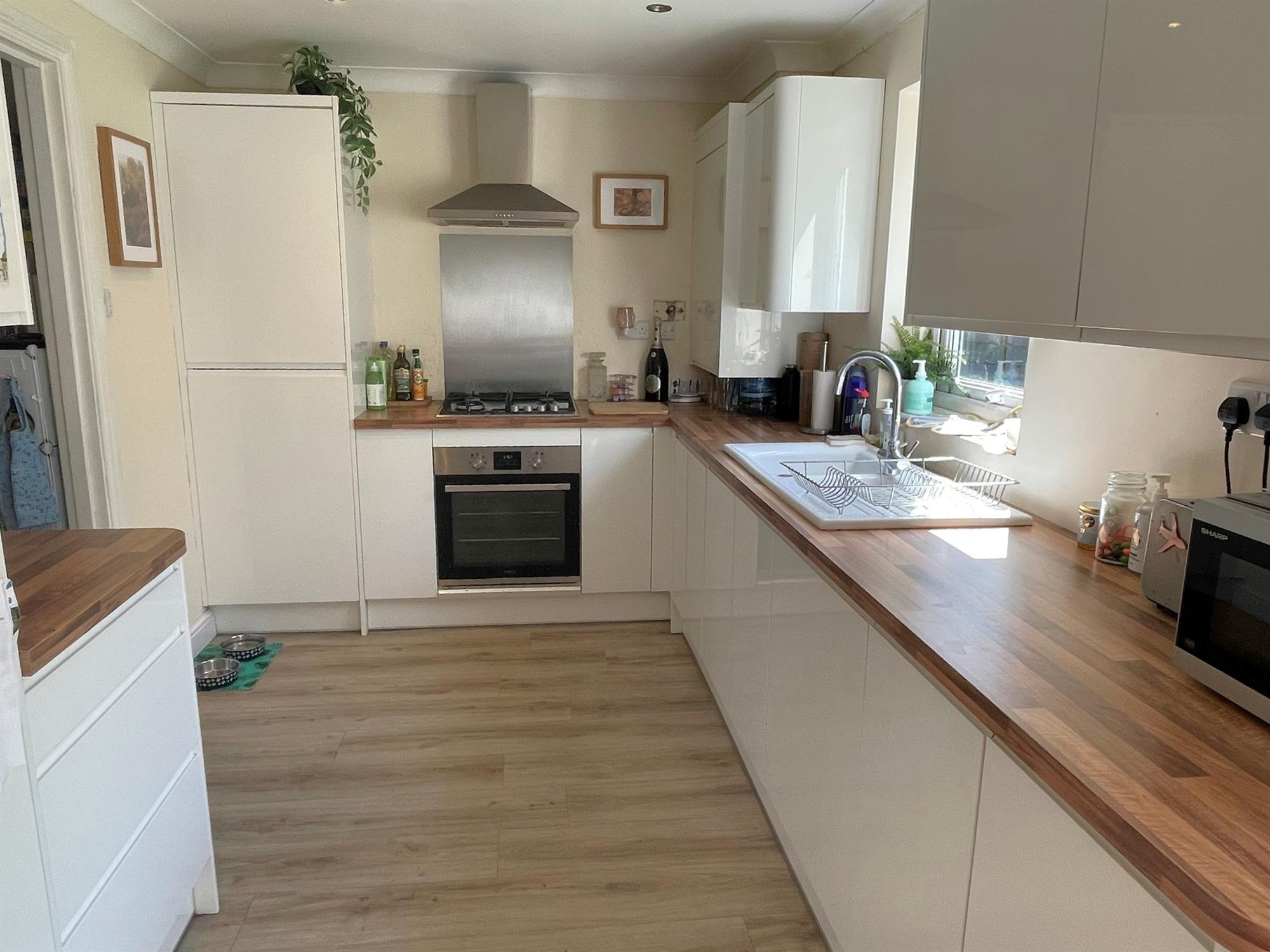 Range of wall and base units with work surfaces over. One and a half bowl sink unit with mixer tap. 4 ring gas hob with extractor over. Built in electric oven. Integrated dishwasher, washing machine and fridge freezer.