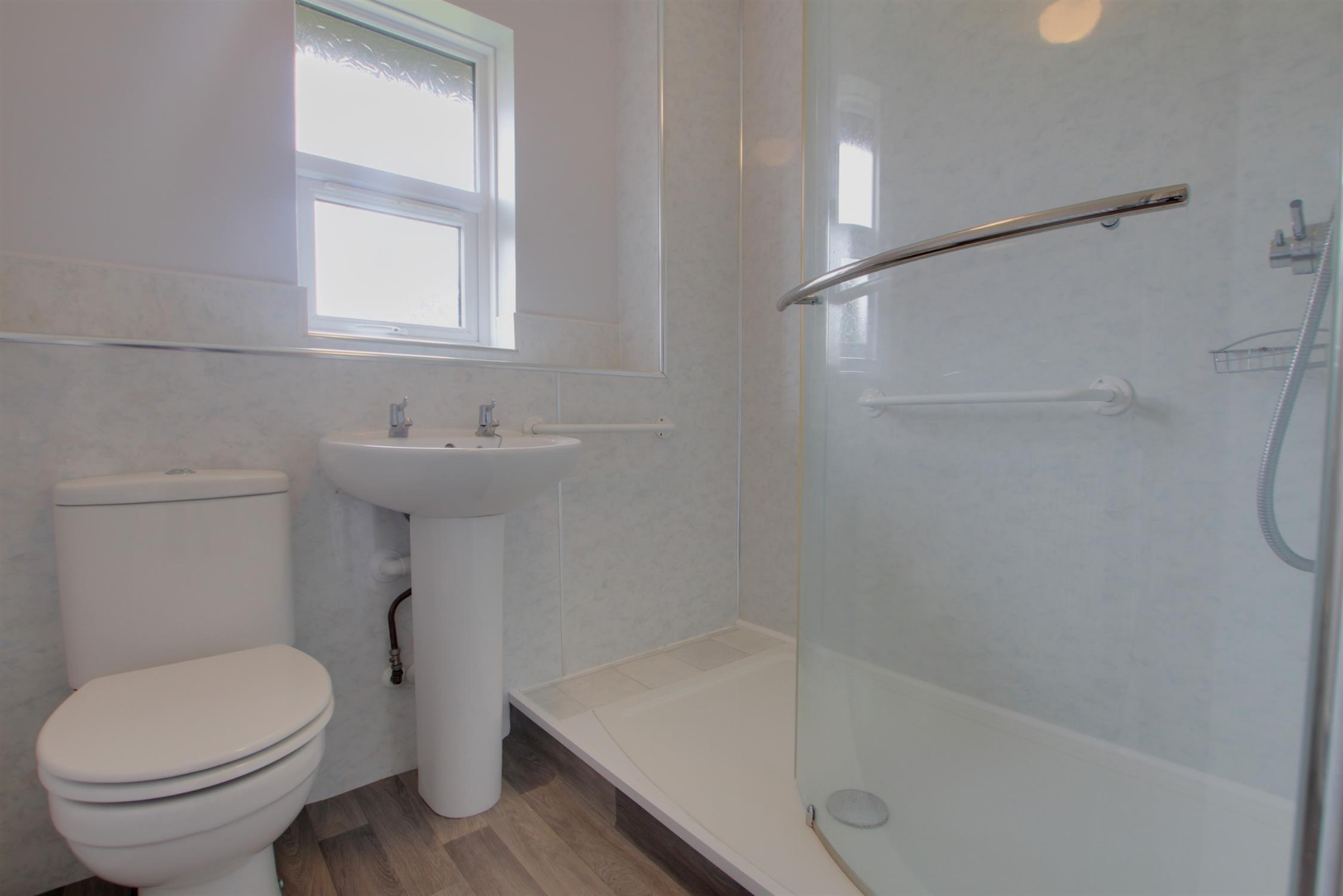 Obscured double glazed window to rear. White suite consists of close coupled WC, pedestal hand basin, large shower tray with wall mounted shower unit. Large bathroom wall panel, curved glass screen, handrails, grey wooden effect flooring. Radiator with individual thermostat.