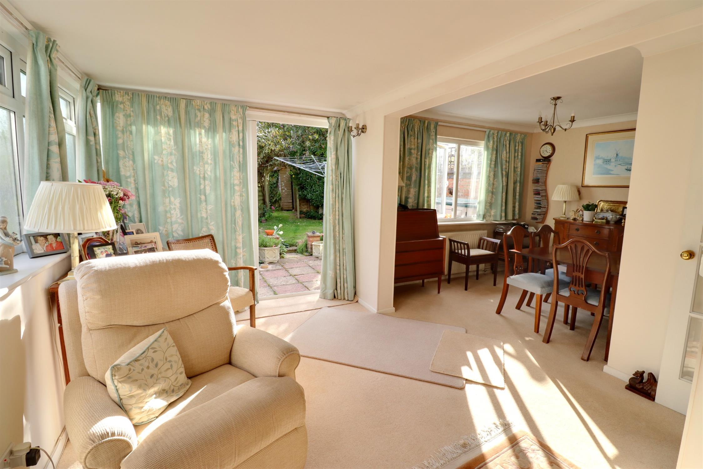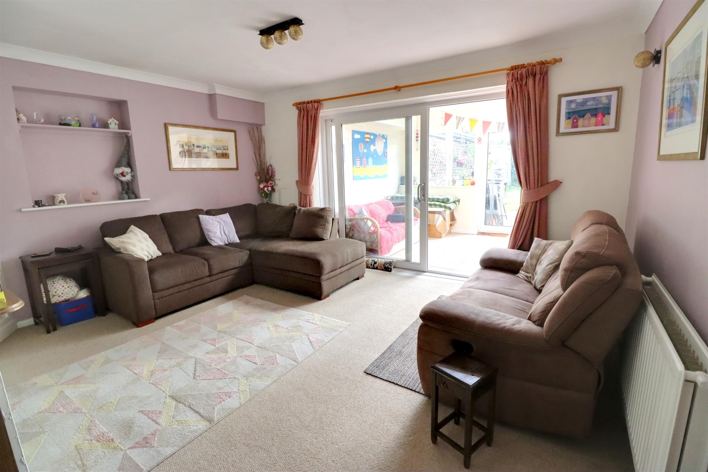 Double glazed sliding patio door to conservatory, chimney breast with inset gas fire, shelved alcove, TV storage unit, radiator.