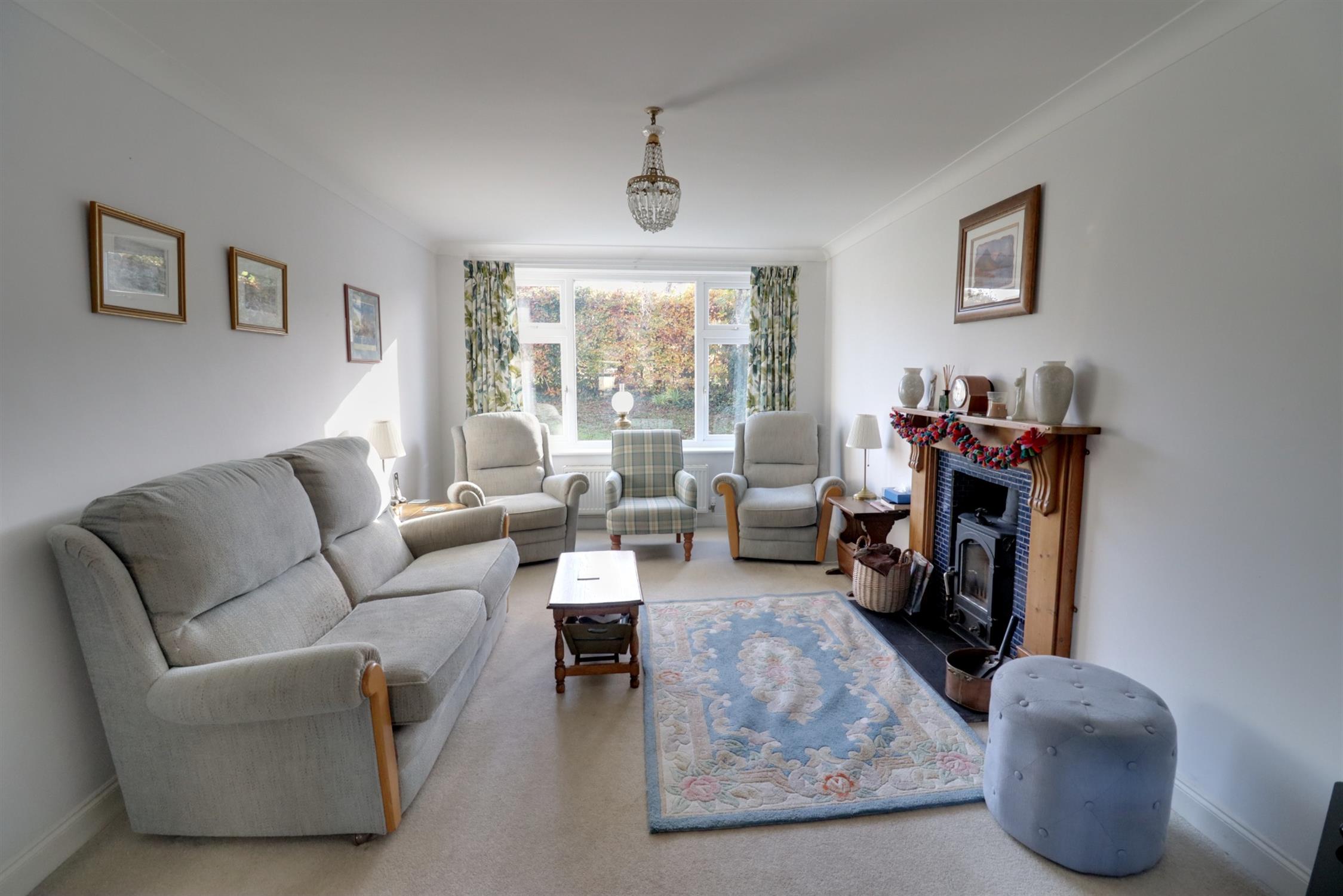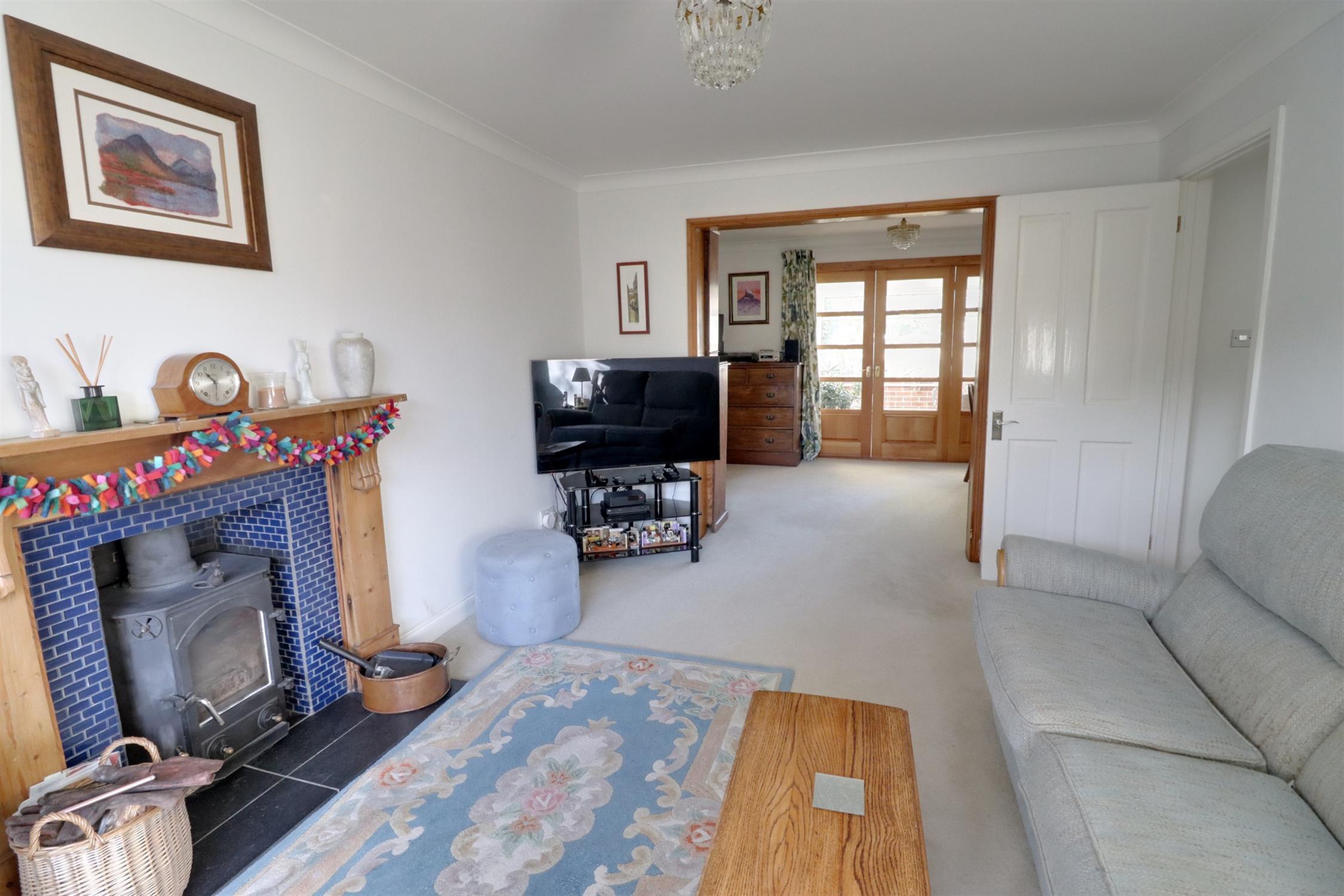 Front aspect double glazed window, radiator, multi fuel burner with wooden surround, open arch leading to the dining room.