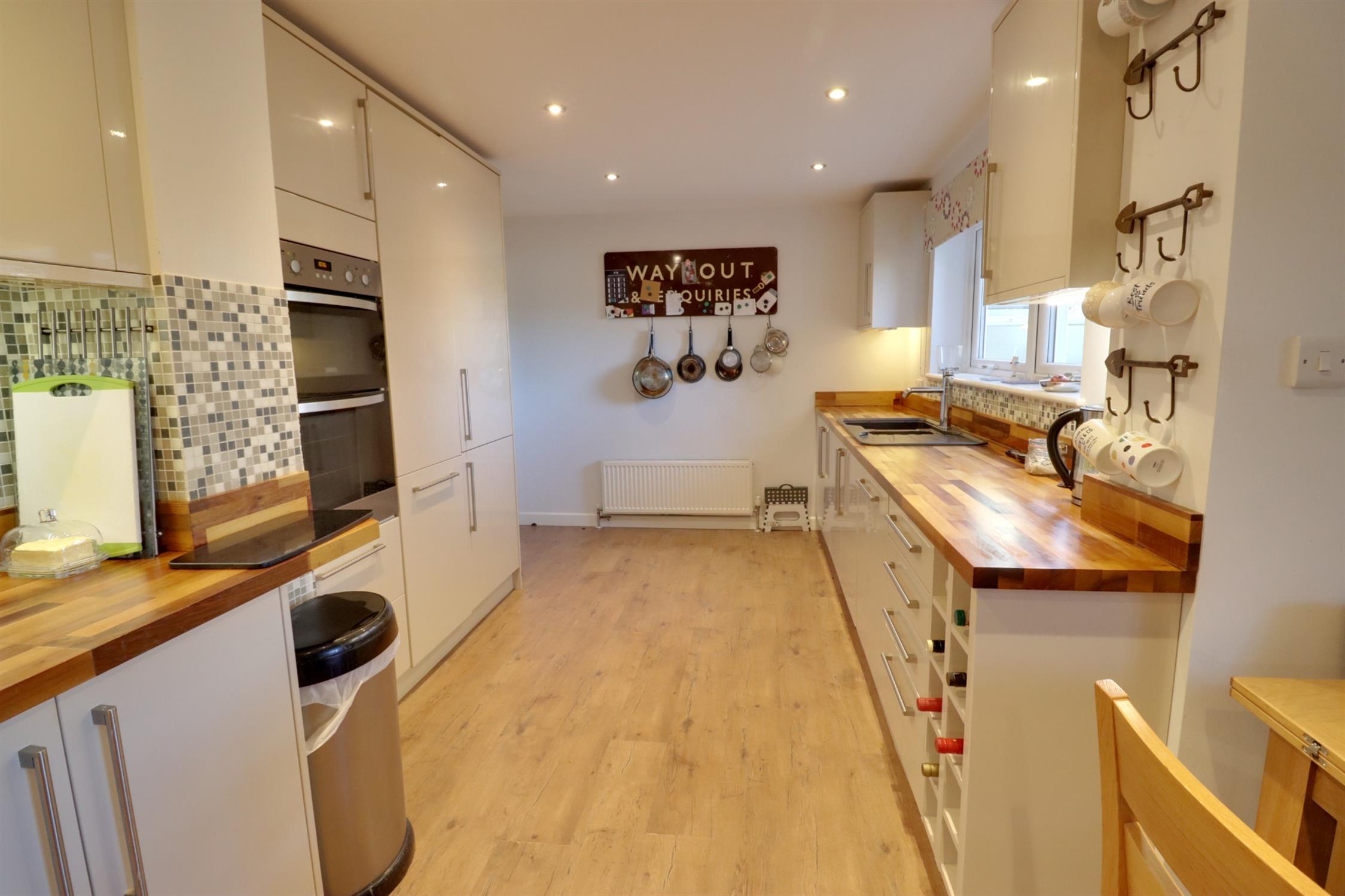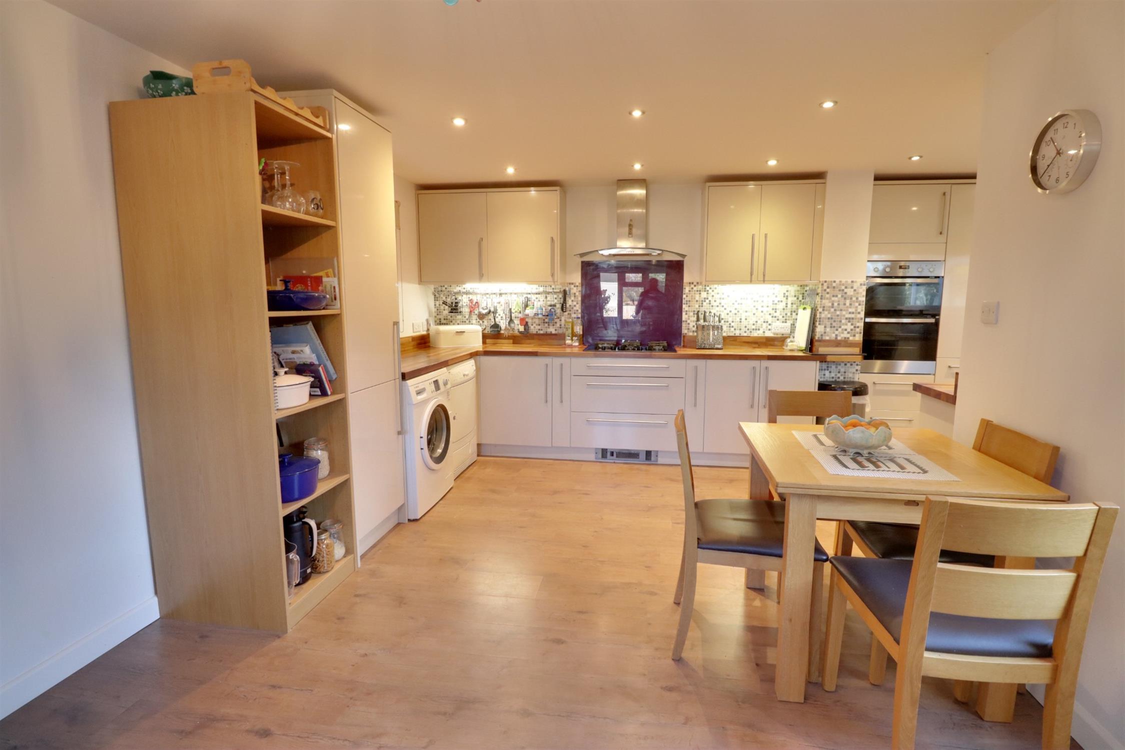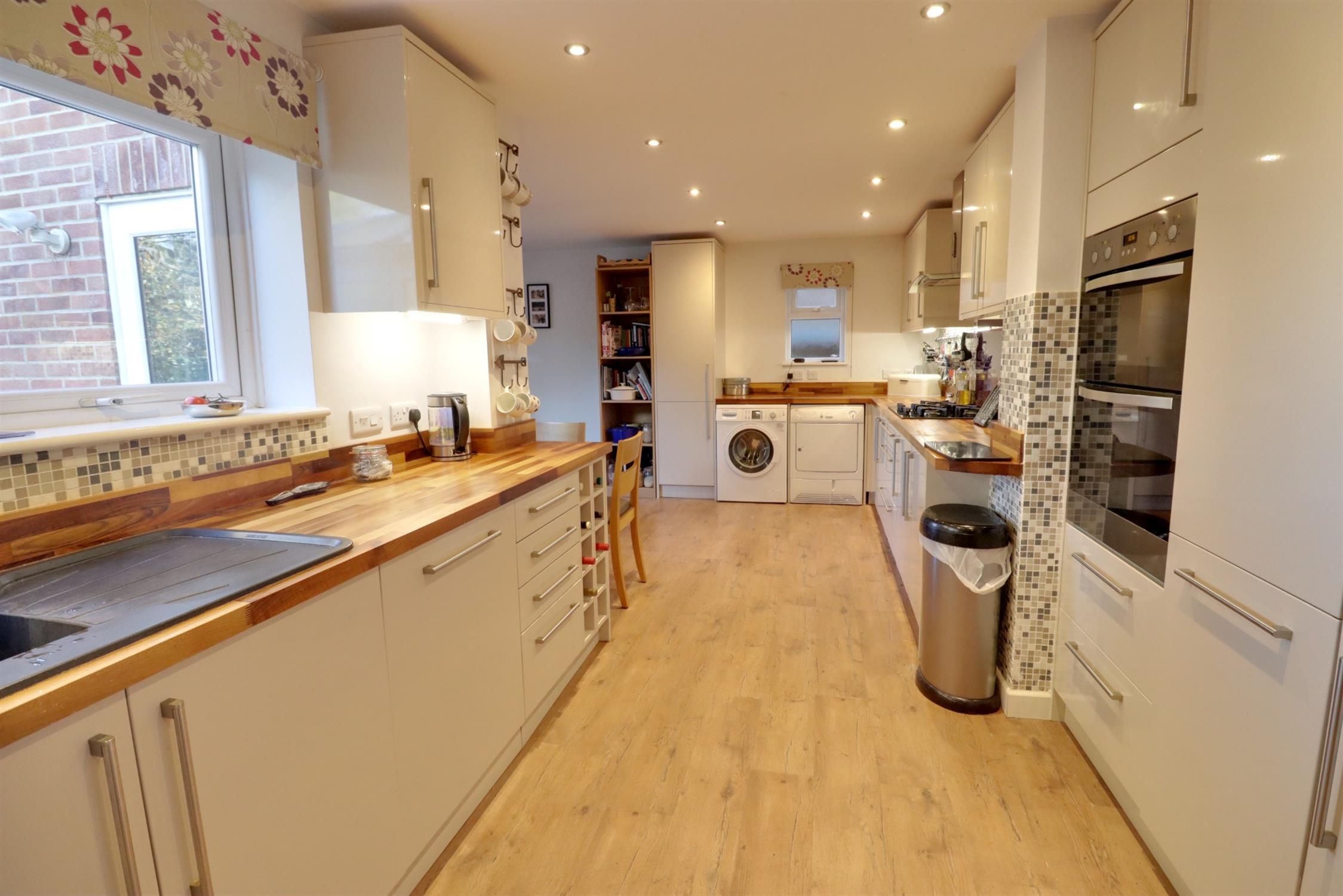 Fitted with a comprehensive range of wall and base units with work surfaces over, integral double oven and five ring gas hob with extractor hood over, integral fridge/freezer, space for washing machine and tumble dryer, one and a half bowl sink and drainer, two rear and one side aspect double glazed windows, side aspect double glazed door leading to the rear garden, radiator, laminate flooring.