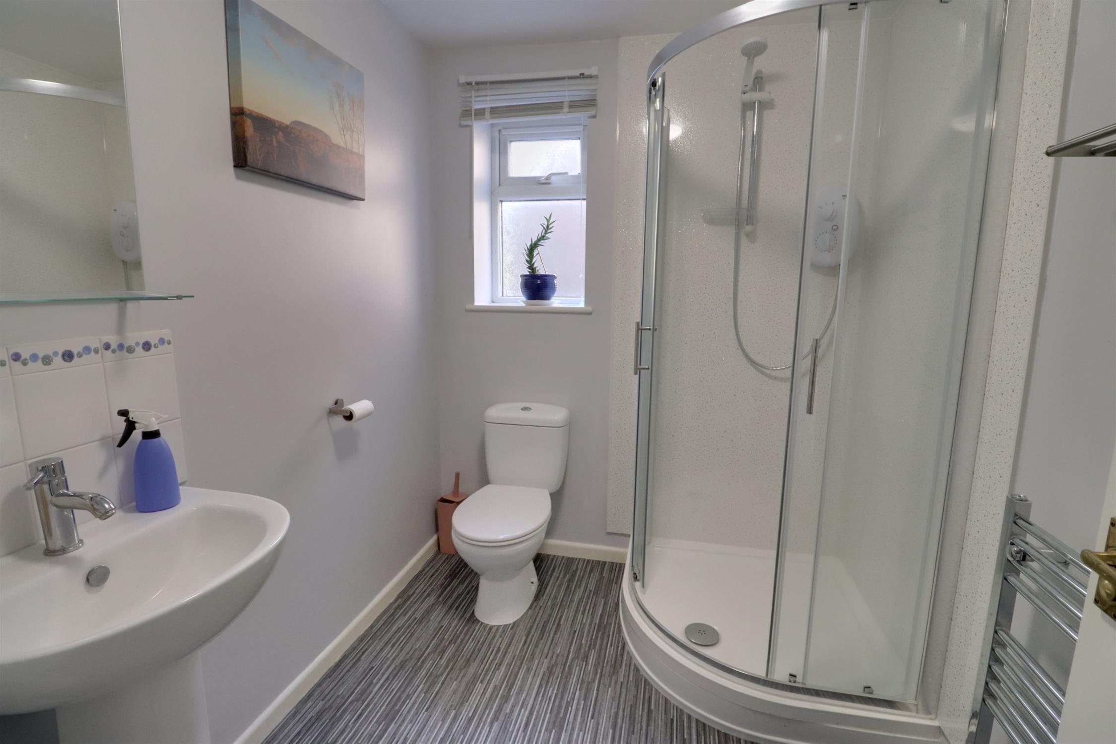 Modern re-fitted suite comprising corner shower cubicle with glass sliding doors, low level wc, wash basin in pedestal, heated towel rail, side aspect double glazed window.