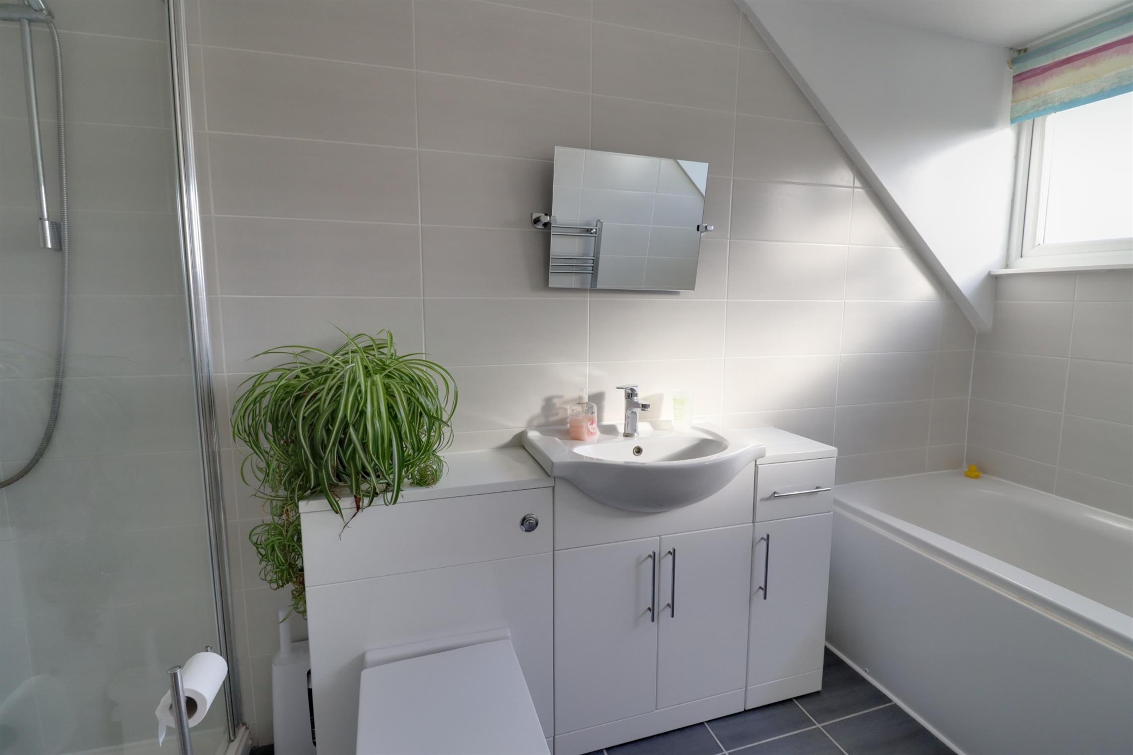 Modern re-fitted four piece suite comprising double ended bath, large shower enclosure with glass screen, concealed flush wc and vanity unit combination with built-in storage, heated towel rail, front aspect double glazed window, tiled walls and flooring.