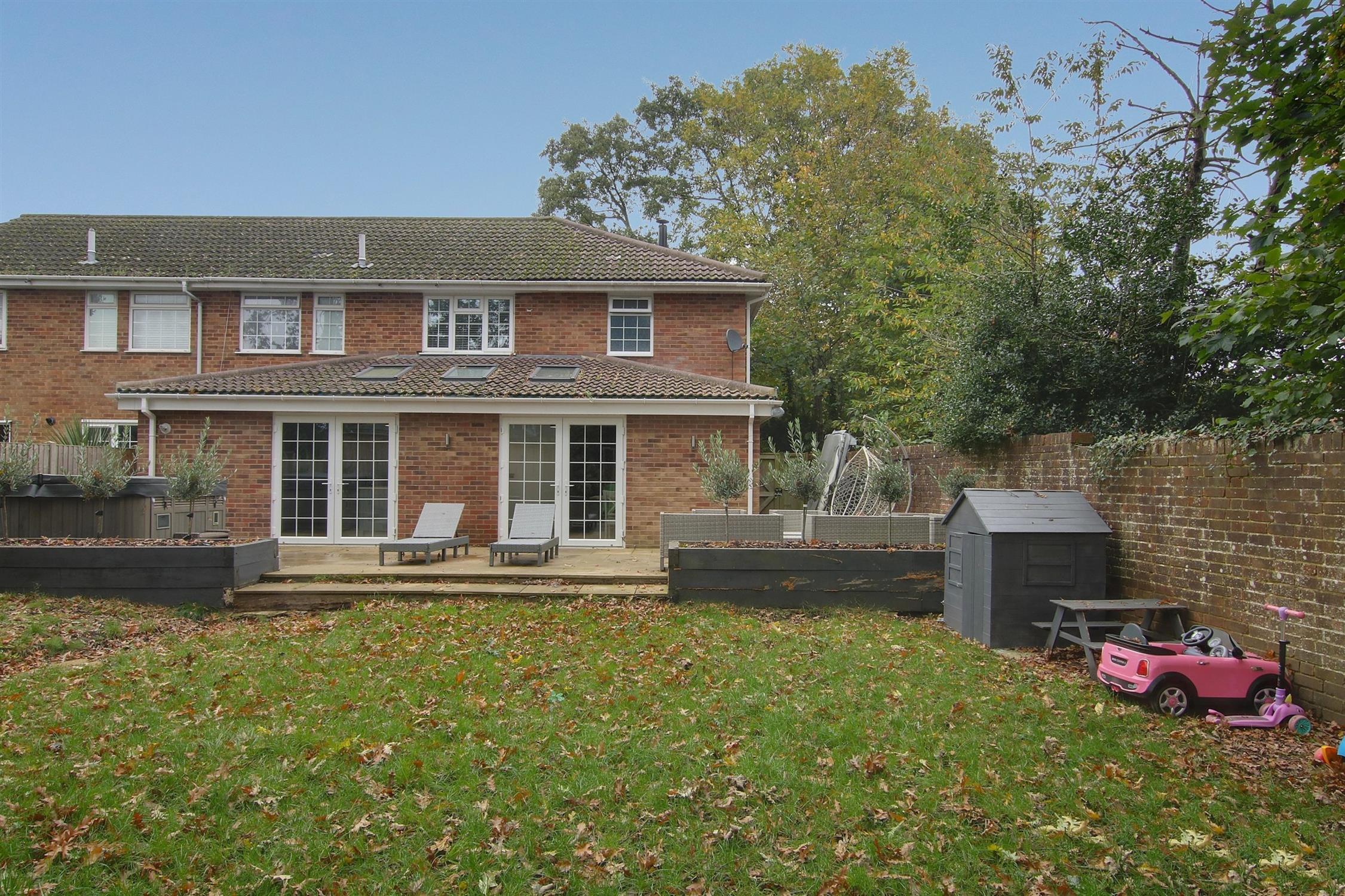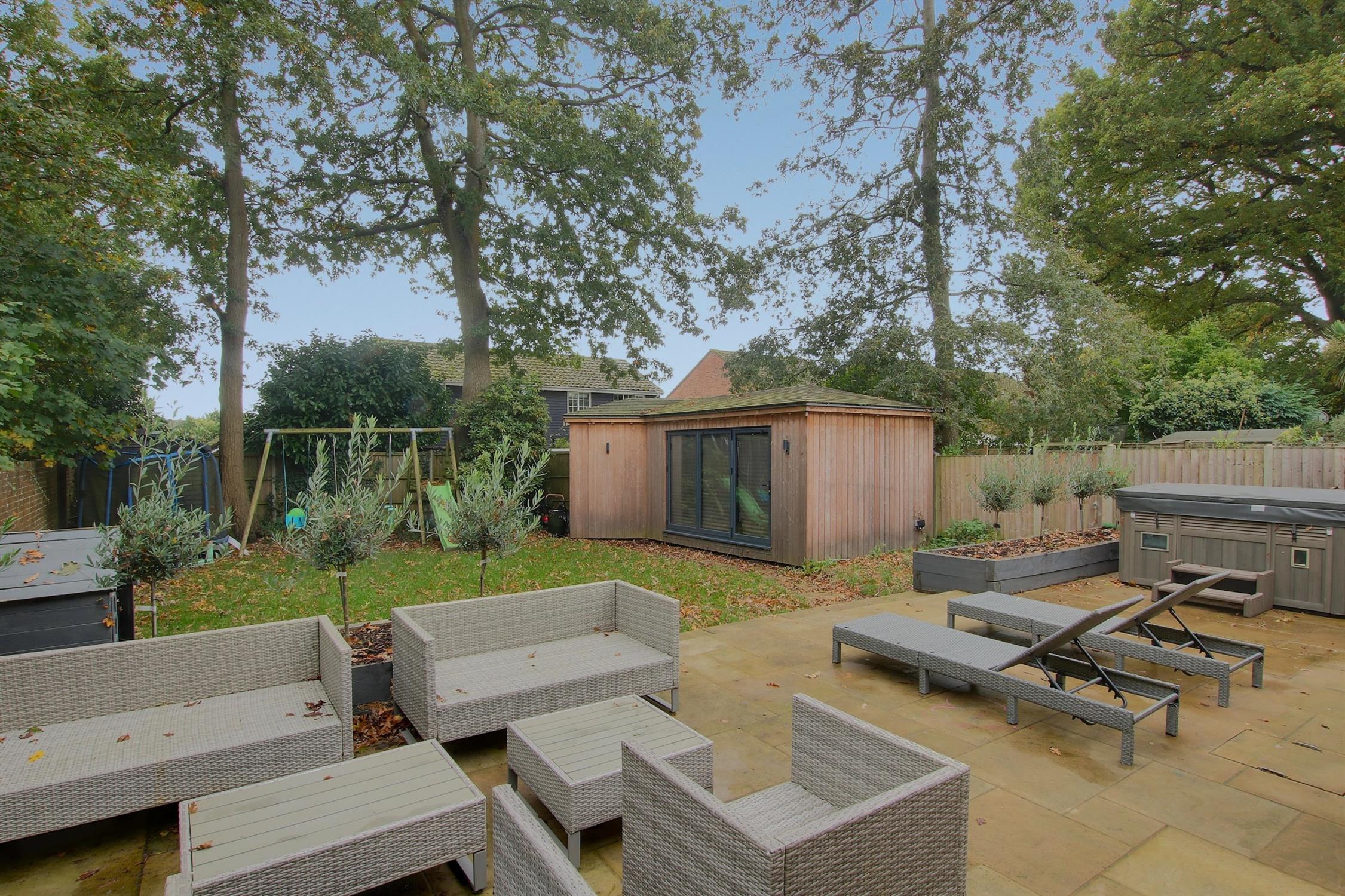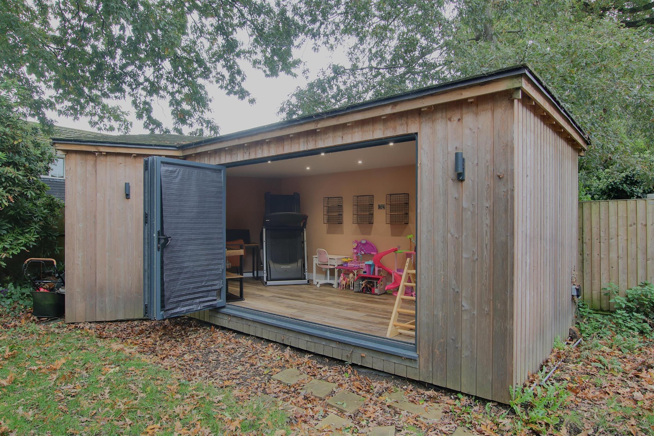 The beautifully landscaped gardens feature a large patio, spacious lawn, trees and shrubs, against a backdrop of attractive oak trees. The lodge style home office/annex has been designed with bi-folding doors opening into the garden and its own WC, ideal as a space to work from home or as handy extra guest accommodation. To the front, the home also offers ample parking, and an integral garage with a very smart tarmacadam driveway.