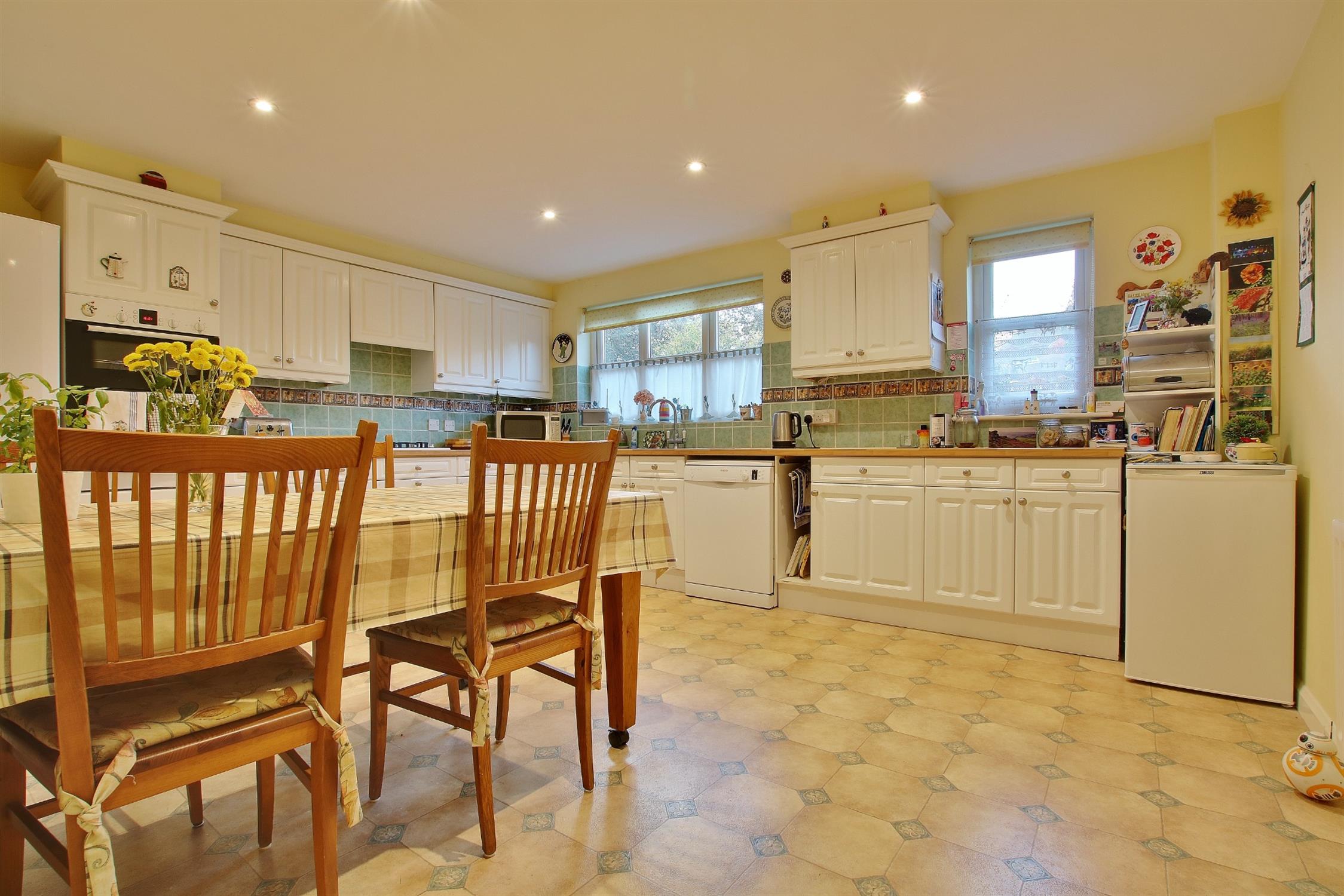 A range of wall and floor mounted units, one and a half bowl stainless steel sink with mixer tap and broad window above, four ring gas hob, fan assisted oven and grill, part tiled walls. Radiator.