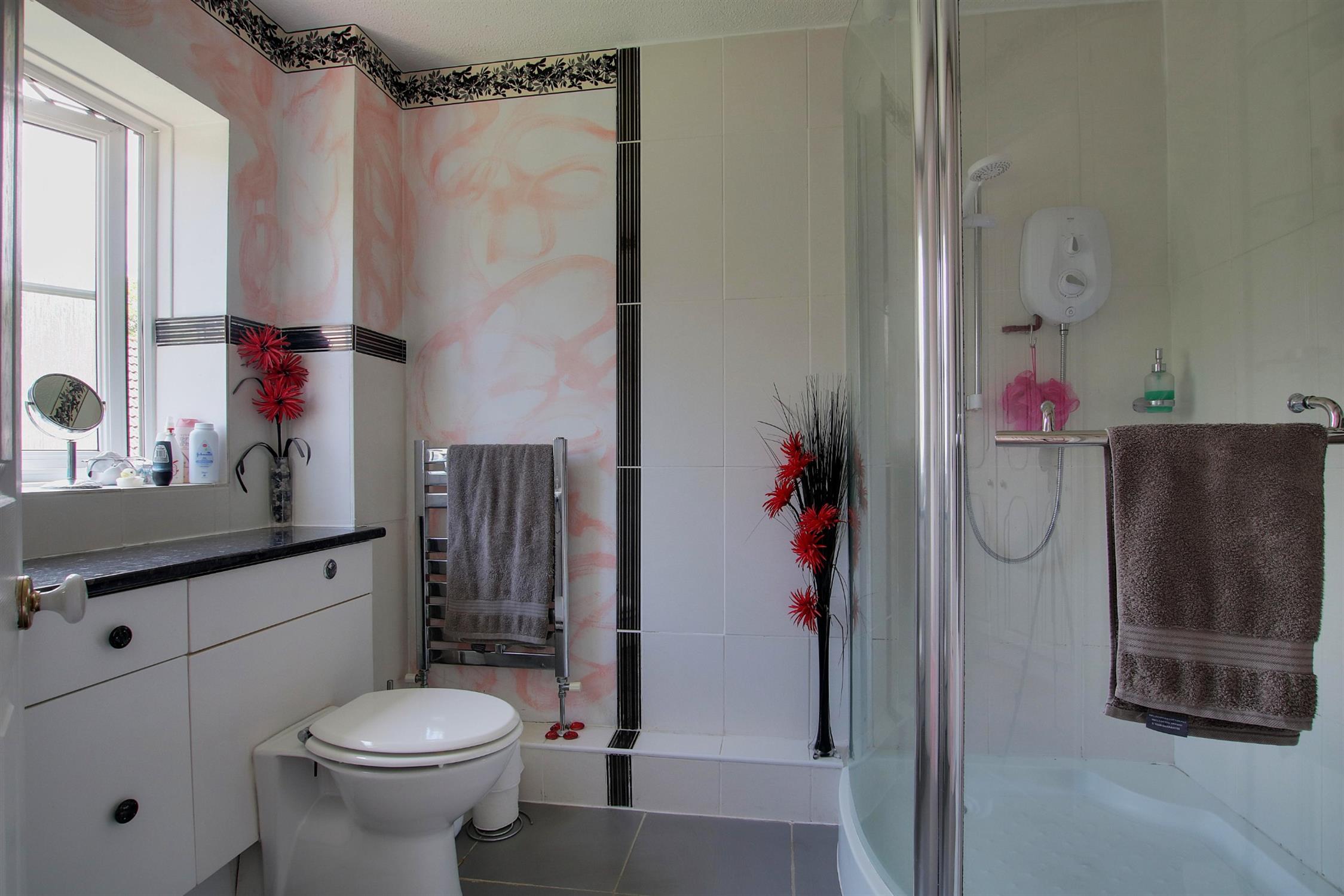 Fitted with a modern suite comprising tiled shower cubicle, integrated wash basin and WC, heated towel rail, double-glazed window to the rear, part-tiled walls and tiled floor.