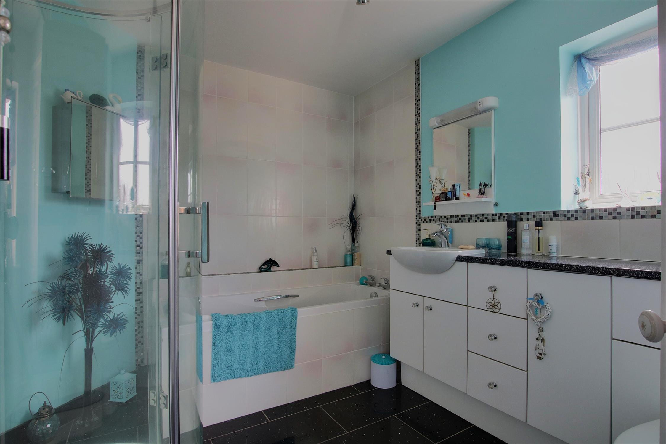 Fitted with a stylish modern suite comprising panel-enclosed bath, separate tiled shower cubicle, wash basin and WC with integrated storage, heated towel rail, double-glazed window to the side, part tiled walls and tiled floor.