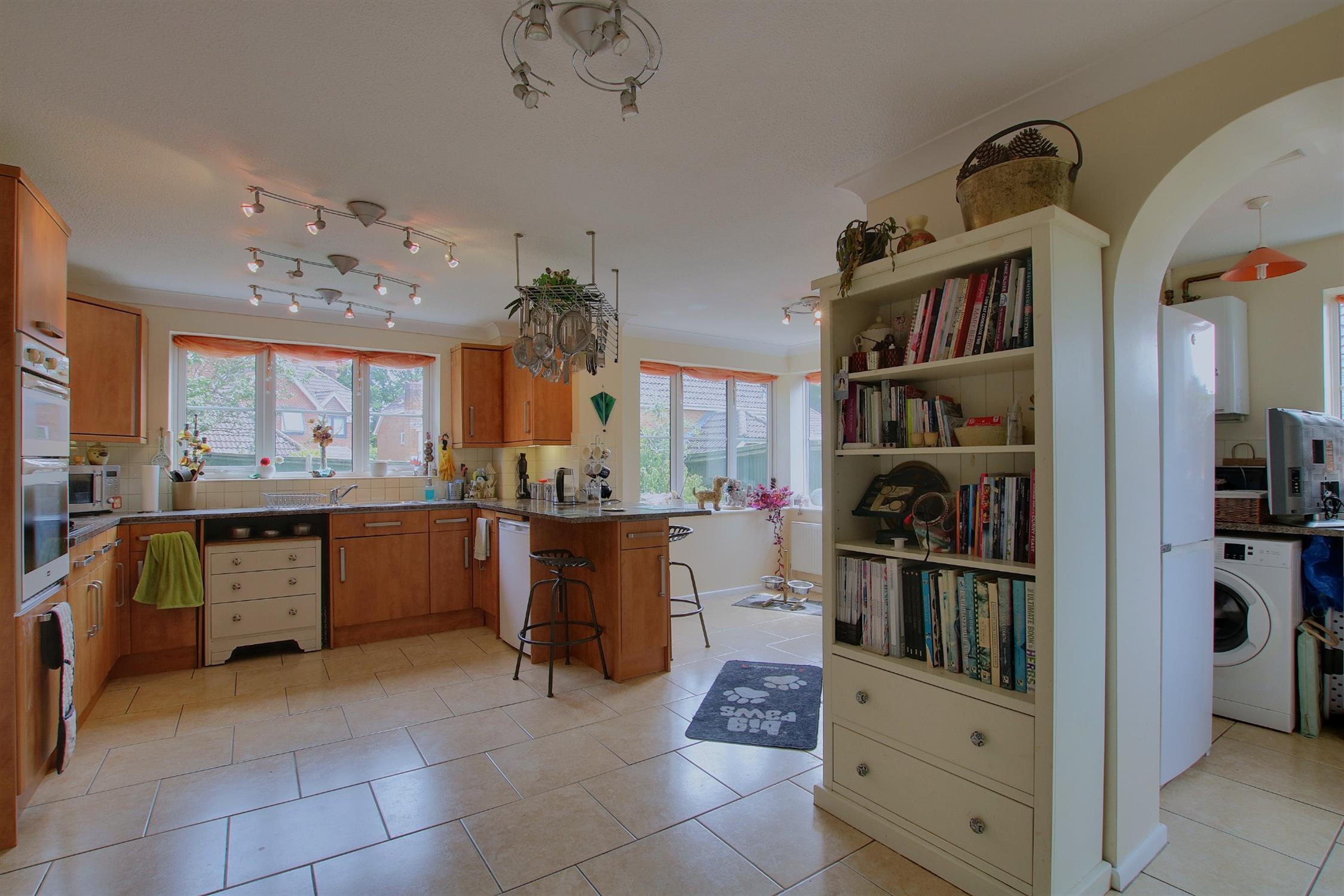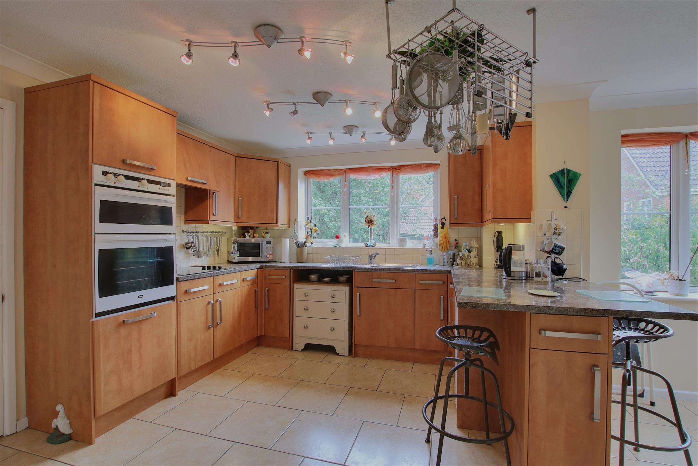 Comprehensively fitted with a range of wall and base units with worktops over, part-tiled walls, built-in electric double oven and hob with extractor hood over, inset stainless steel sink unit with mixer tap over, breakfast bar, double-glazed windows to the rear, tiled floor, two radiators, door to: