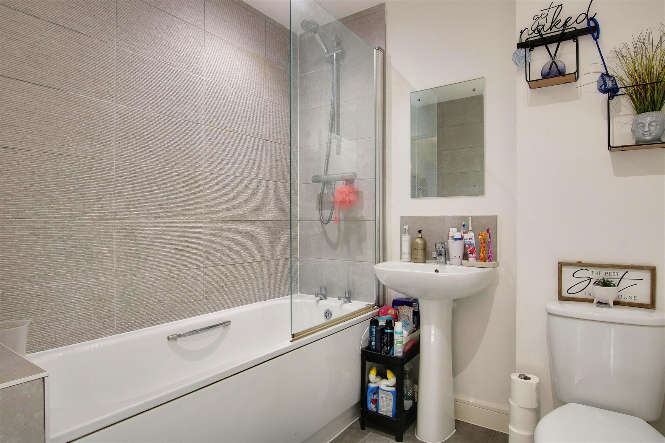 Contemporary white suite comprising panel enclosed bath with shower over and screen, pedestal wash basin, close-coupled WC, extractor fan, heated towel rail, part tiled walls.