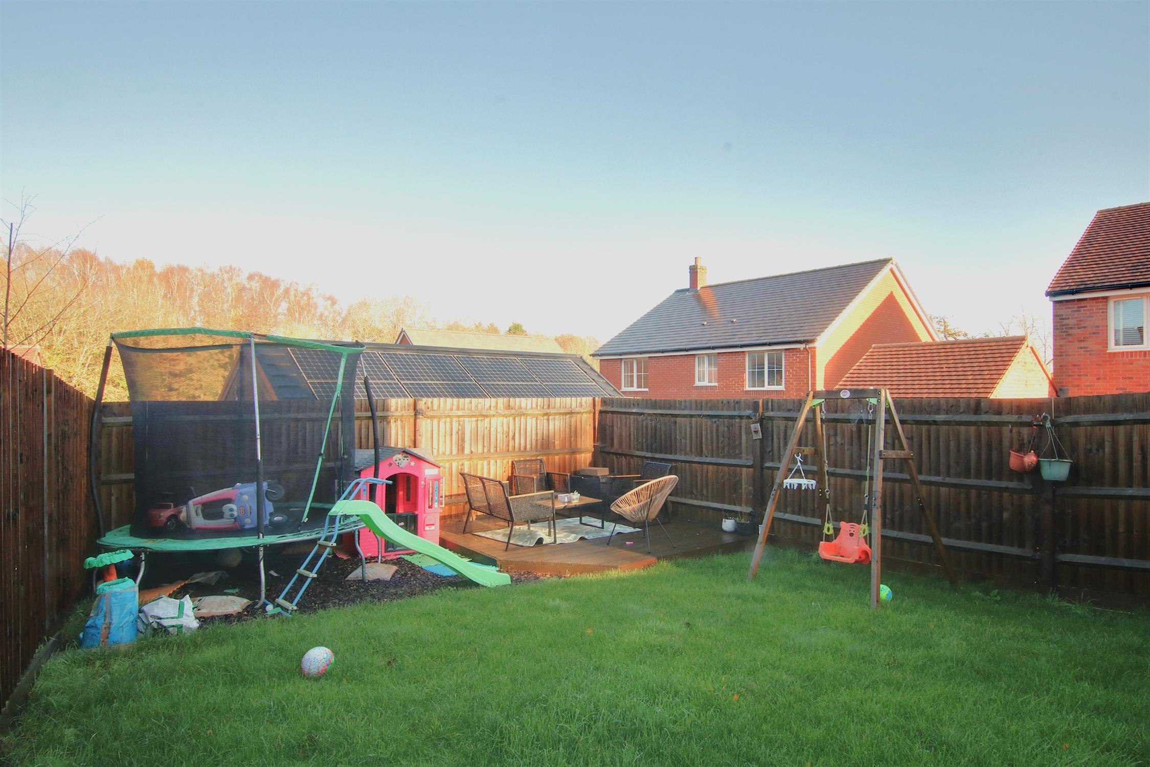Driveway to the side providing off-road parking for at least two cars. Gated access to the rear garden enclosed by close board fencing and mainly laid to lawn, with a raised deck ideal for barbecues etc. and a children's soft play area.