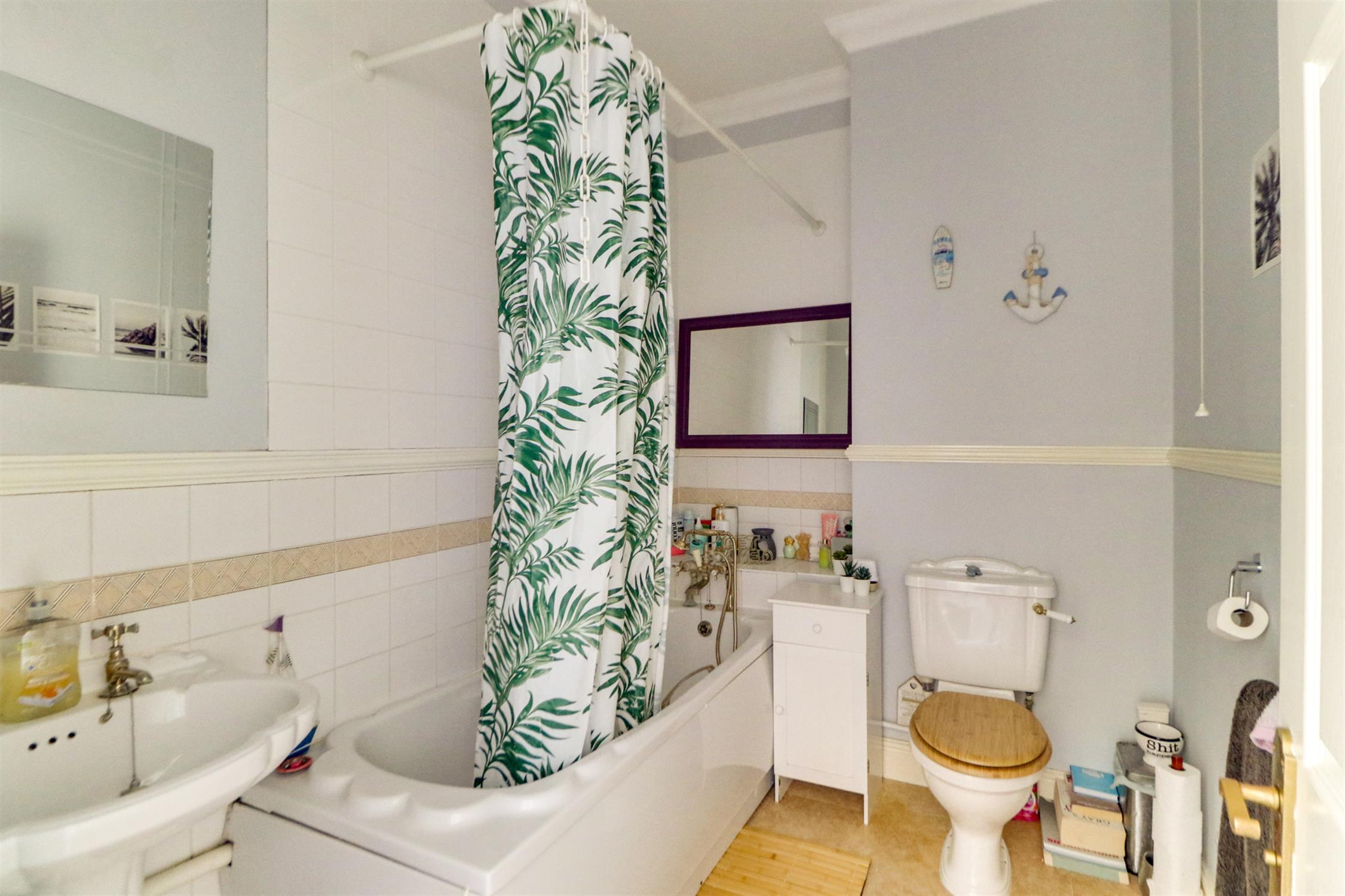 Smooth and coved ceiling, extractor fan, panelled bath with shower over, tiled splash back, low level W.C, radiator and vinyl flooring