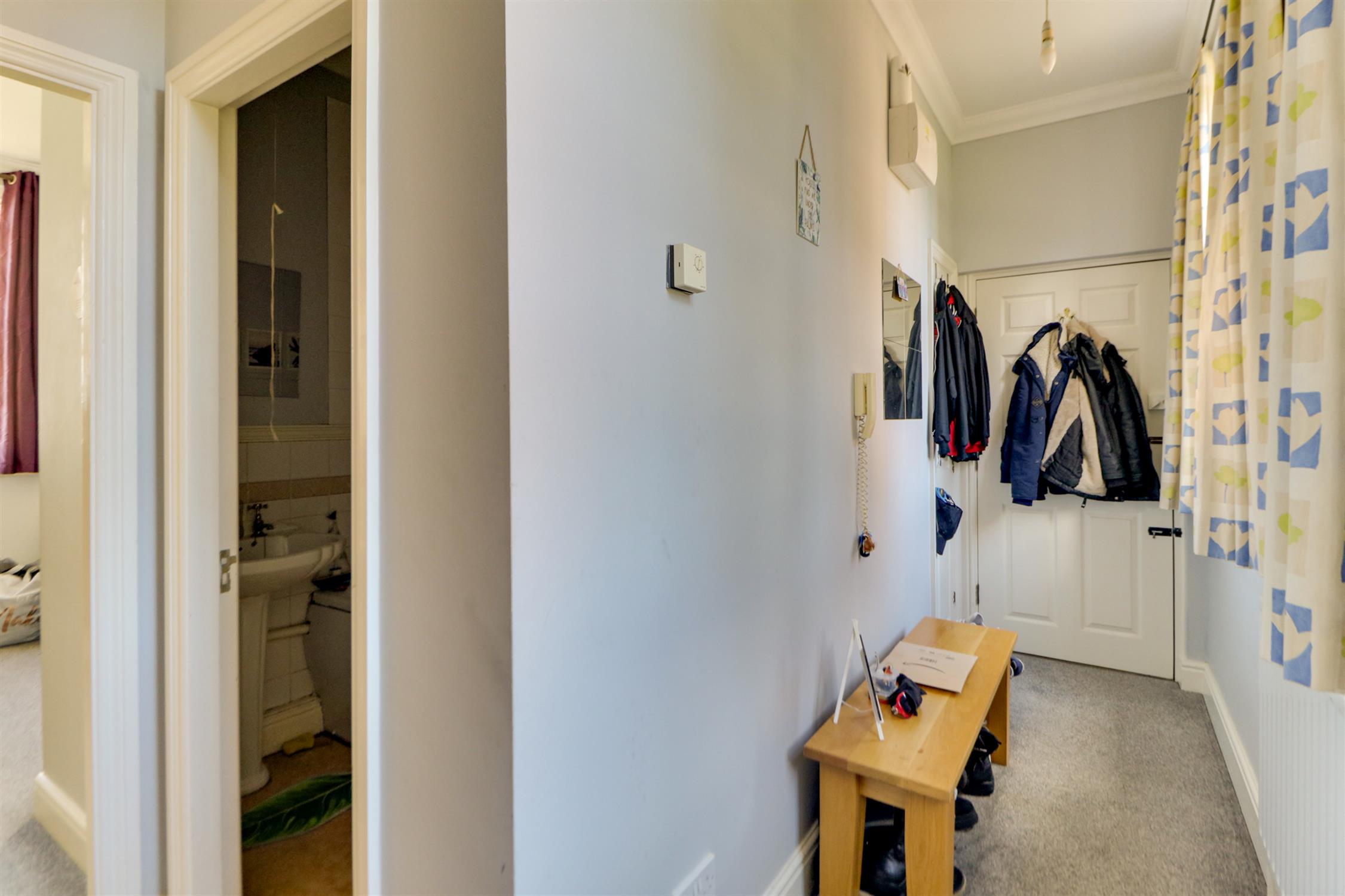 Smooth and coved ceiling, sash window, storage cupboards, radiator, intercom entry system, and doors into;