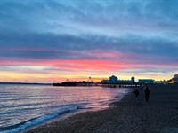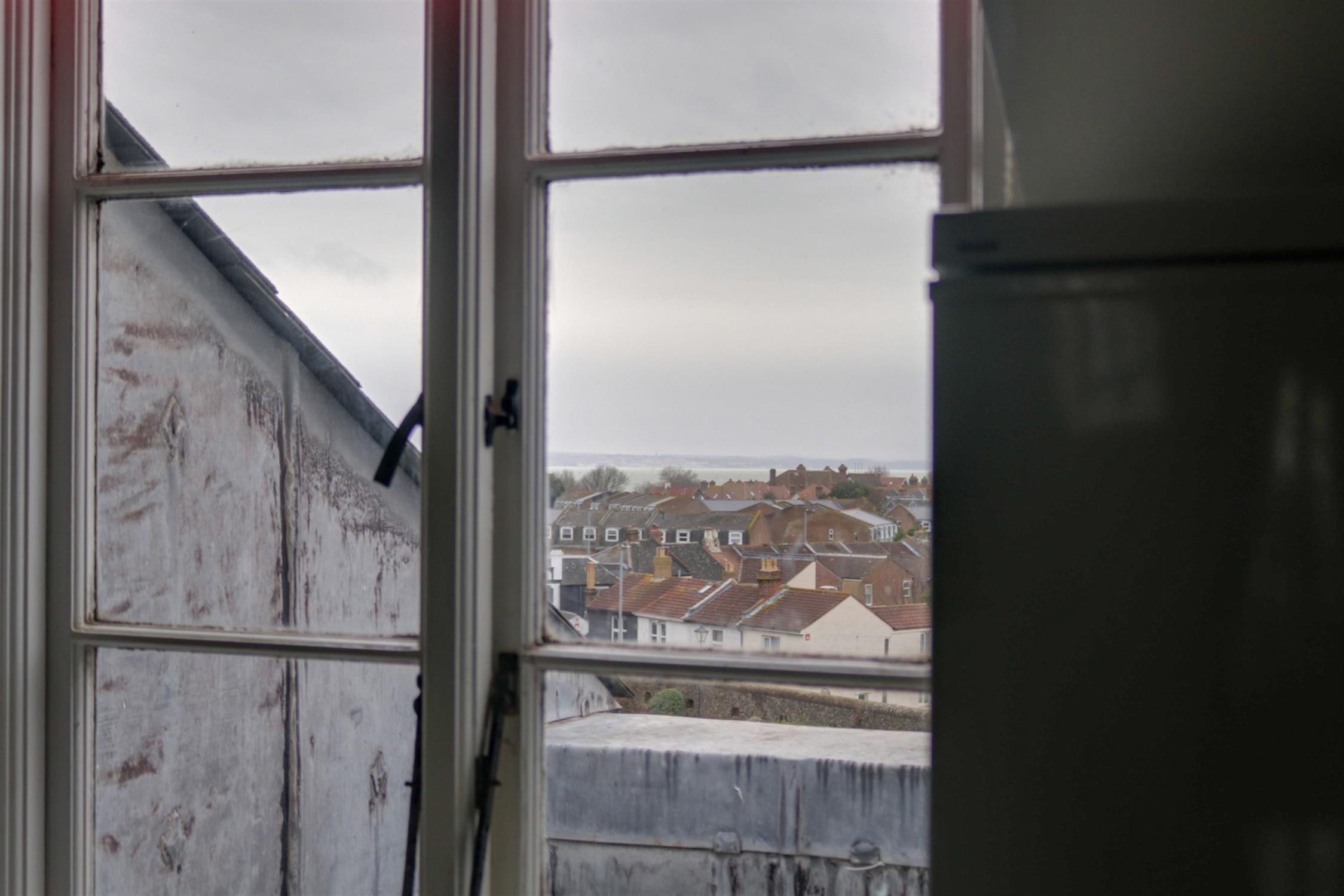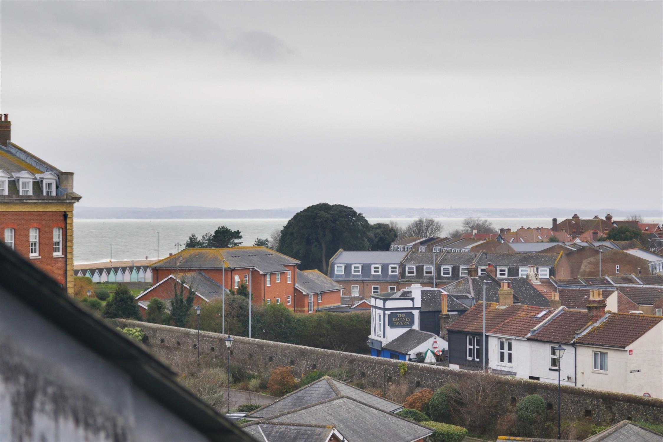 Smooth ceiling, window with views towards the Solent, range of wall and base mounted units with work surfaces over, inset stainless steel sink and drainer with mixer tap over, integrated electric oven and gas hob with extractor over, space for appliances, wall mounted Ideal boiler, part tiled walls, tiled floor.
